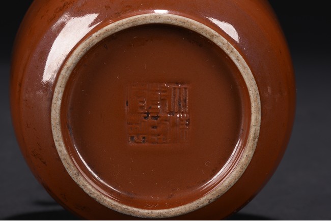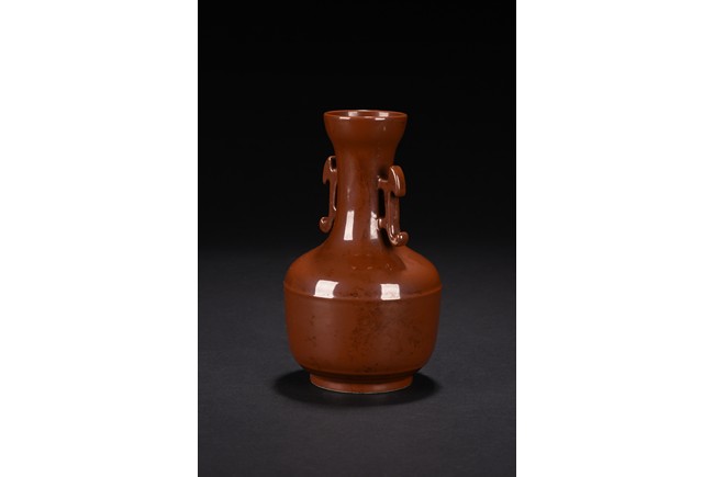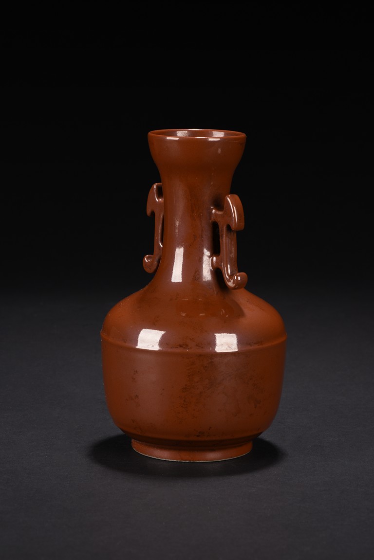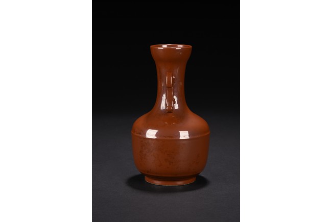 Rising from straight circular foot, the globular body rising to a long neck with flared mouth rim, the neck flanked by two lugs, overall suffused to the exterior with lustrous brown glaze. The base bears four character 'QIANLONG' mark. Qing Dynasty period.