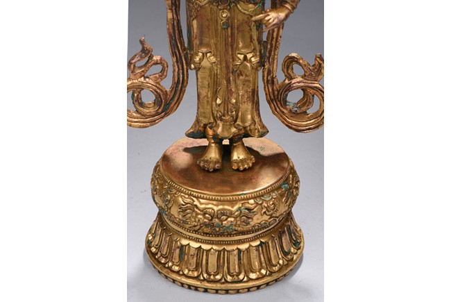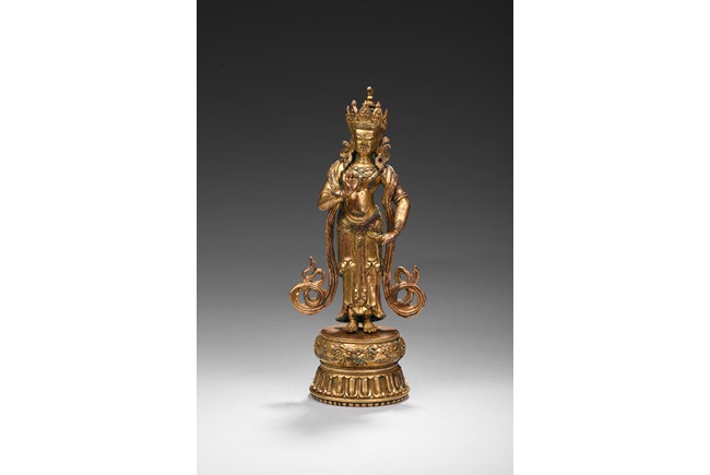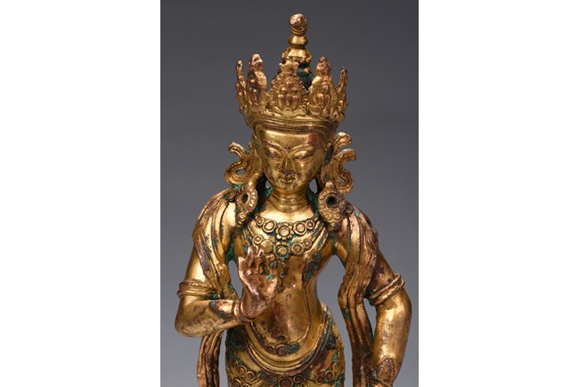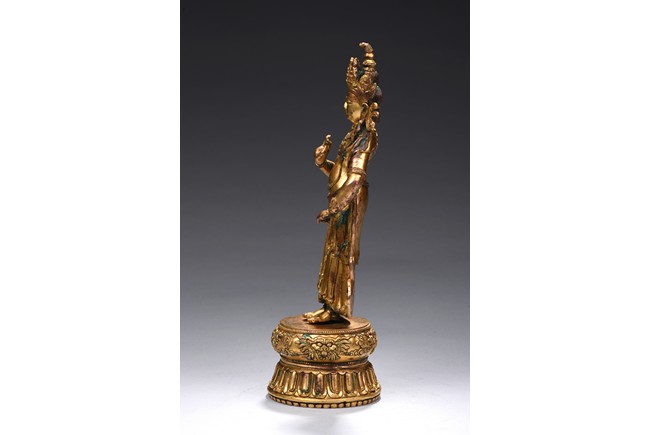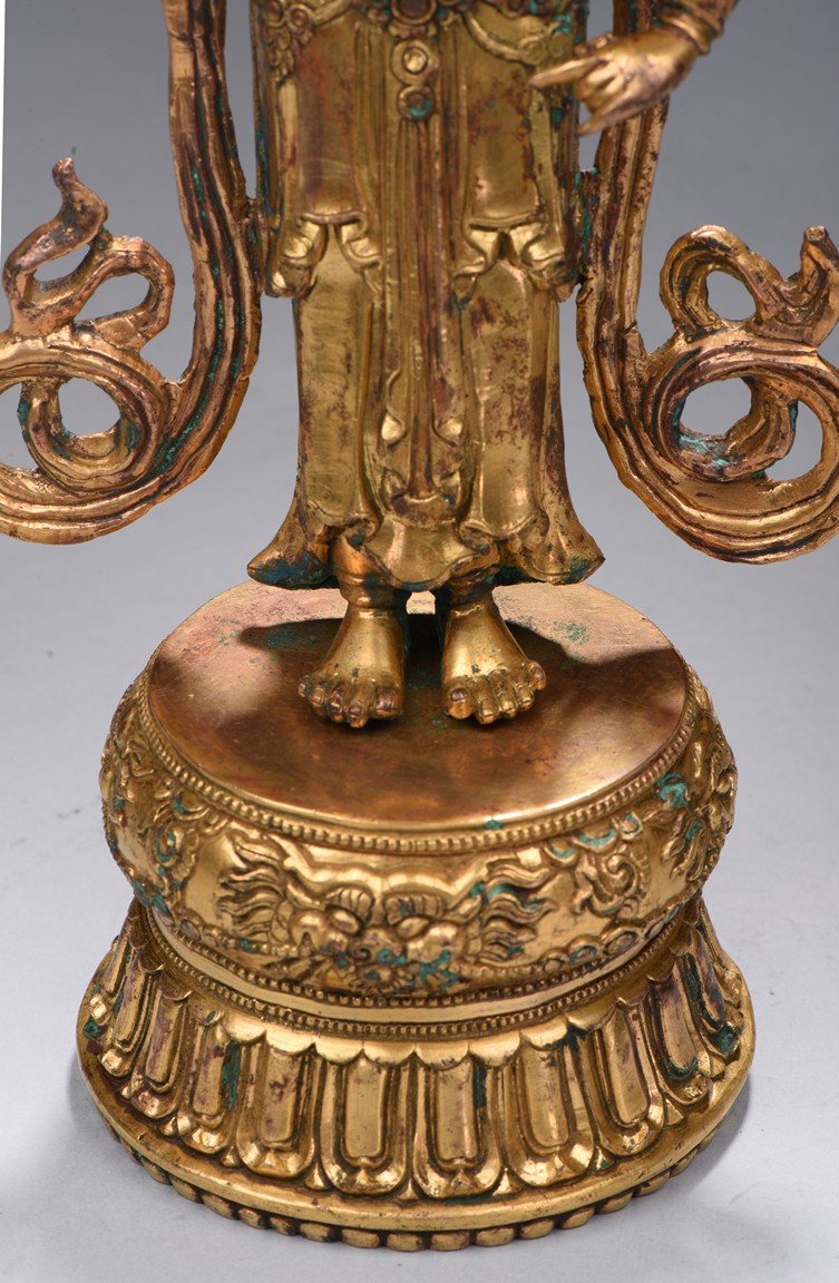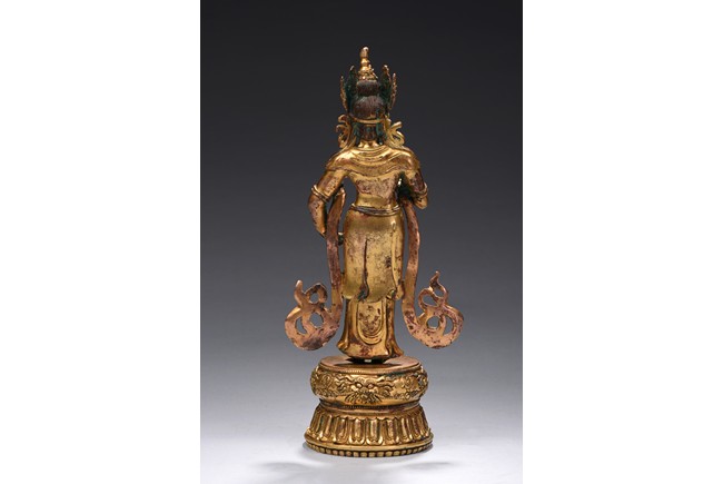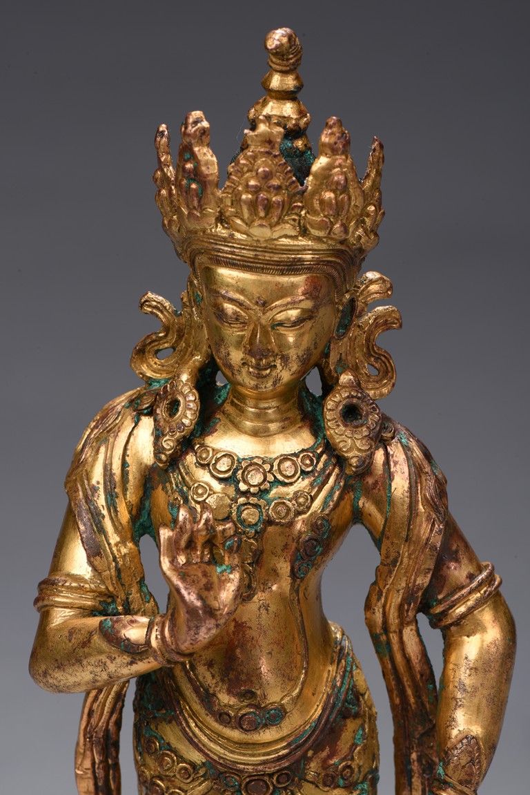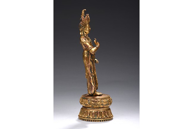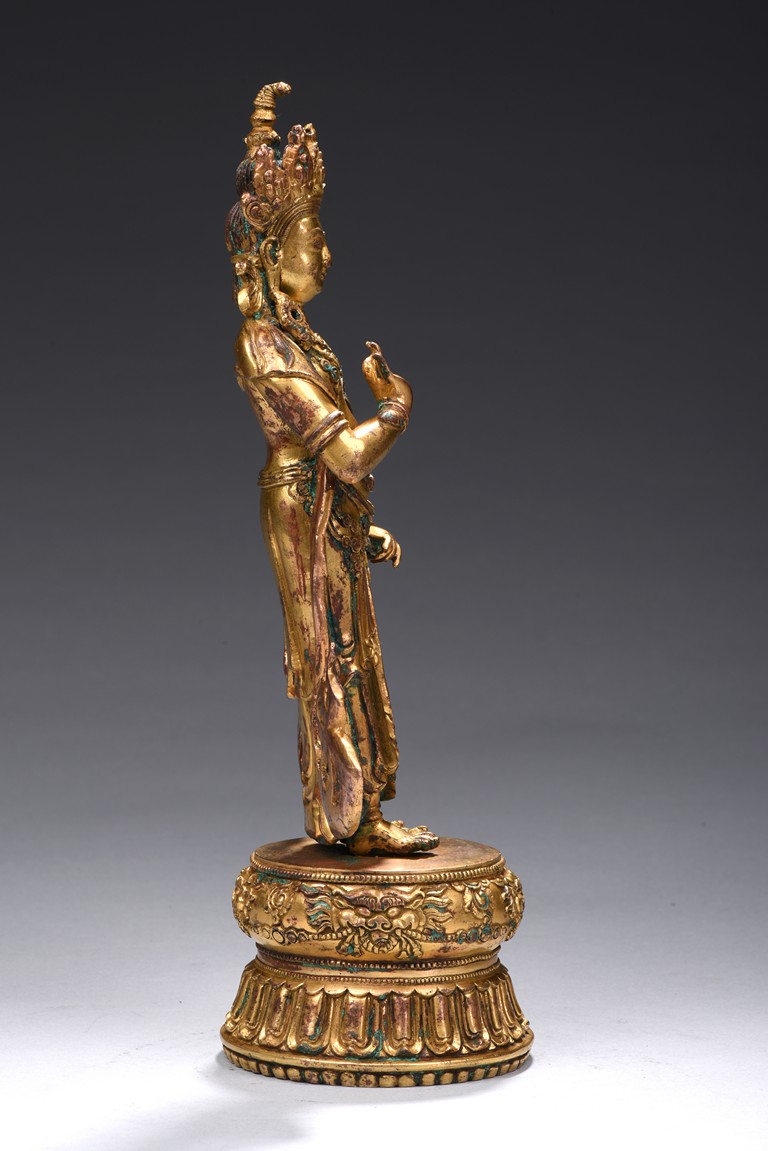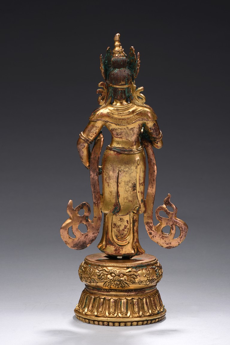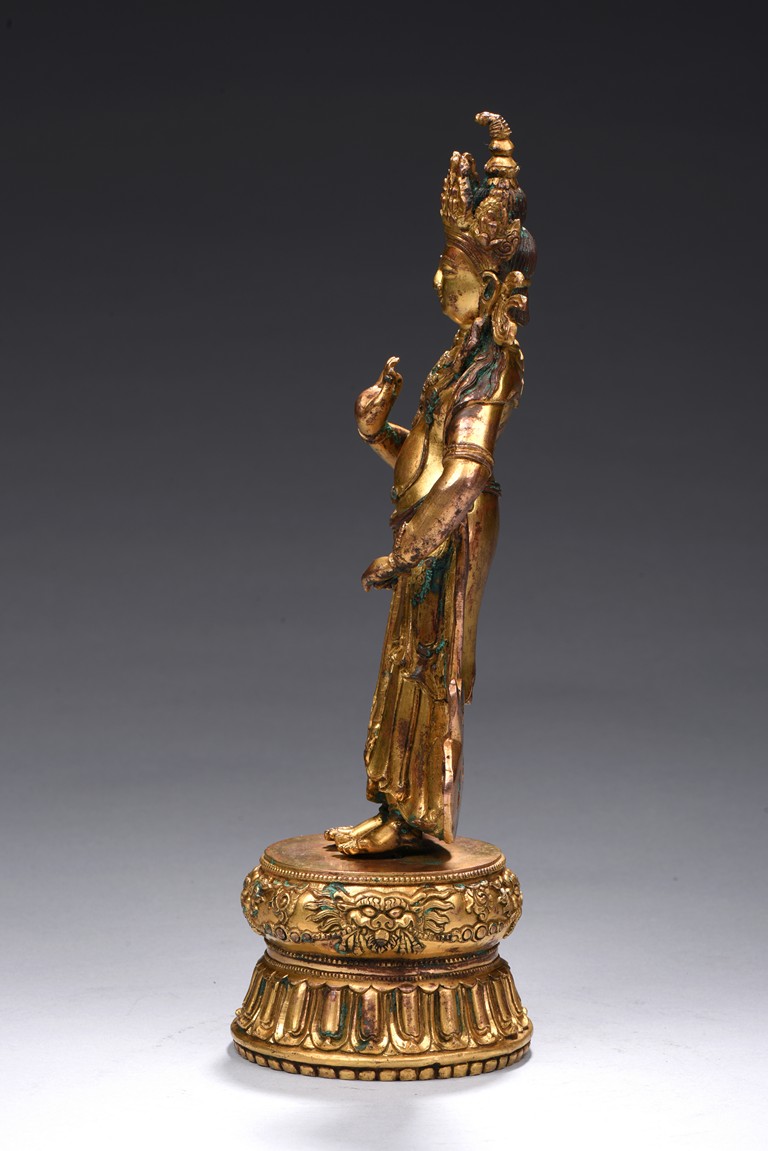 The bodhisattva is shown standing upon a double lotus throne, with ribbons over shoulder and flowing down, right hand raised in mutra, adorned with elaborate jewelry and wearing pointed crown, face with benign expression. Early Qing Dynasty period.