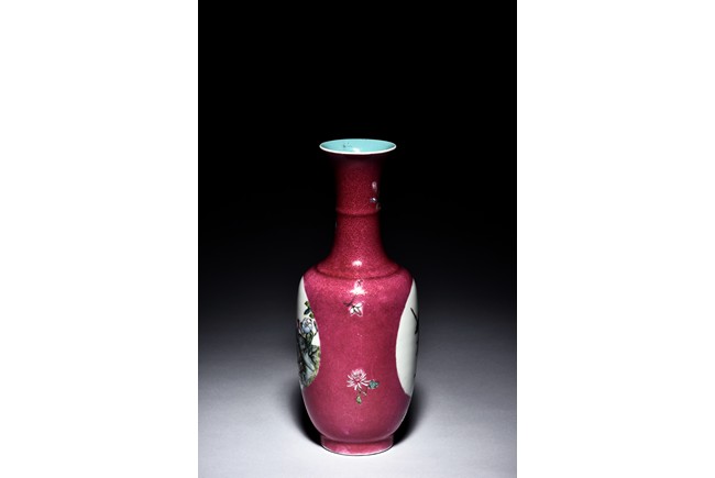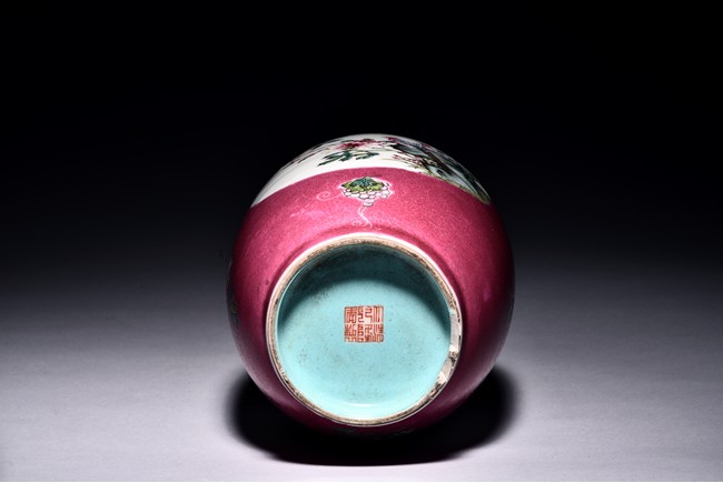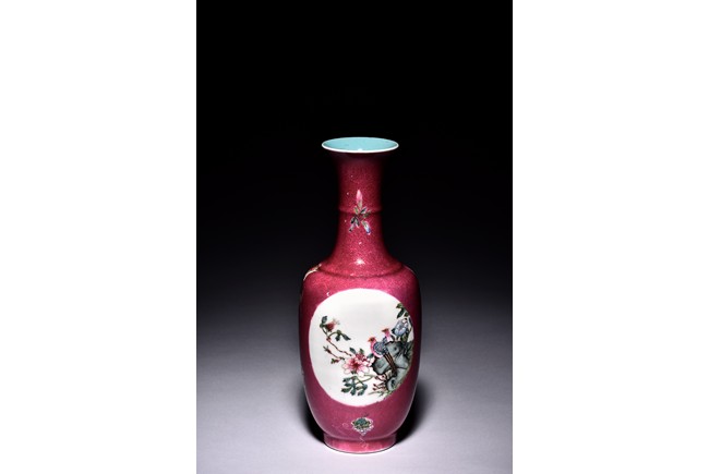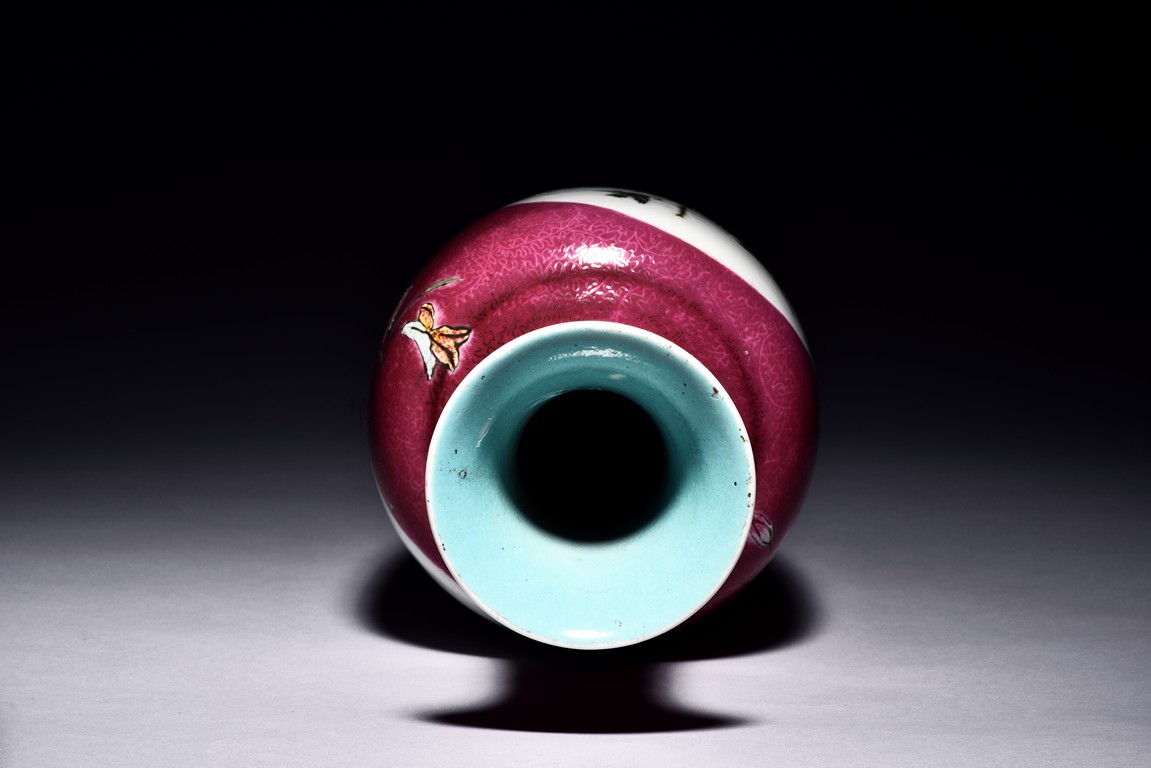 The vase decorated in two medallions enclosing scenes of birds and flowers against dense sgraffiato red glazed ground. Bottom with apocryphal Qianlong mark. Republic period.