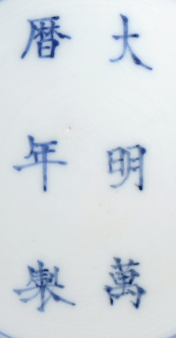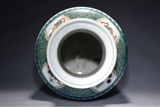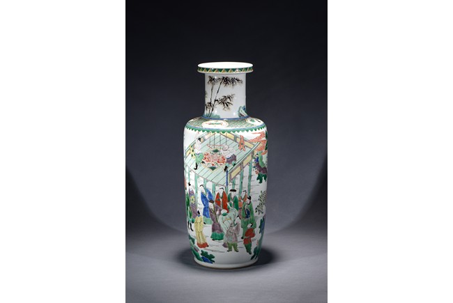 Finely enamelled with a continuous scene of figures watching a boxing match on a stage, the other side decorated with various trees issuing from rockwork base through auspicious clouds, the neck with bamboo plants. The base with six character WANLI mark. Qing Dynasty Kangxi period.