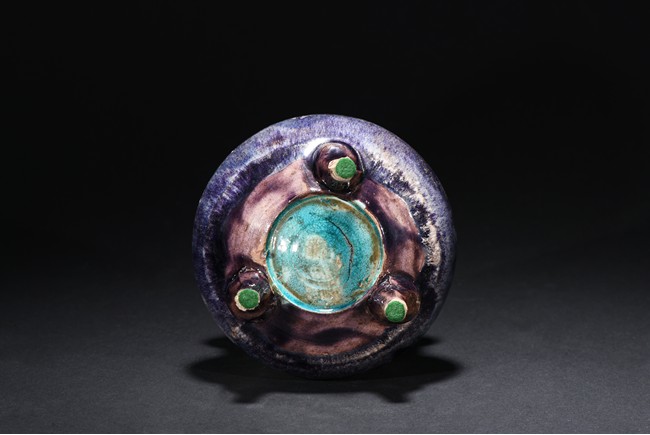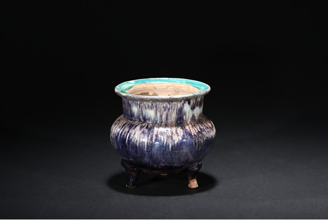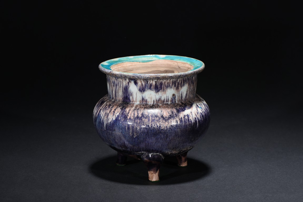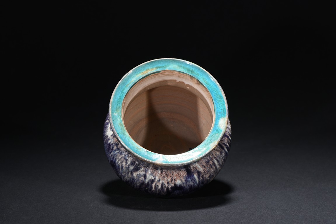 Supported on three splayed legs, the bulbous body and straight neck topped with a flat mouth, decorated with an aubergine glaze and splashed with brown glaze, the mouth glazed in turquoise. Ming Dynasty period.