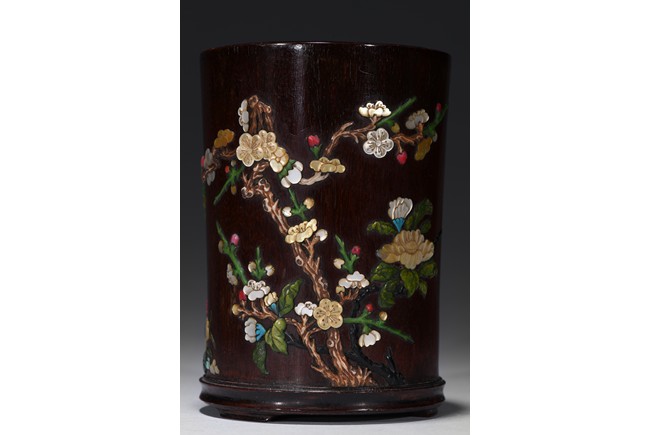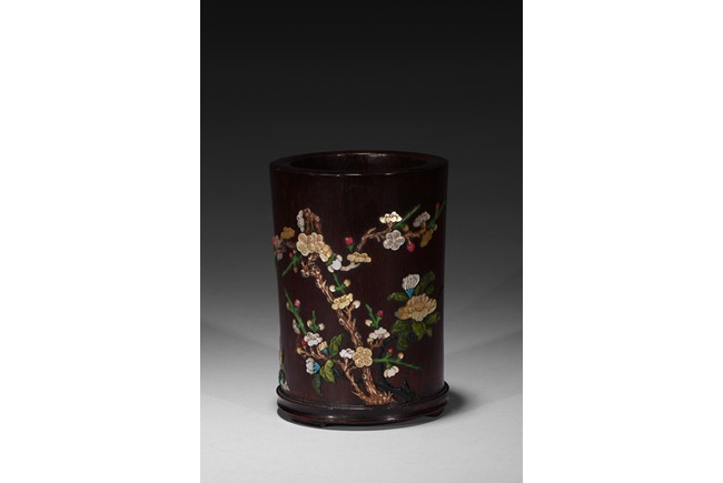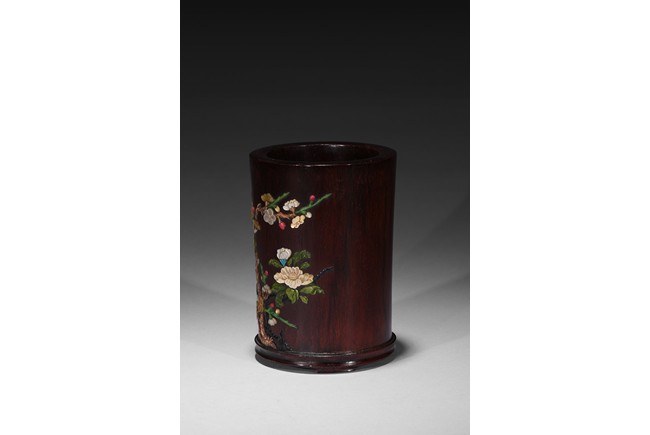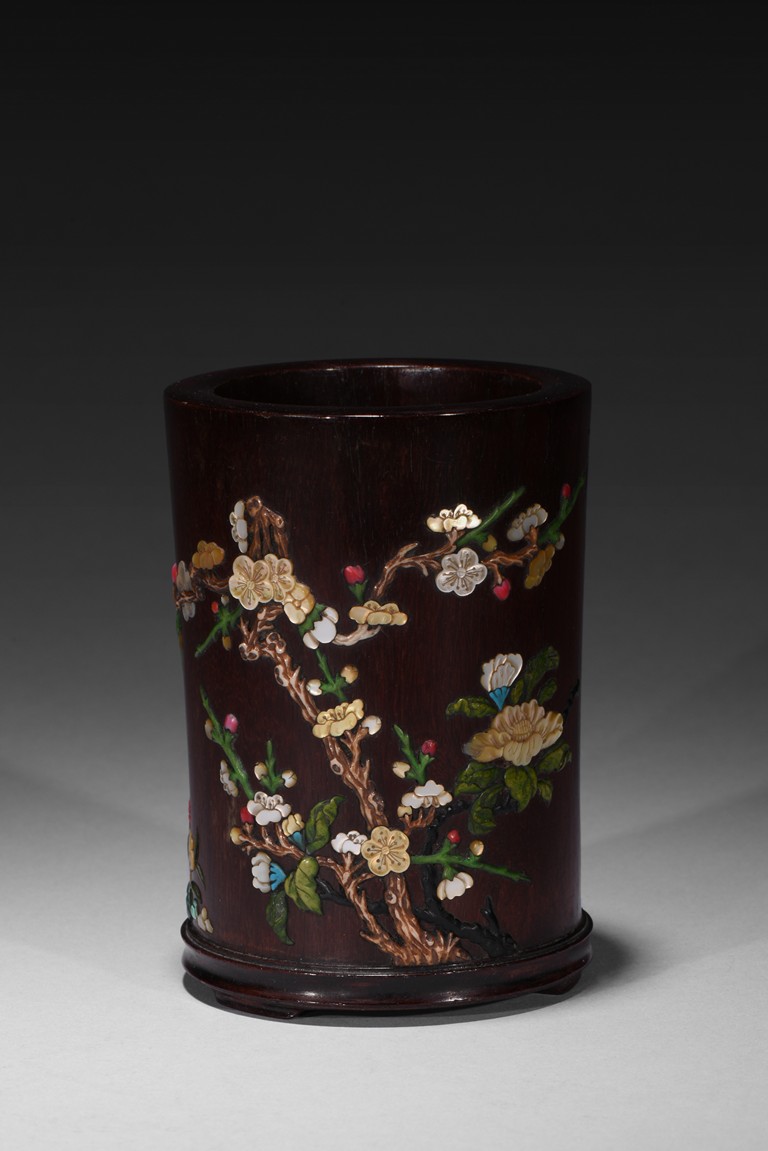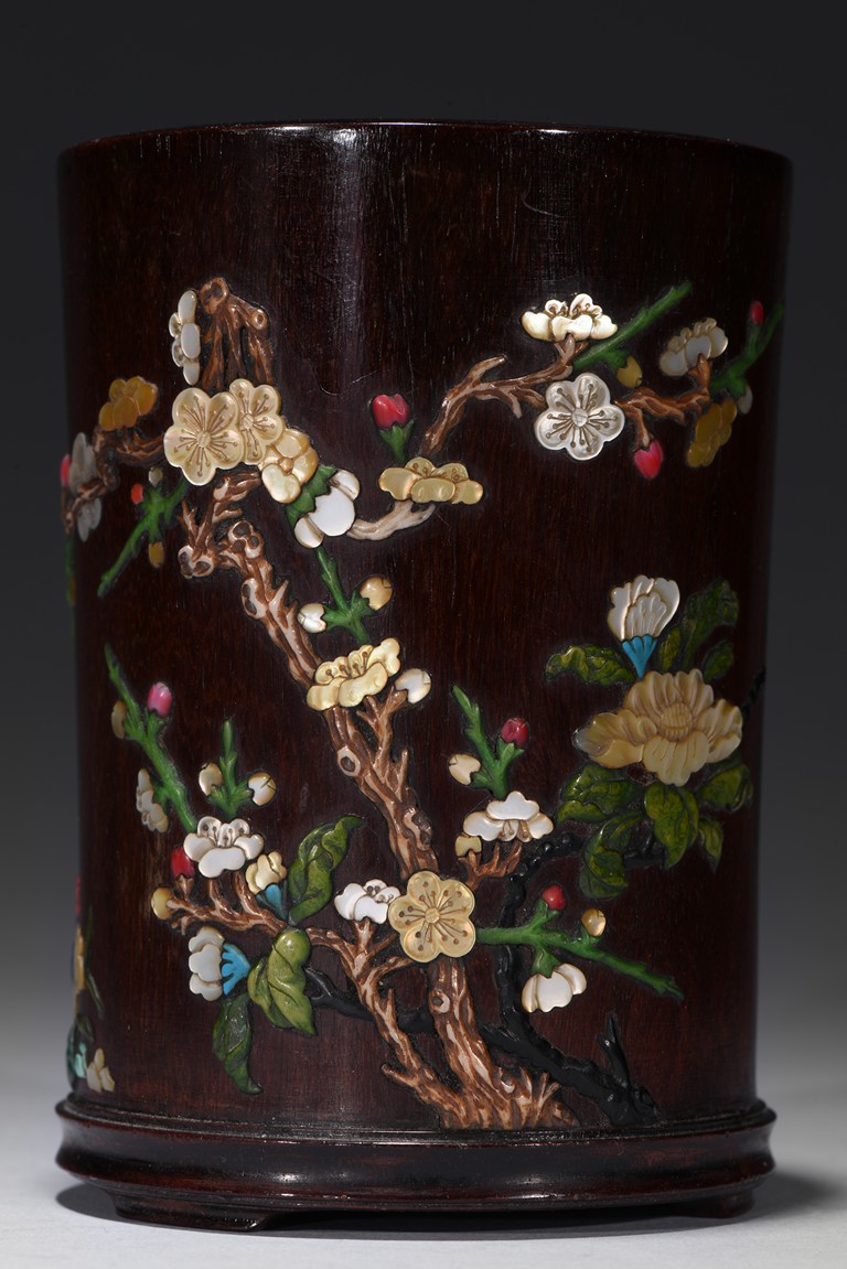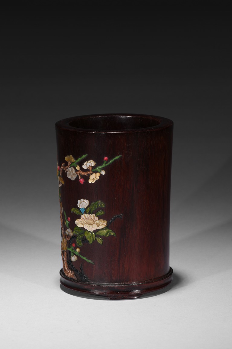 Of cylindrical form supported on three low feet, the sides finely inlaid with wood, hardstones and mother-of-pearl depicting two large prunus branches in full blossom, entwined with leafy stem of flowering peony. Qing Dynasty Kangxi period.