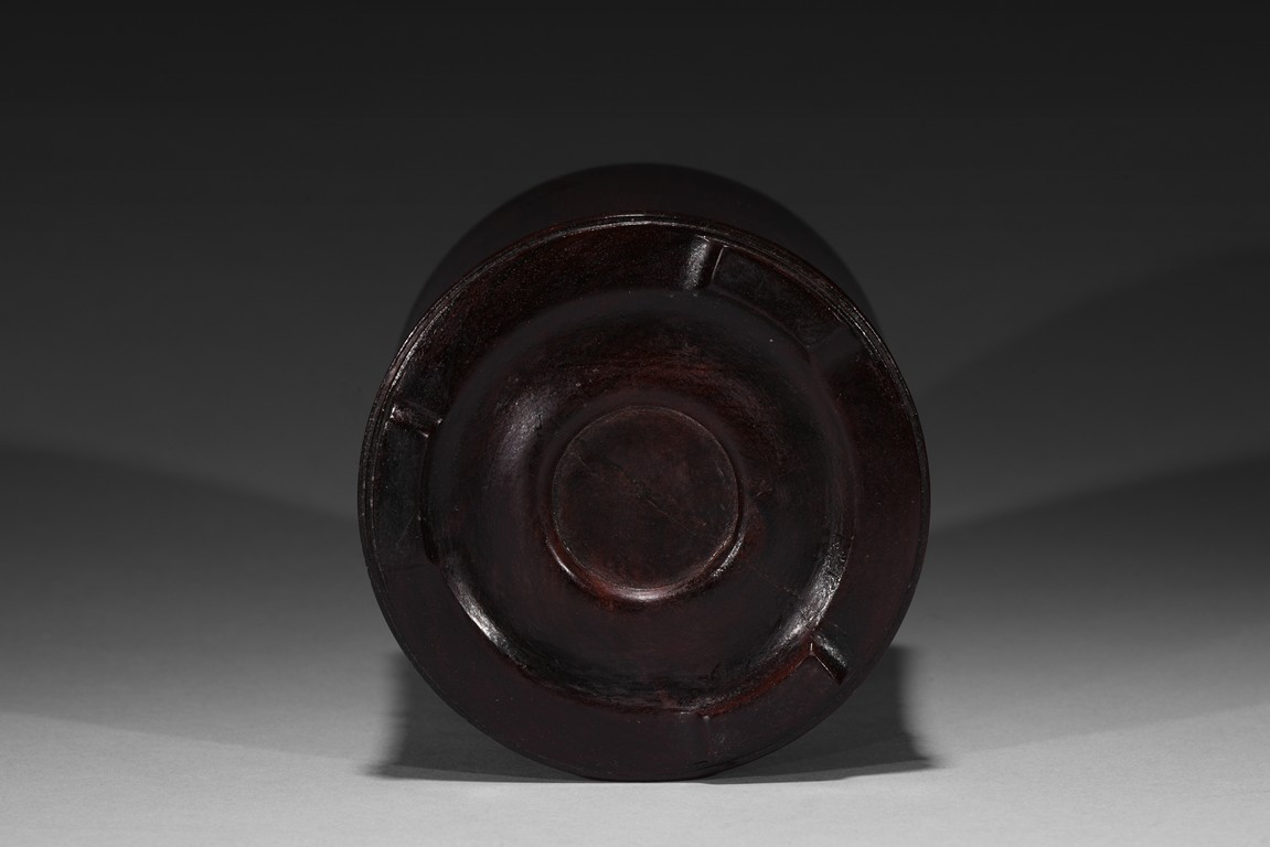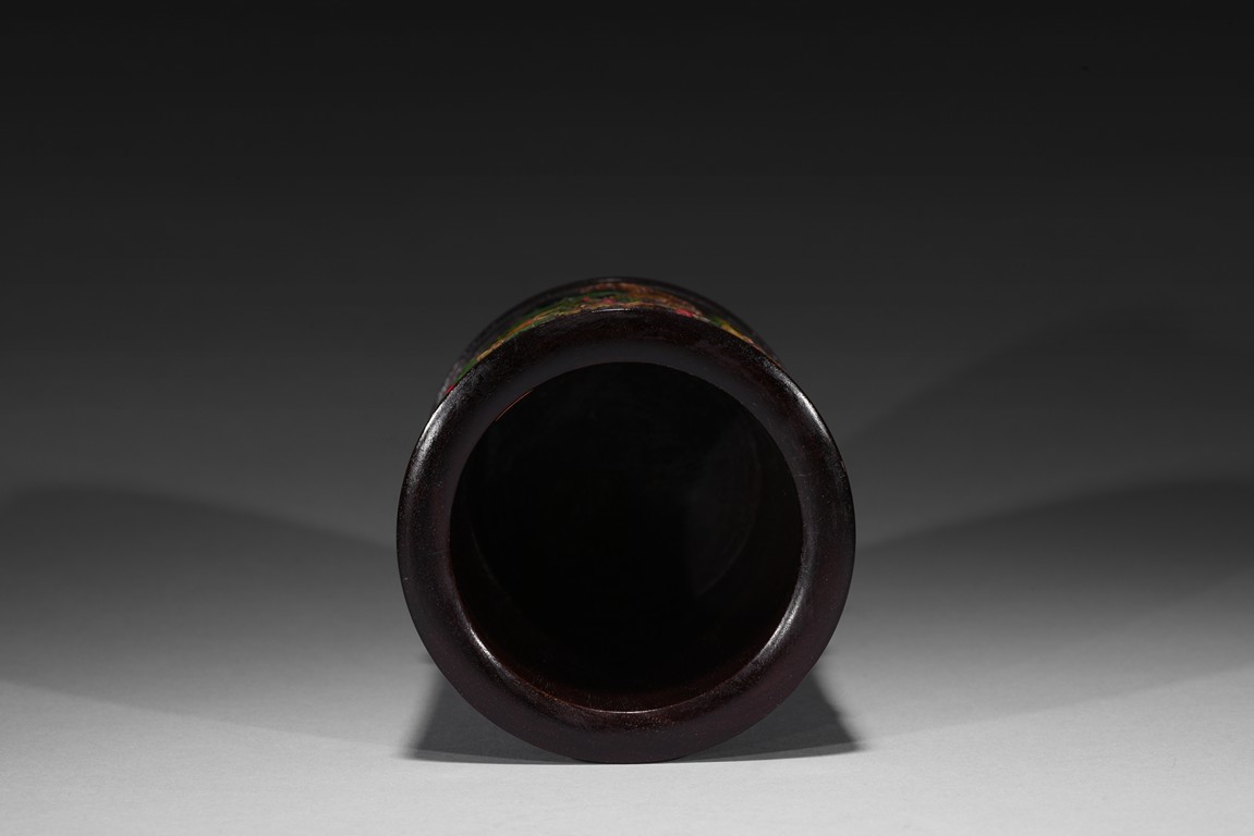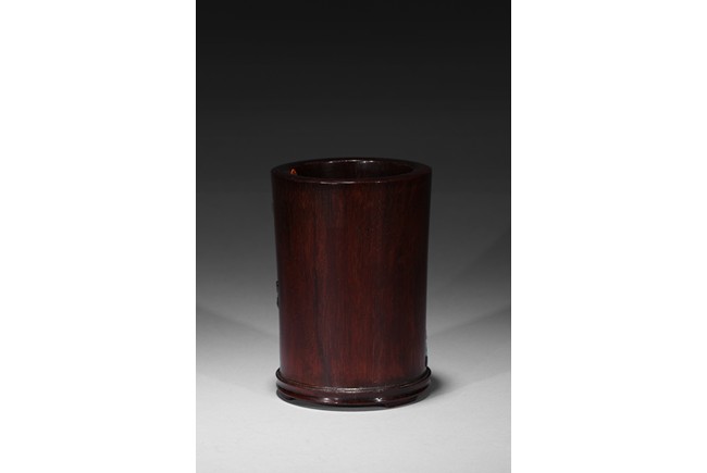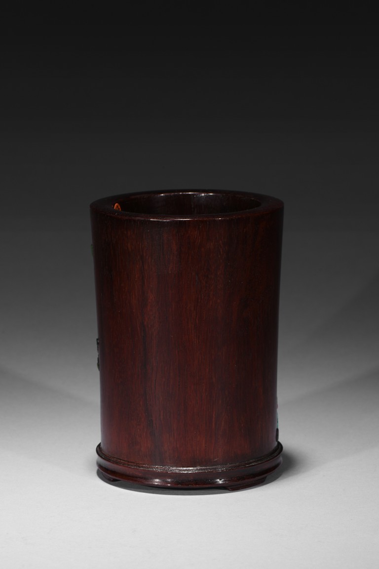 可比較一件類似稍大紫檀嵌百寶筆筒(高 15.5公分), 售於香港蘇富比2005年10月秋拍, 拍品號470