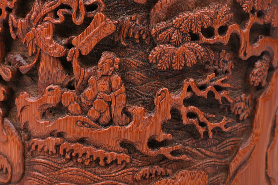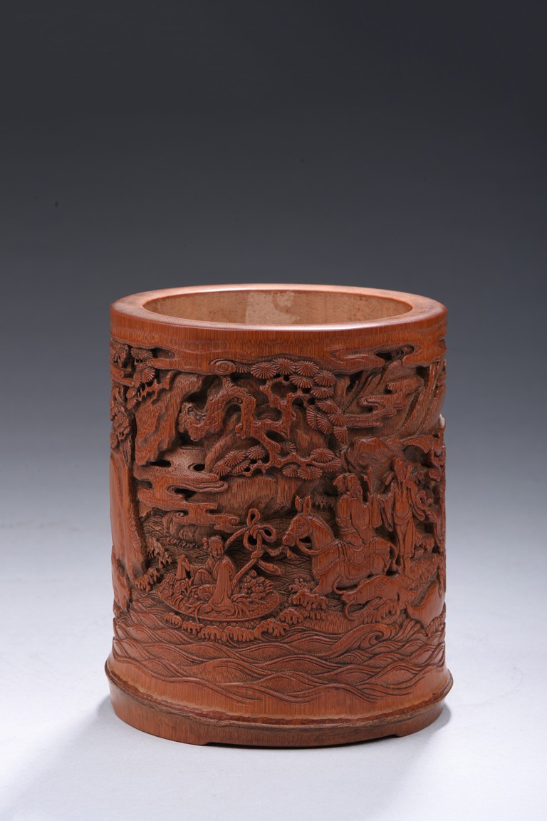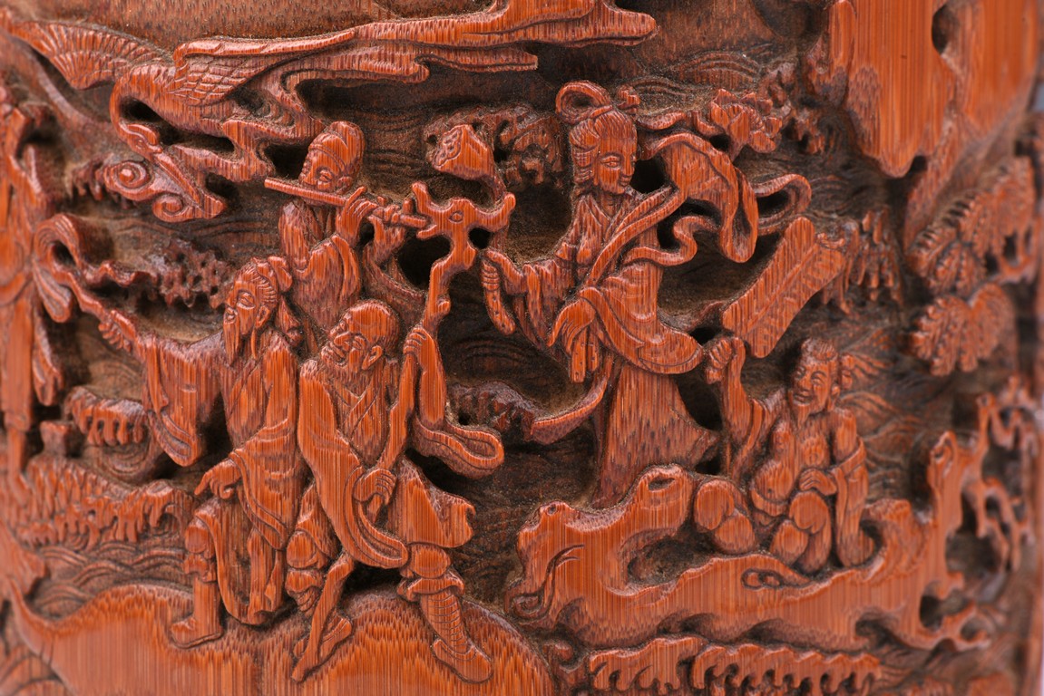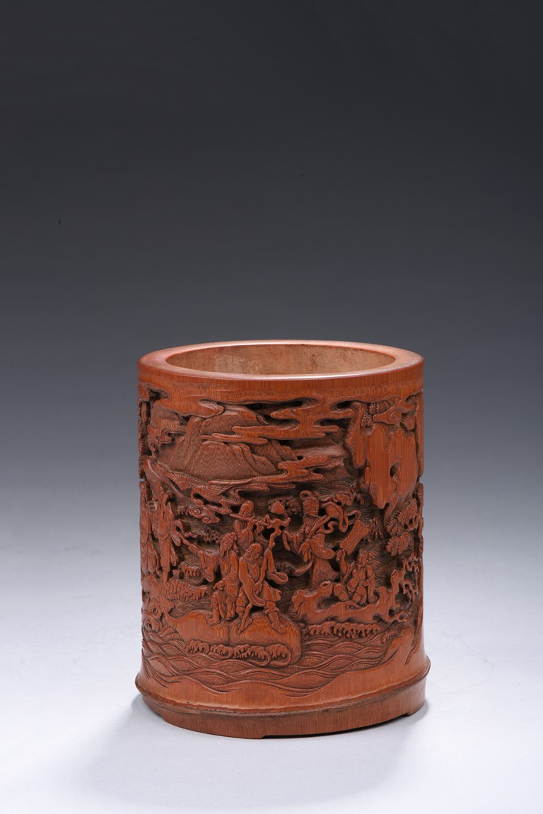 Of cylindrical form resting on three short feet, the exterior well carved in varying levels of relief with a continuous figural landscape depicting eight immortals portrayed to cross the turbulent sea, three standing on a raft holding long staff in hands or playing the flute, one standing on a large dragon and one seated on a running donkey, one lady seated on flower pond and one young girl seated on tree branch-shaped raft, the riverscape accentuated with a mountainous background and overhanging pine trees issuing from the cliffs, the patina of a slightly reddish-brown colour. Republic period.