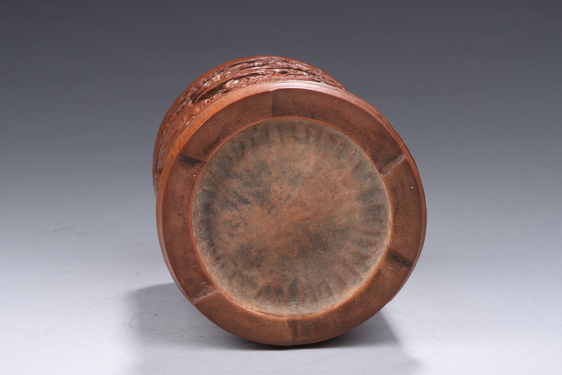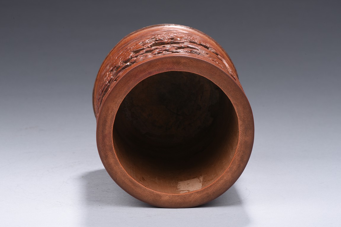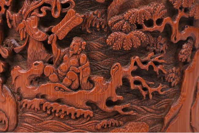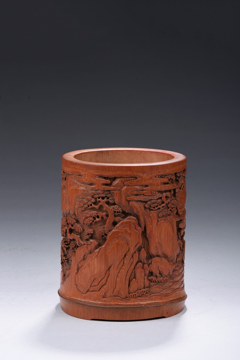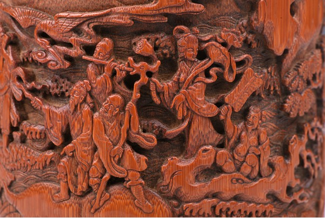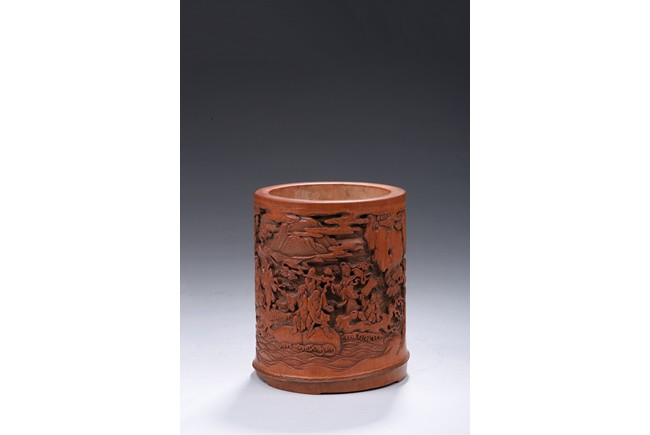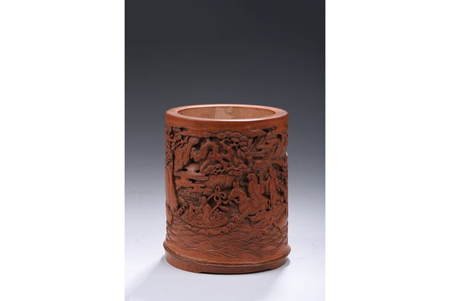 Of cylindrical form resting on three short feet, the exterior well carved in varying levels of relief with a continuous figural landscape depicting eight immortals portrayed to cross the turbulent sea, three standing on a raft holding long staff in hands or playing the flute, one standing on a large dragon and one seated on a running donkey, one lady seated on flower pond and one young girl seated on tree branch-shaped raft, the riverscape accentuated with a mountainous background and overhanging pine trees issuing from the cliffs, the patina of a slightly reddish-brown colour. Republic period.