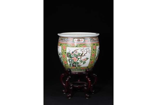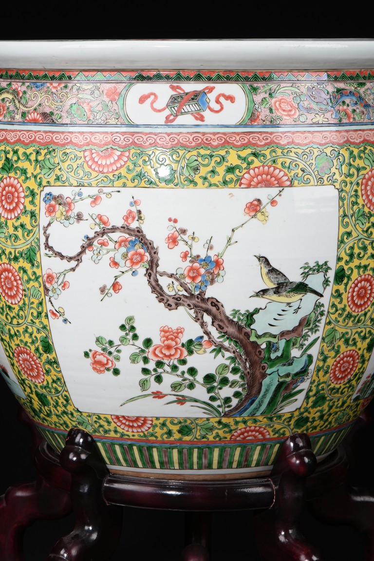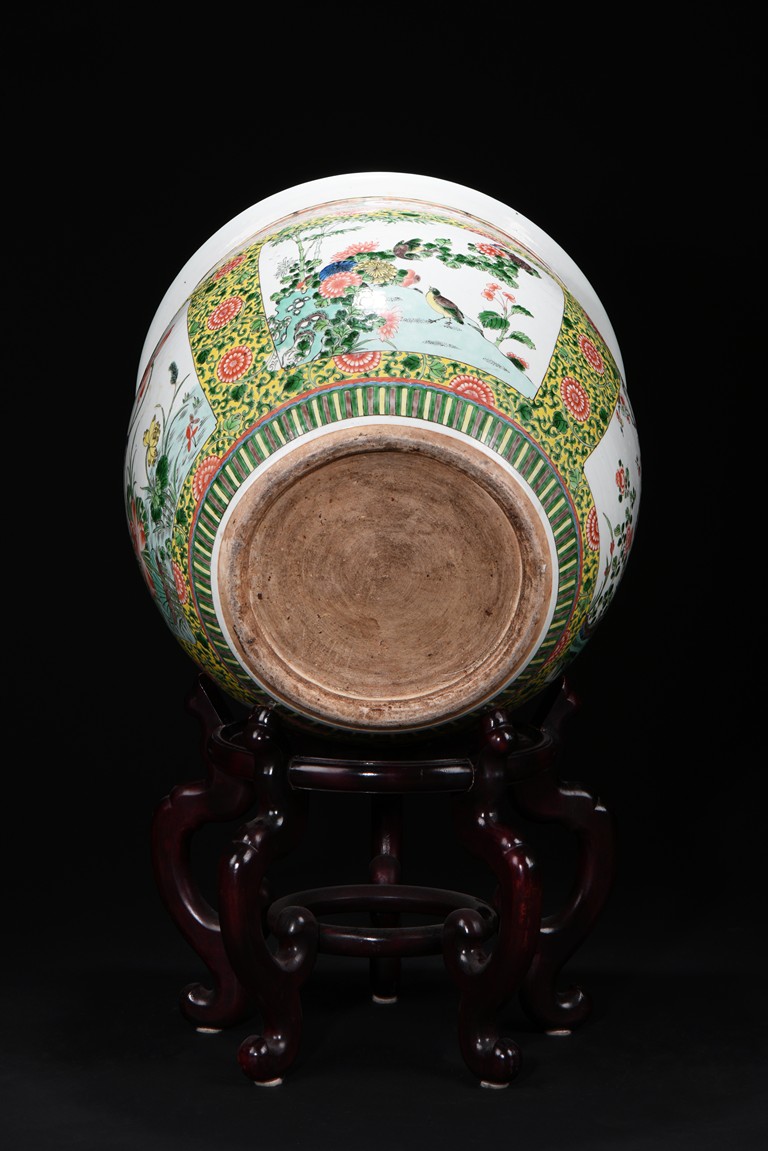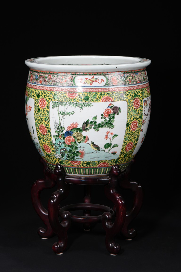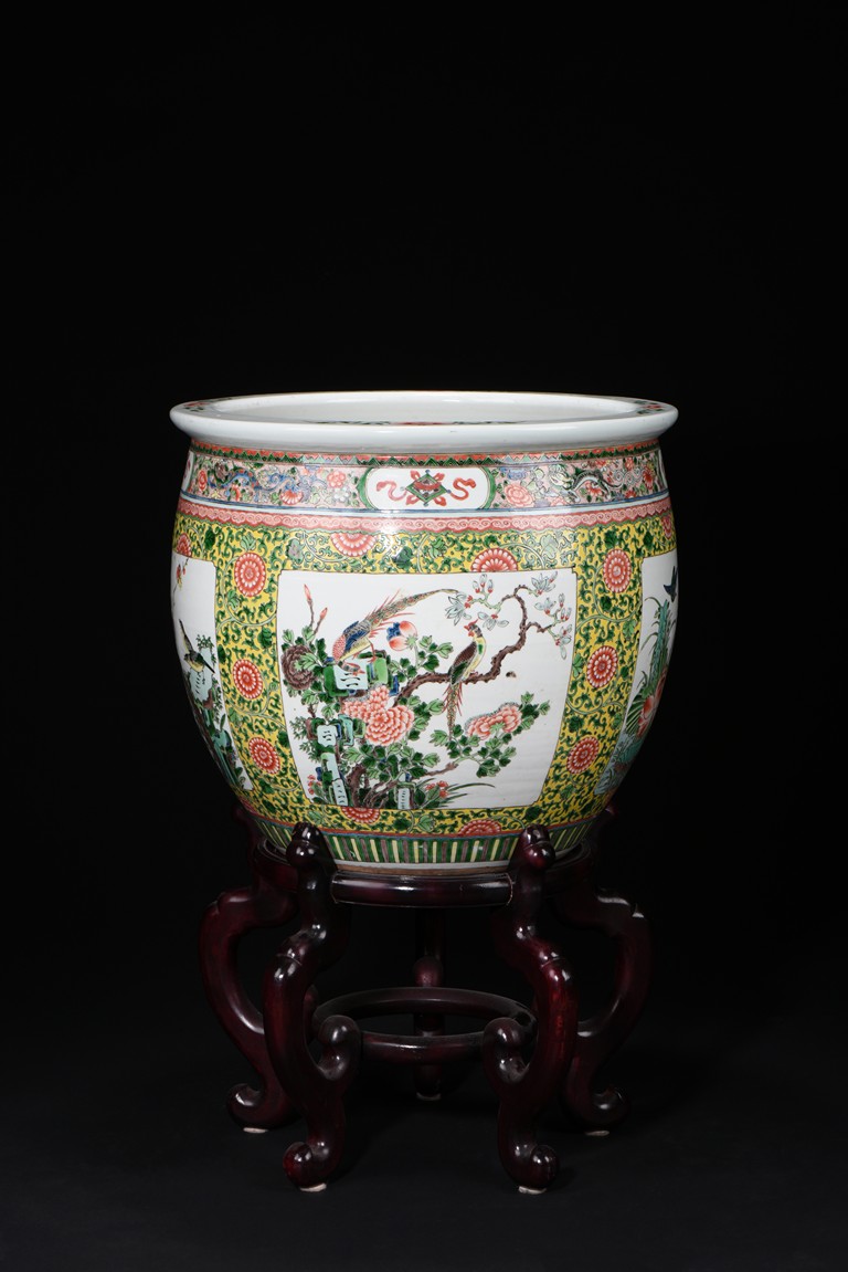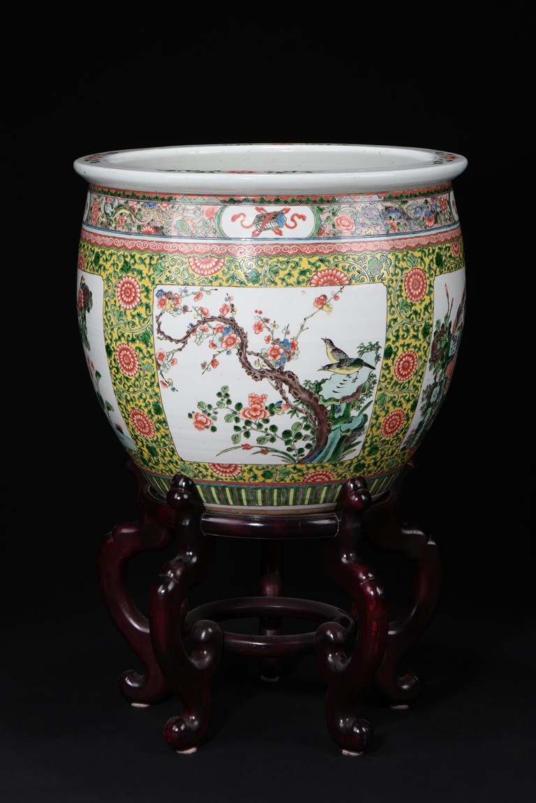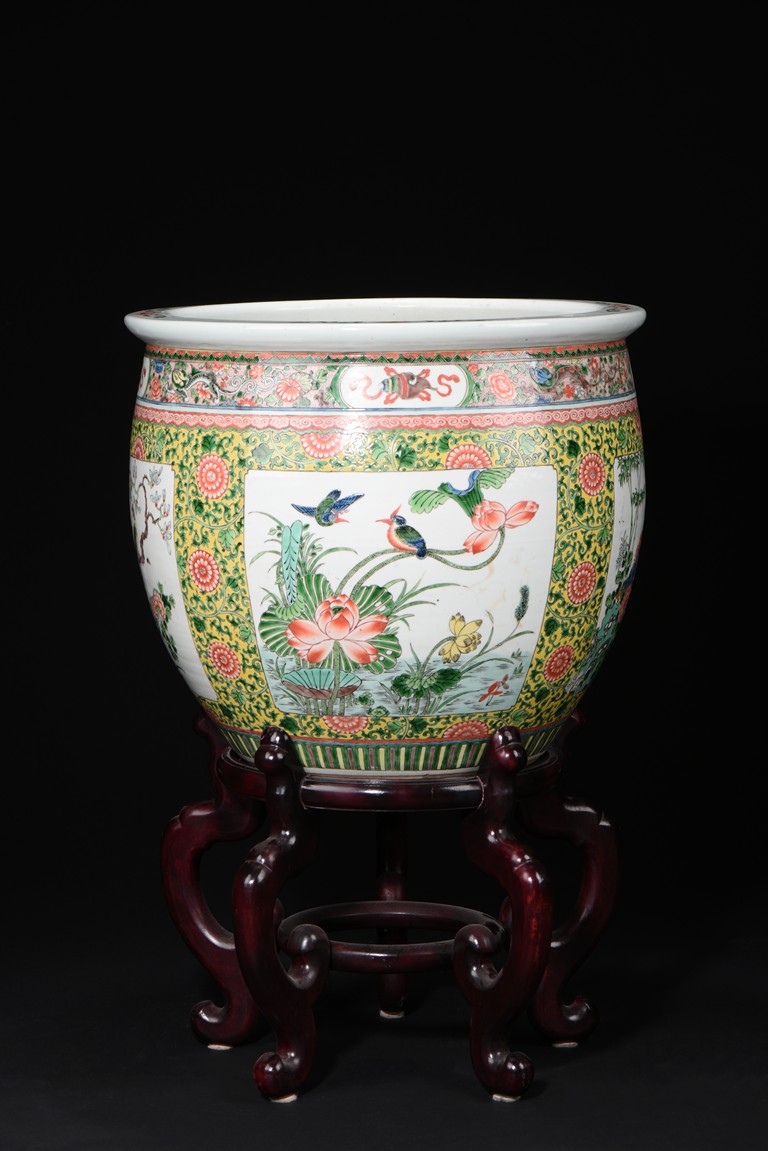 The body elaborately painted with circular and fan-shaped panels enclosing birds and flowers, interspersed with scattered flowers and butterflies. With carved rosewood stand. Qing Dynasty period.