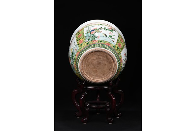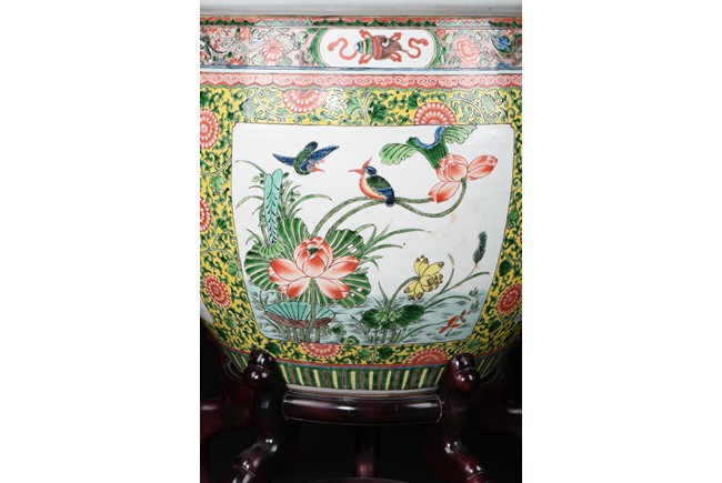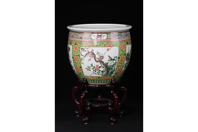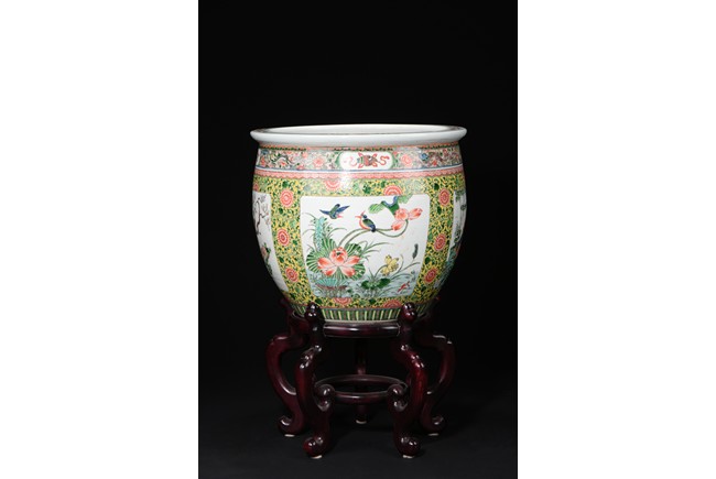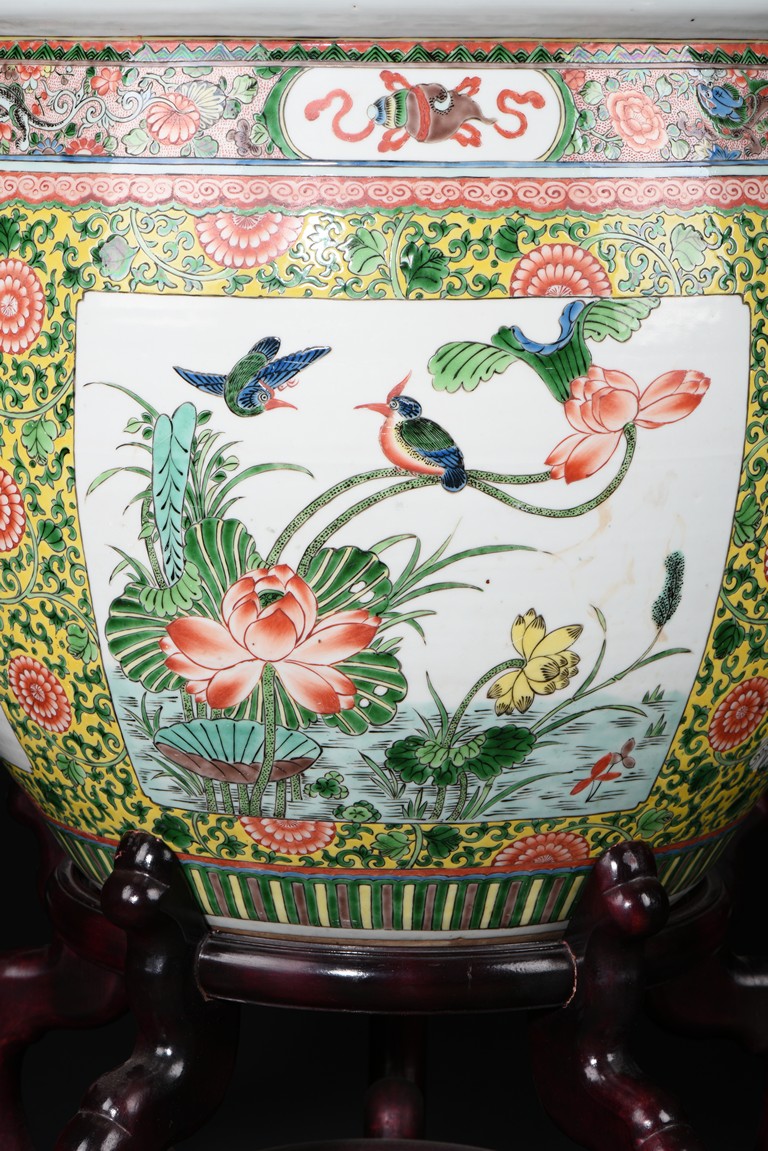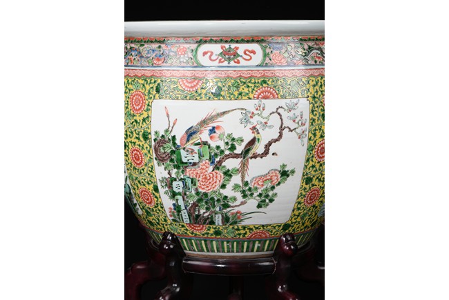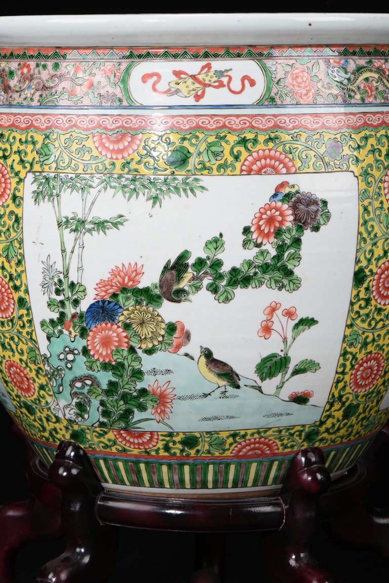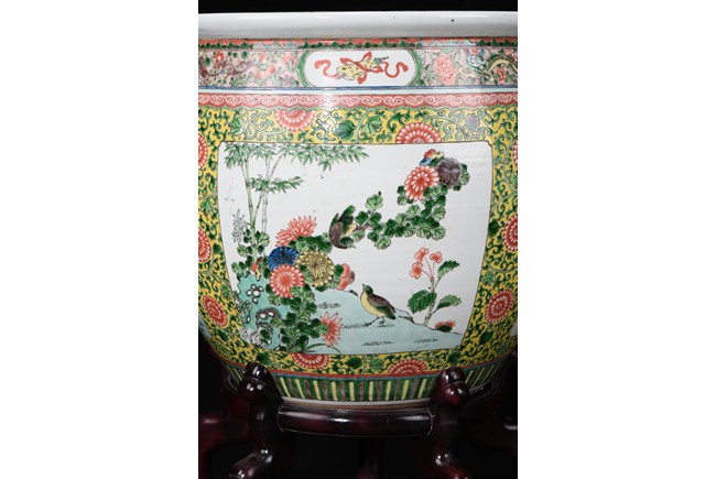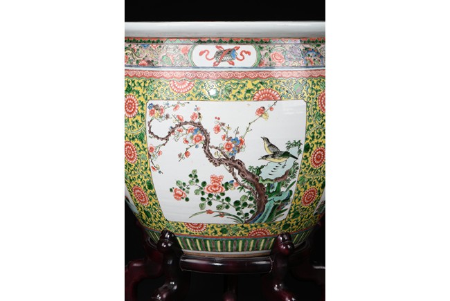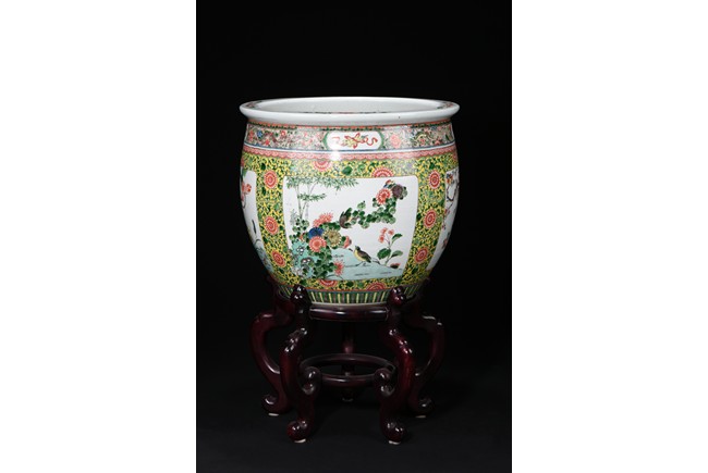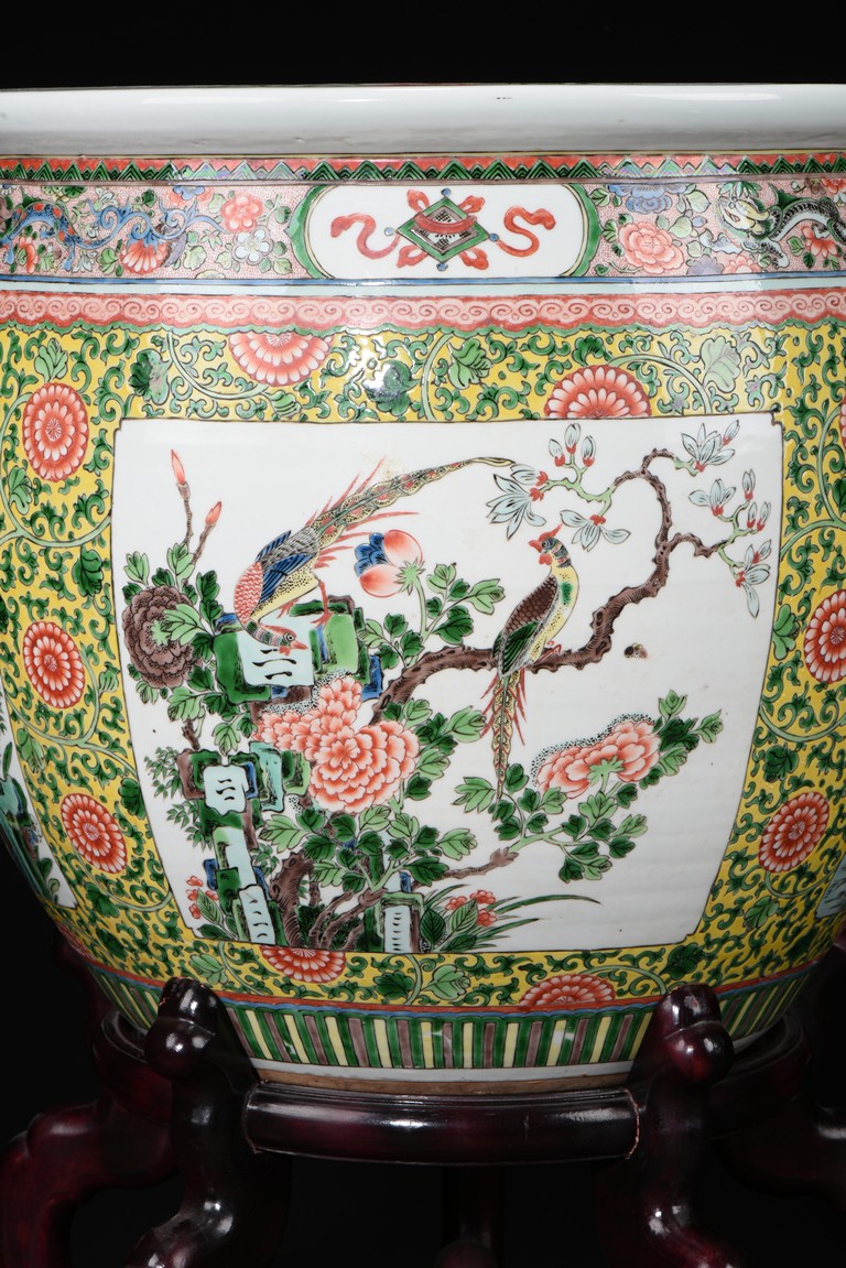 The body elaborately painted with circular and fan-shaped panels enclosing birds and flowers, interspersed with scattered flowers and butterflies. With carved rosewood stand. Qing Dynasty period.