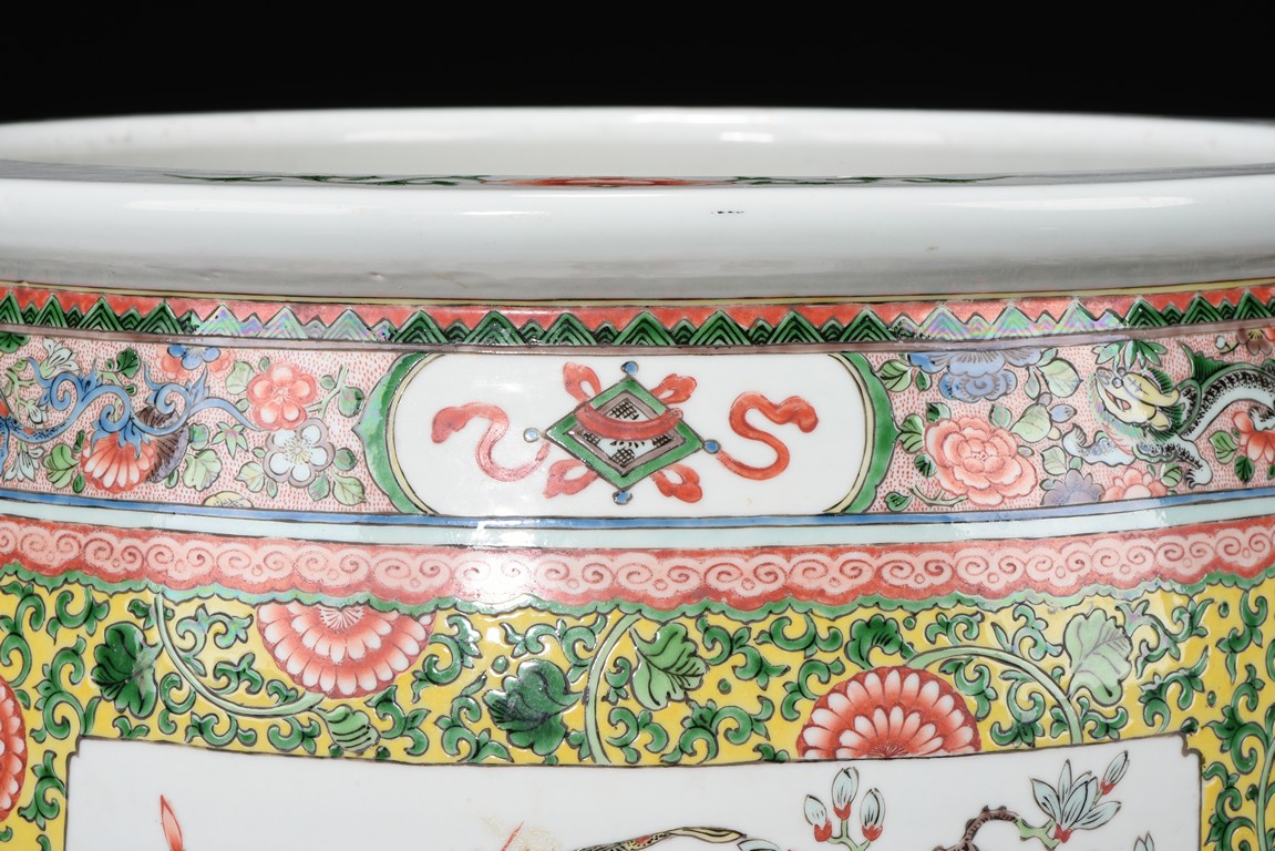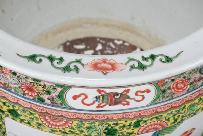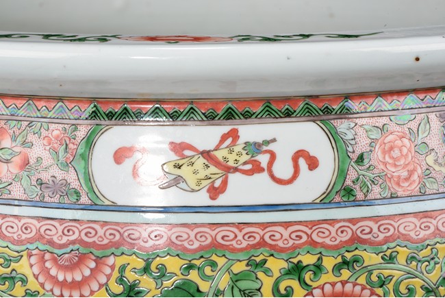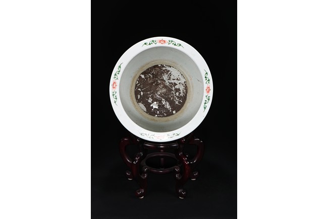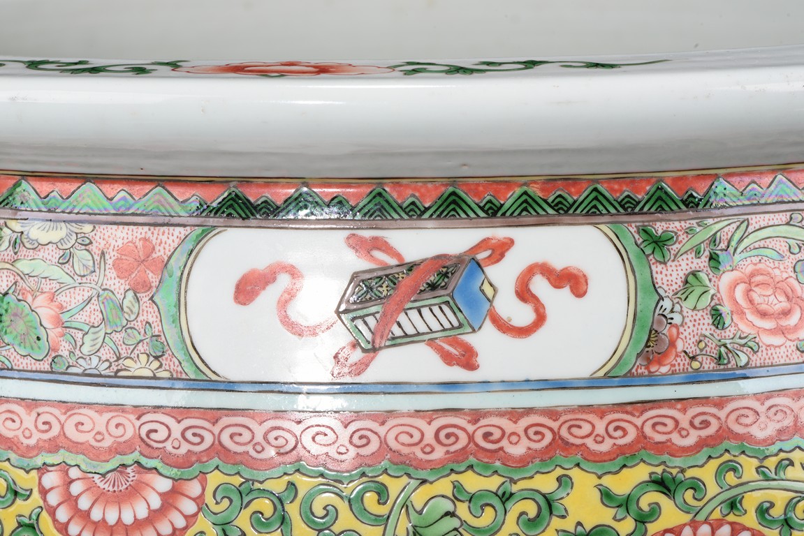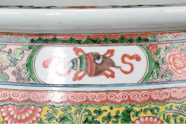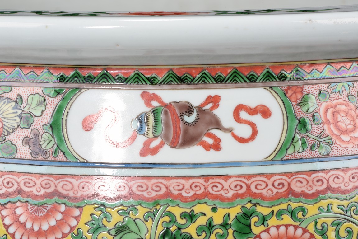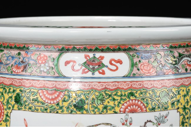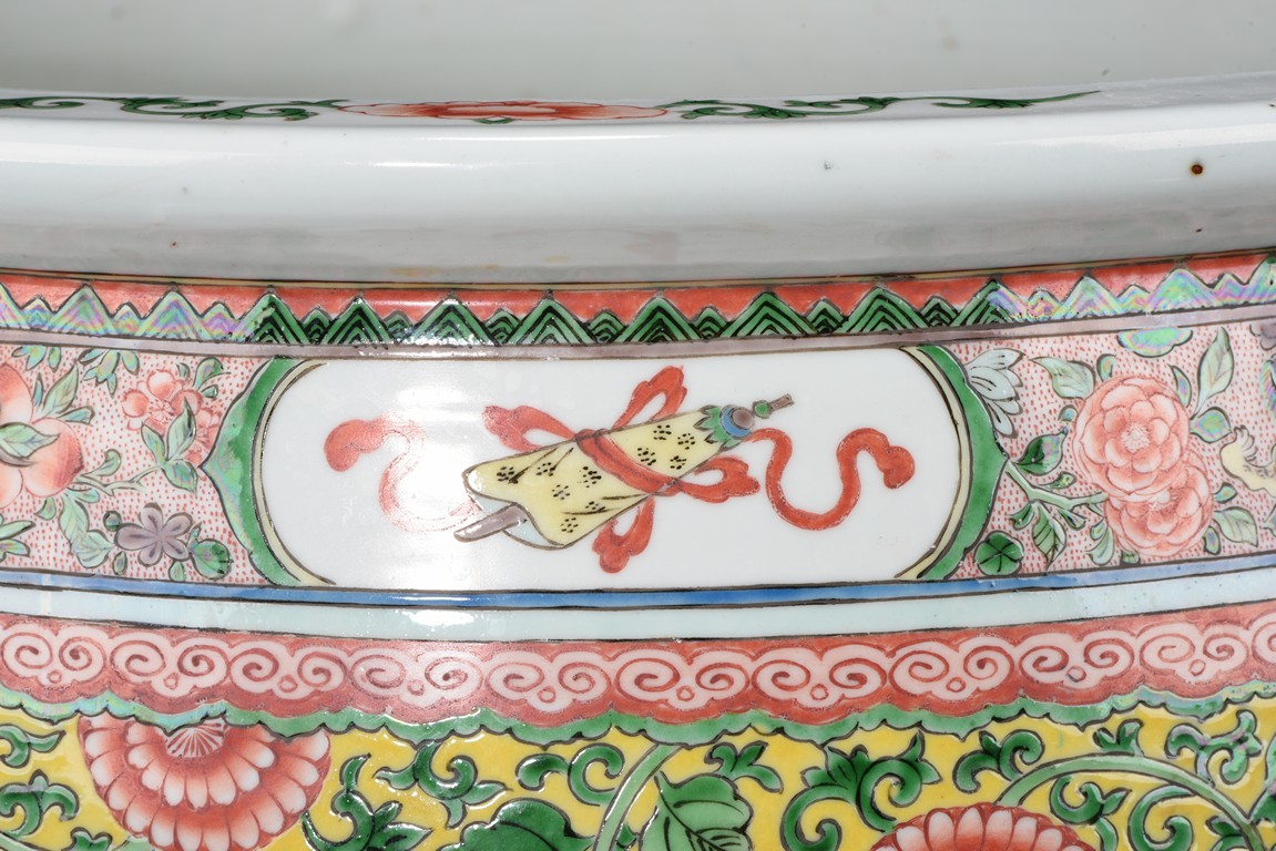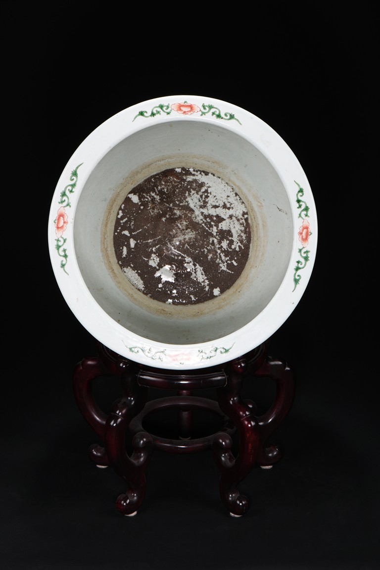 The body elaborately painted with circular and fan-shaped panels enclosing birds and flowers, interspersed with scattered flowers and butterflies. With carved rosewood stand. Qing Dynasty period.