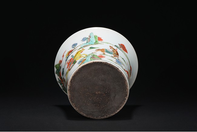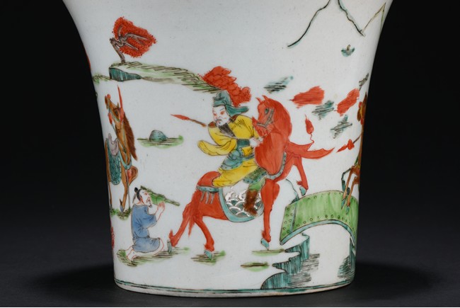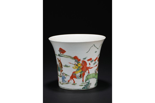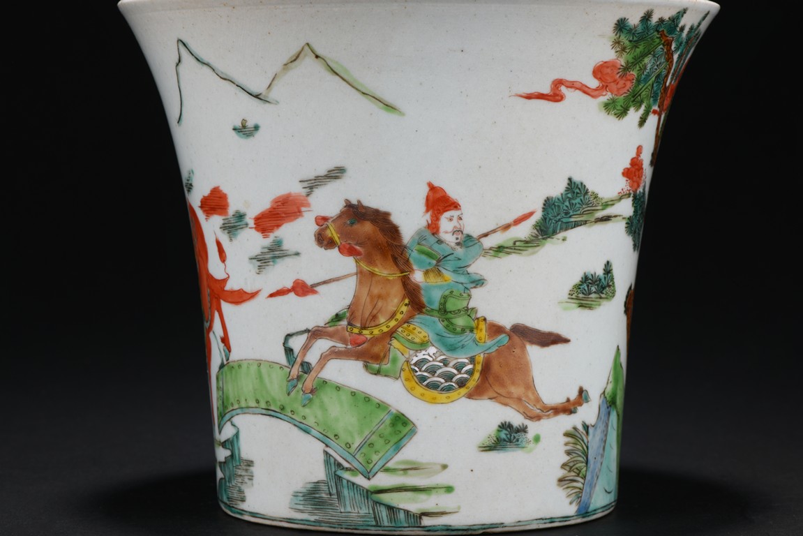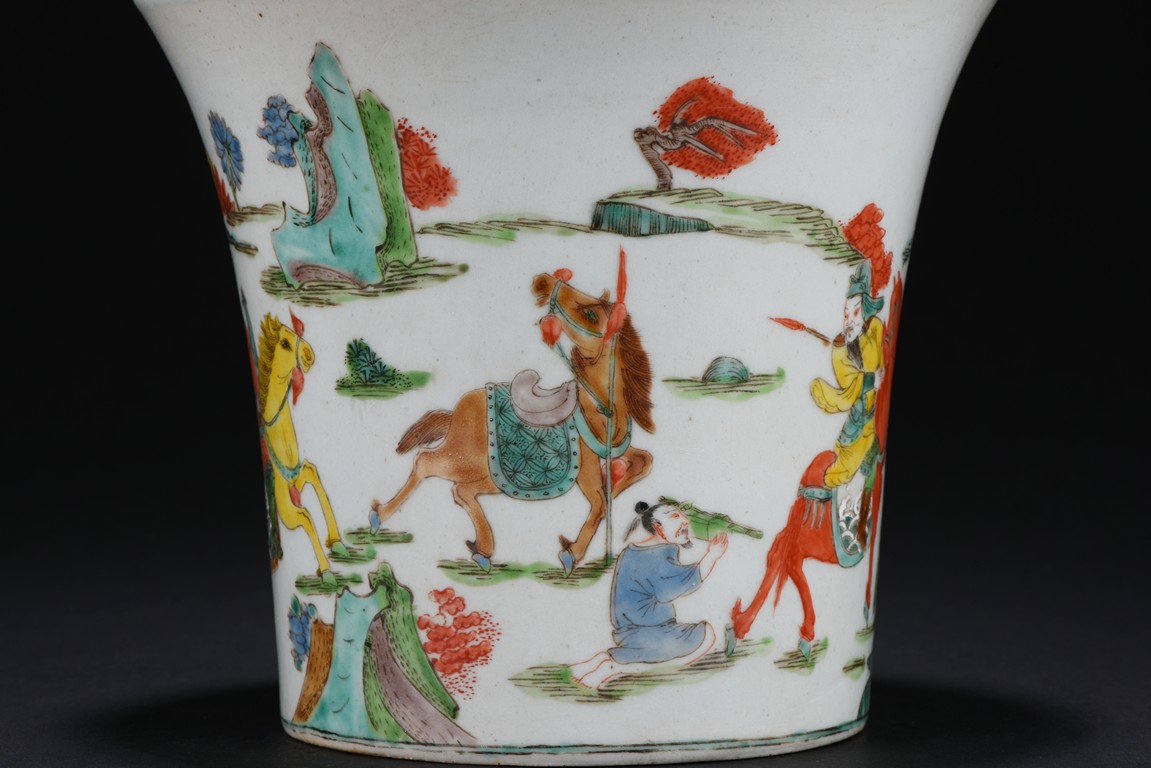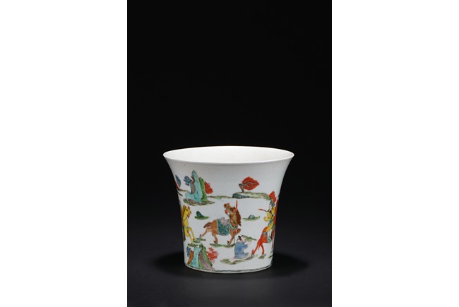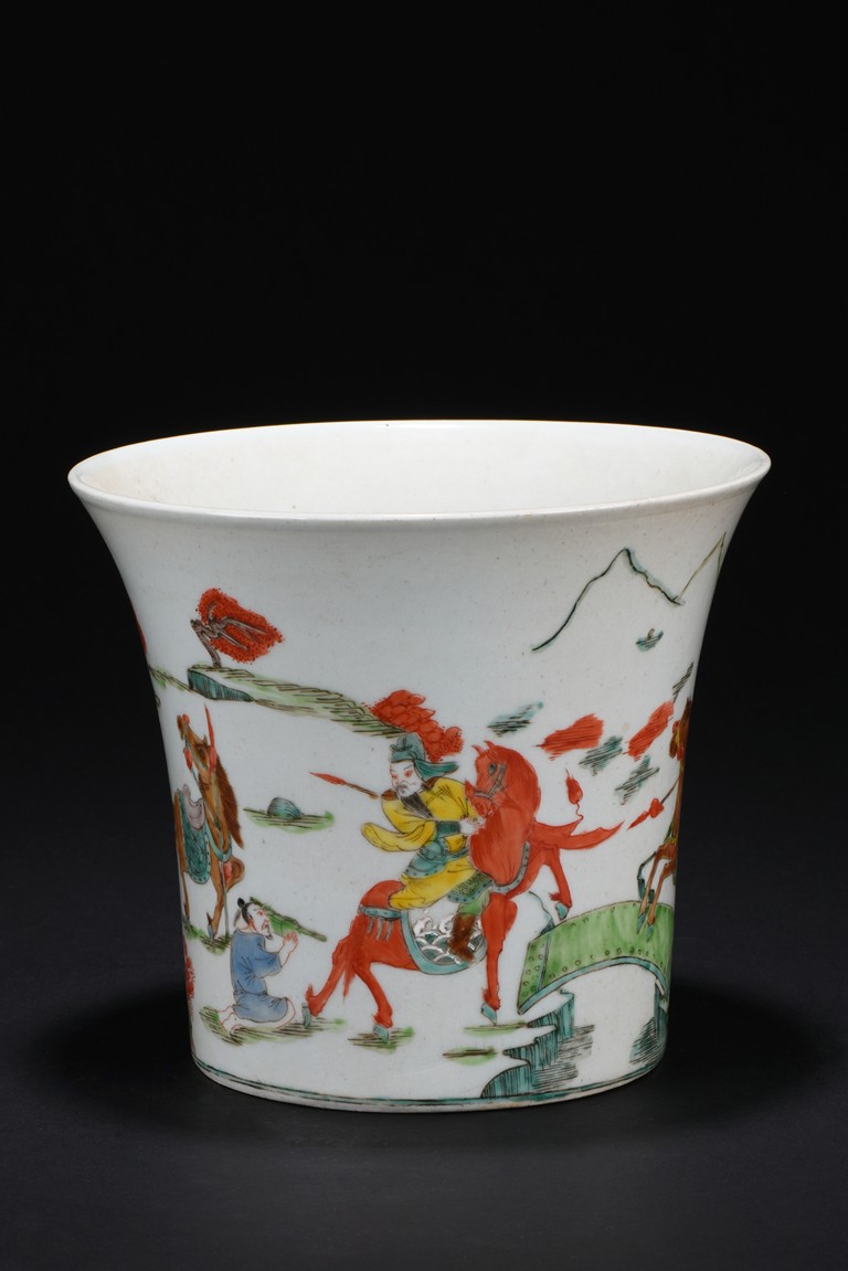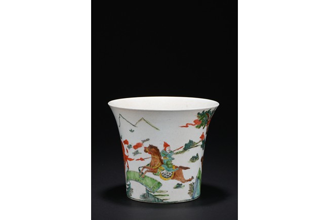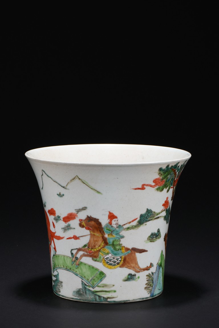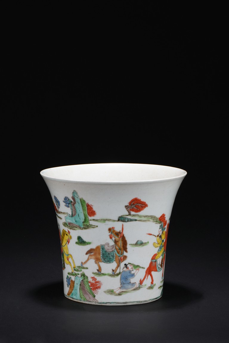 The jardiniere with deep flaring sides rising from a recessed base to an everted rim, brightly decorated around the exterior with motifs of war exercise game in a garden setting with figures on the battleground. Qing Dynasty period.