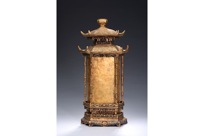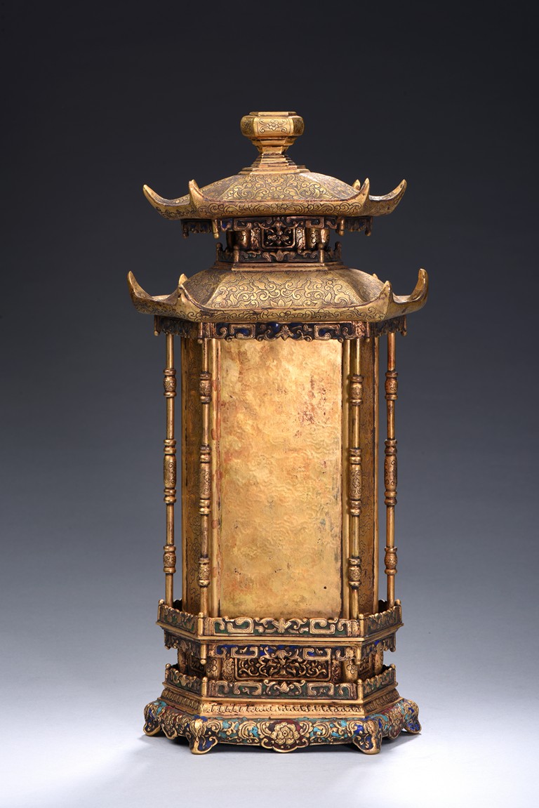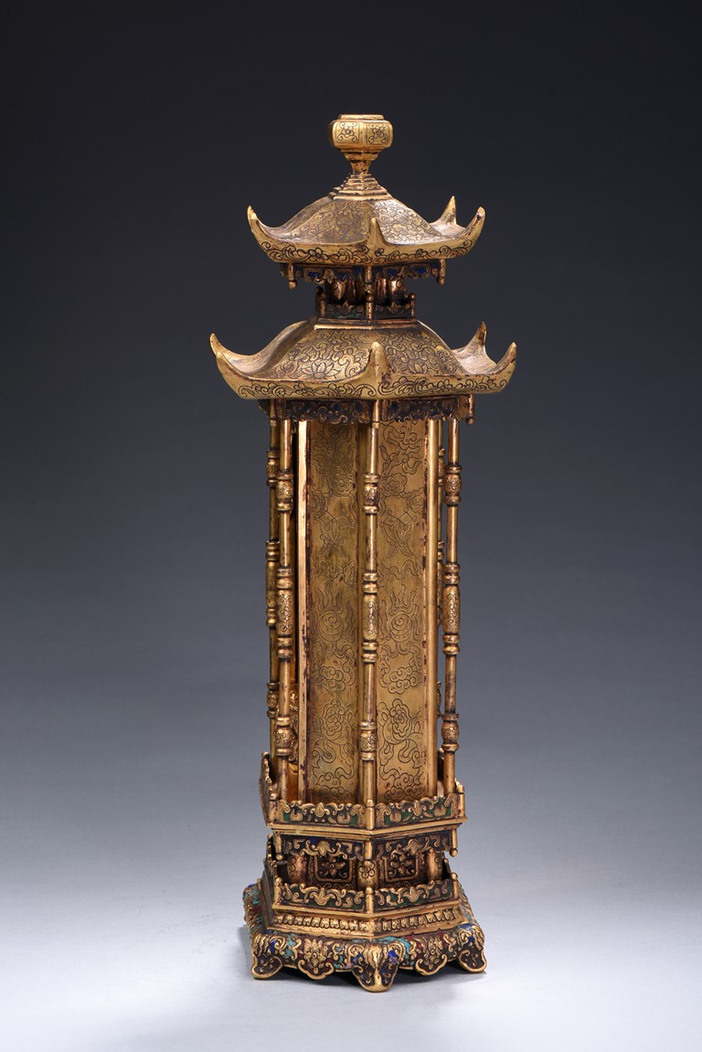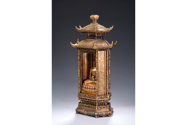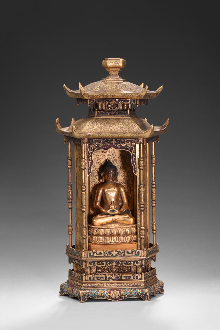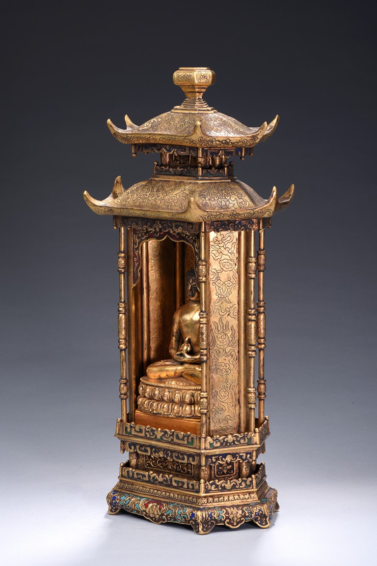 Of architectural pagoda form, supported on a cloisonne enamel pedestal base, the central section with bamboo-shaped columns supporting two stories above, each roof finely decorated with floral scroll design, all surmounted by a hexagonal finial, the gilt-bronze amitabha seated on a double lotus throne, with legs in dhyanasana and both hands holding a vessel. Qing Dynasty period.