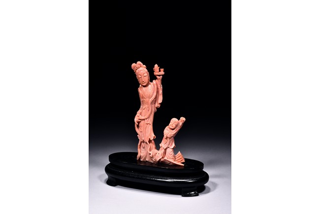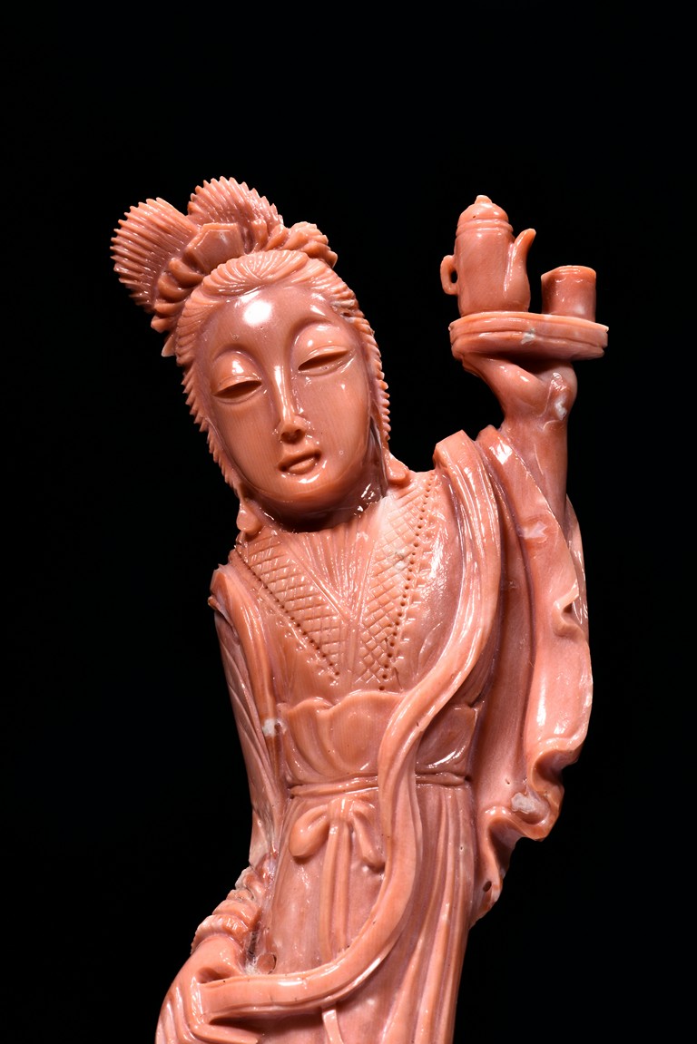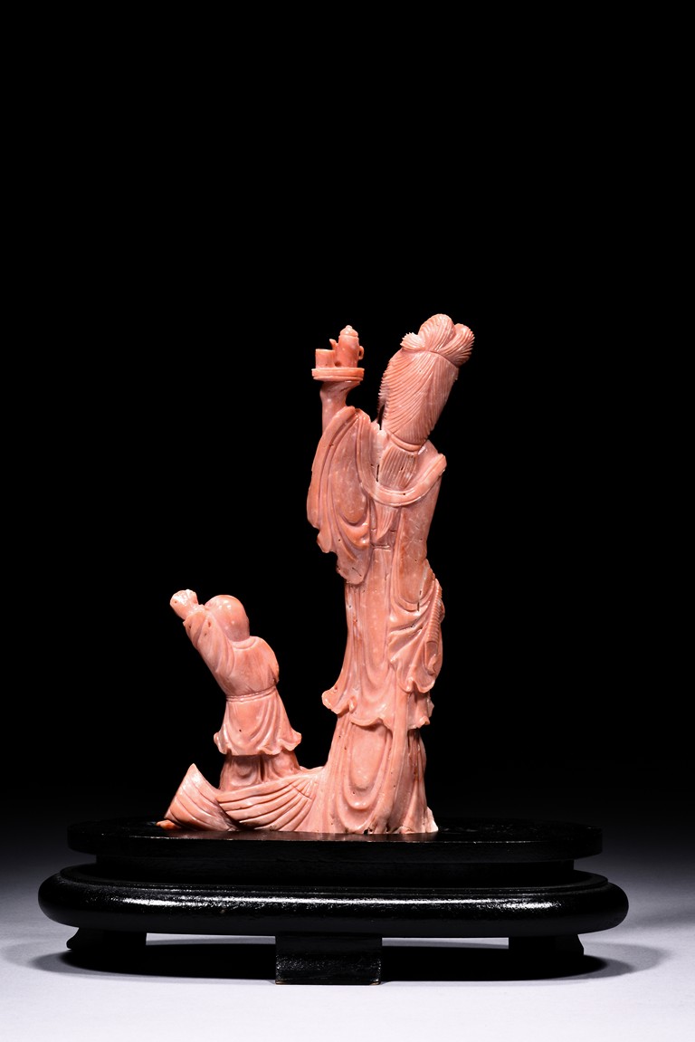 Finely carved as a female attendant with left hand raised high and holding a plate holding a teapot set, wearing long robe with folds, the right hand holding a ribbon, accompanied with a young boy standing upon a phoenix and holding a beaded string tied to its beak. Qing Dynasty period.