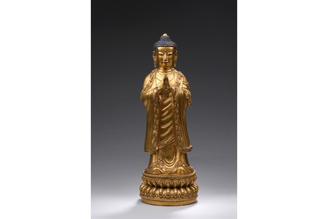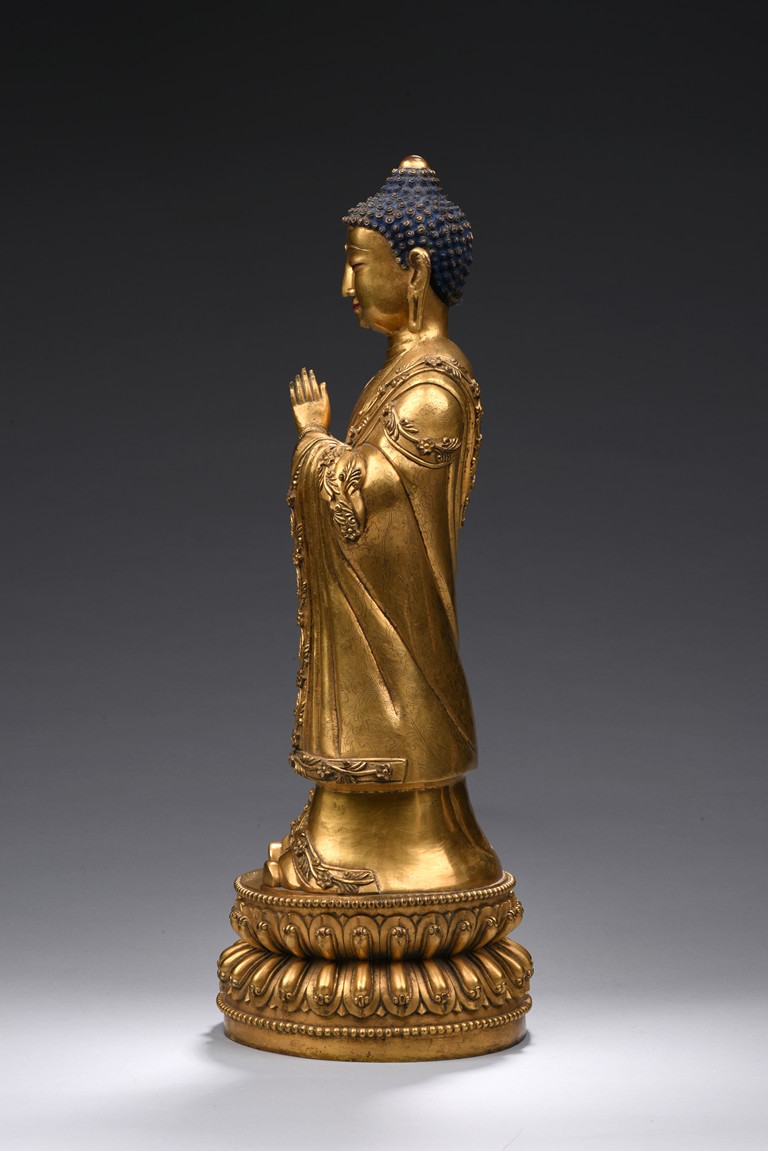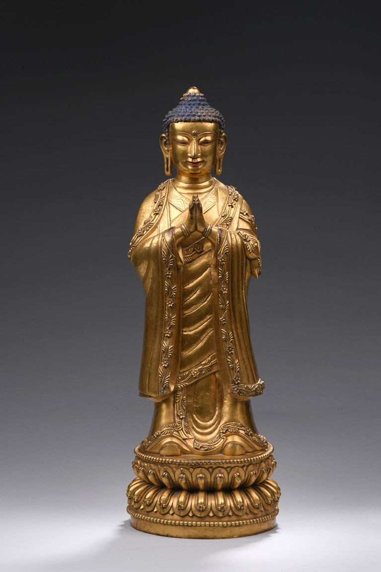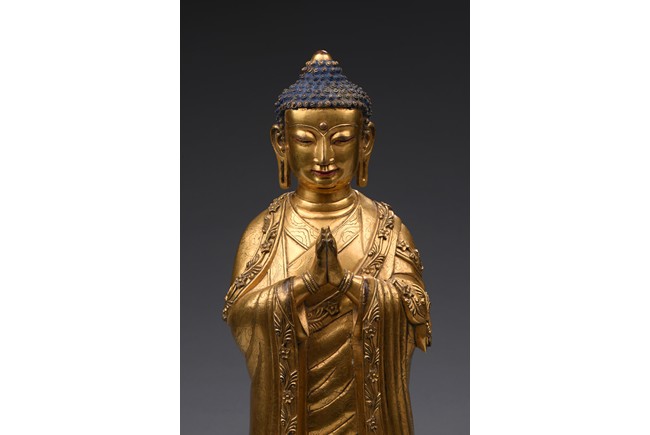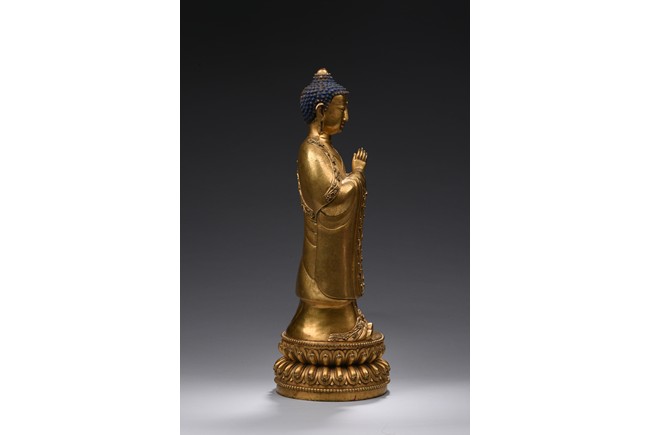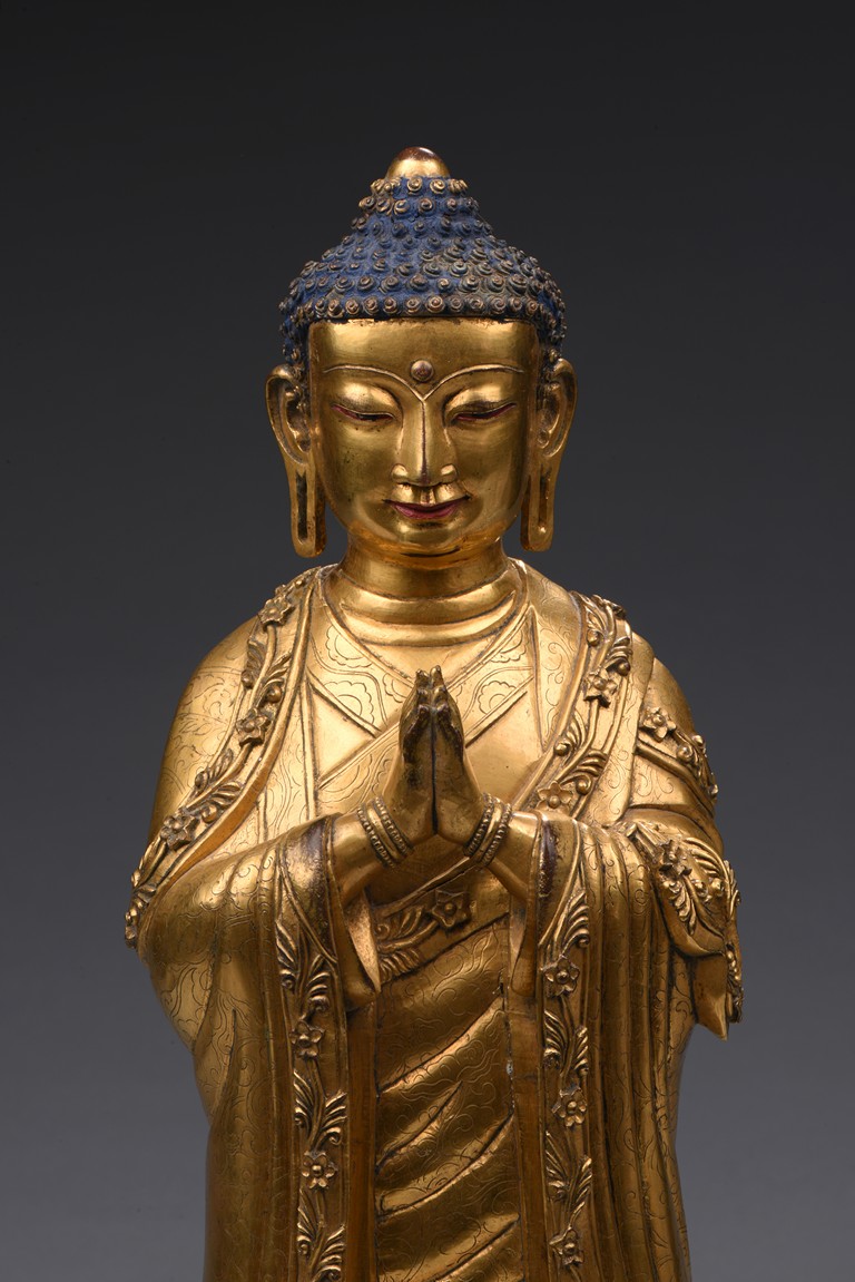 The bodhisattva is shown standing upon a double lotus throne, with downcast eyes in contemplation and hands together in prayer, wearing loosely draped robes, the hems of the robes decorated with floral scrolls, the hair with small bosses surrounding the ushnisha.