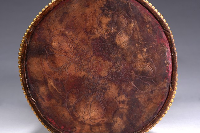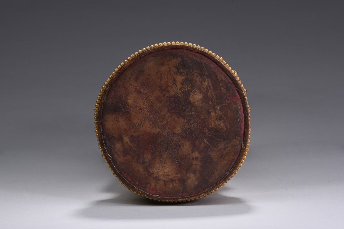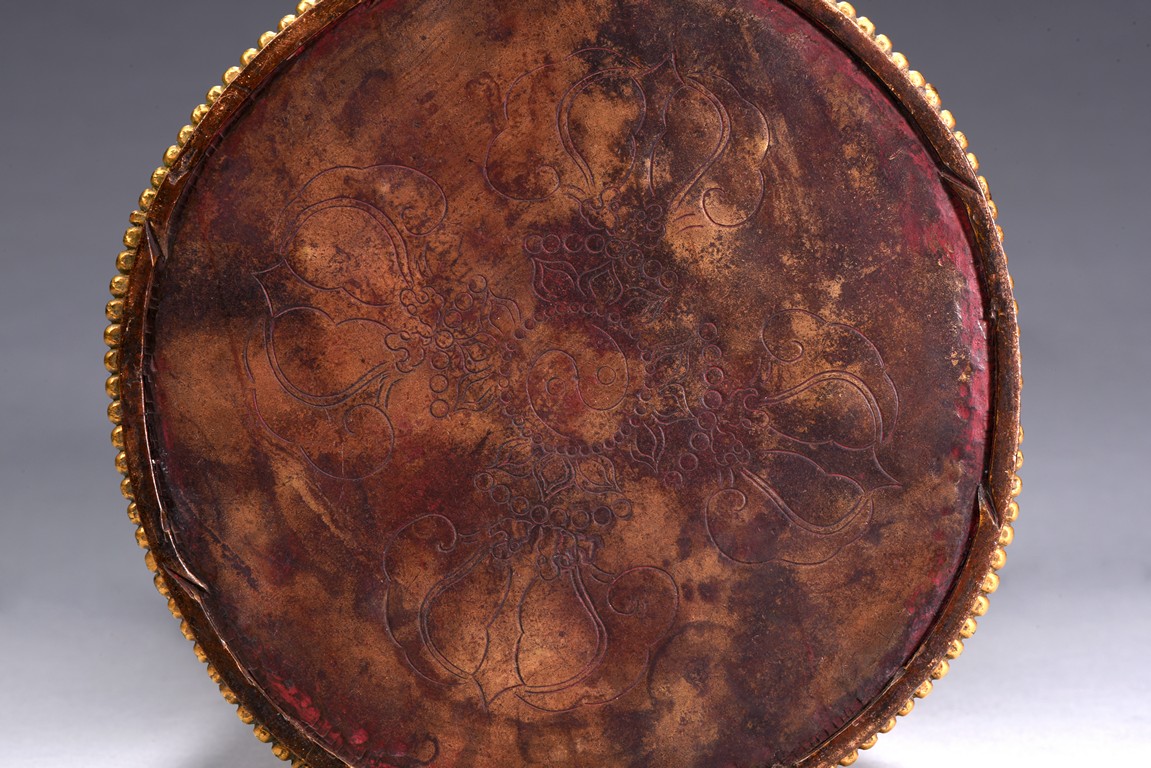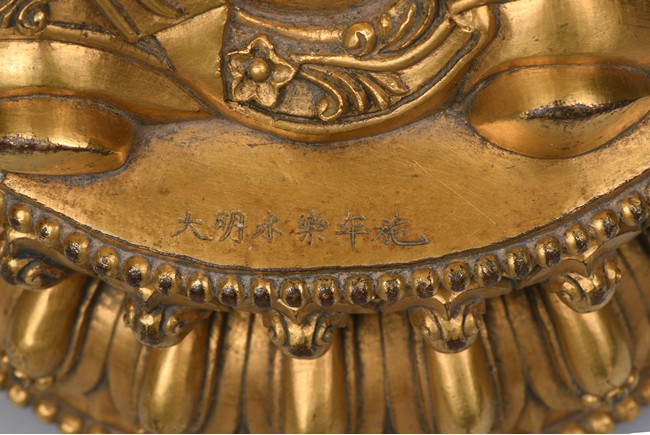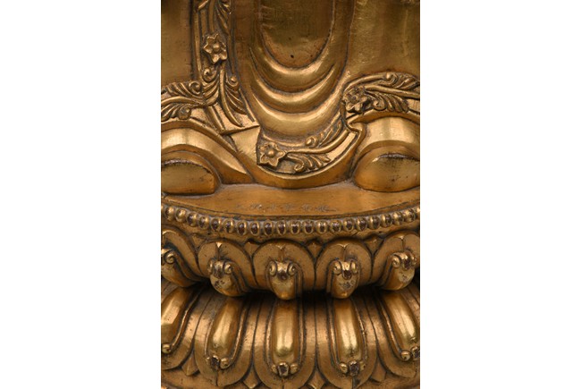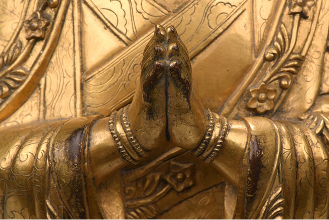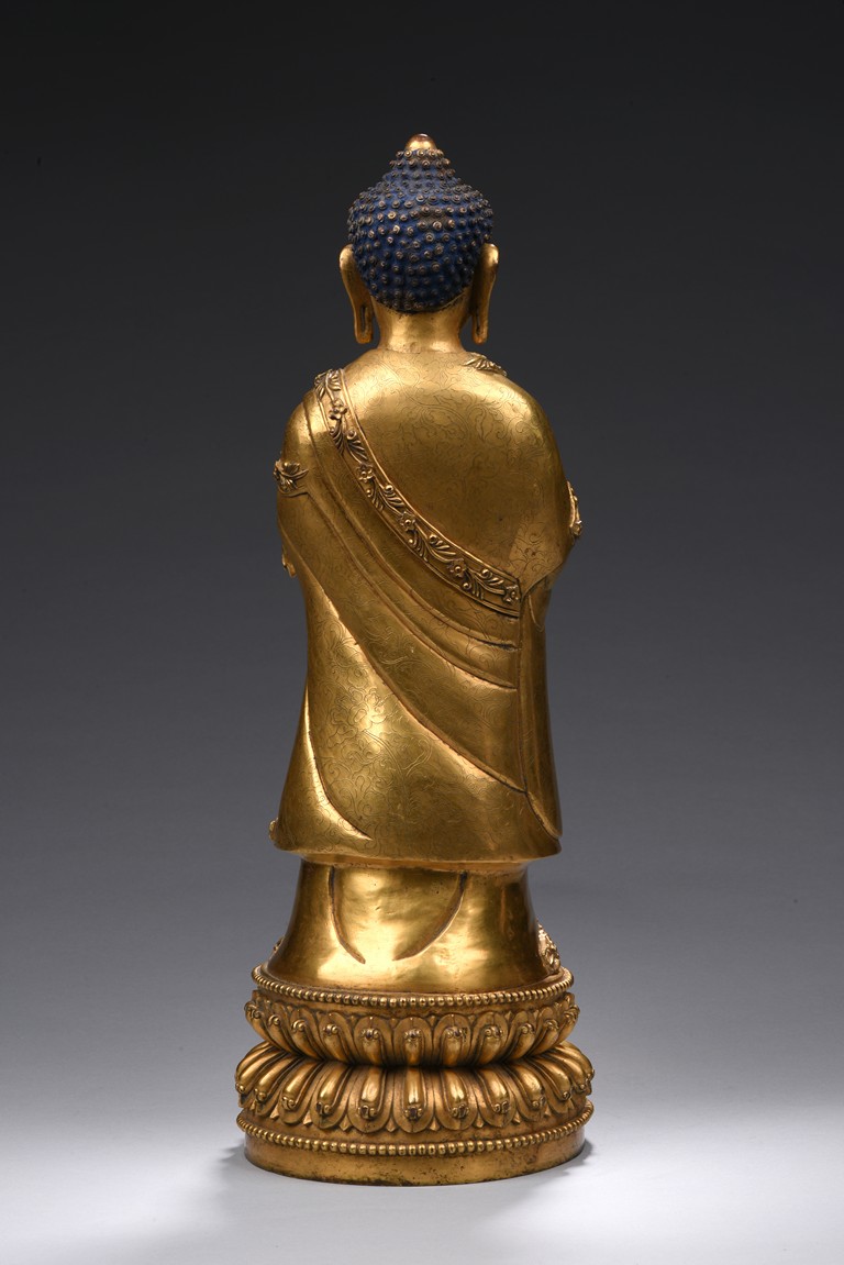 The bodhisattva is shown standing upon a double lotus throne, with downcast eyes in contemplation and hands together in prayer, wearing loosely draped robes, the hems of the robes decorated with floral scrolls, the hair with small bosses surrounding the ushnisha.