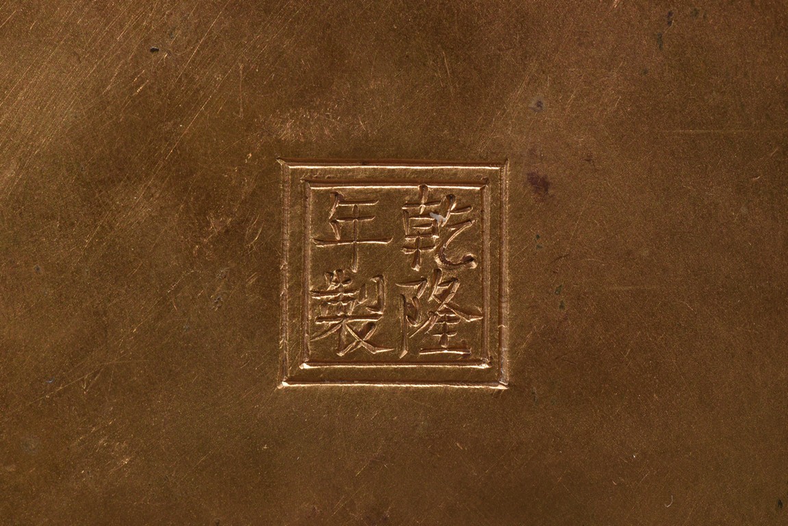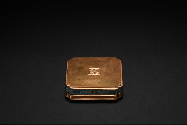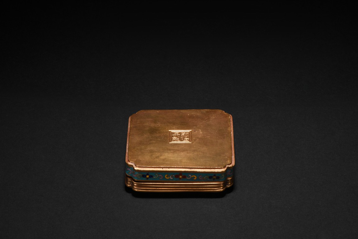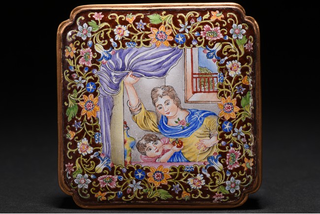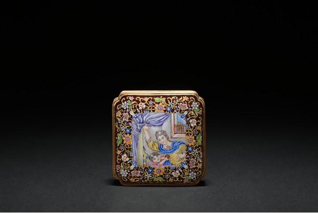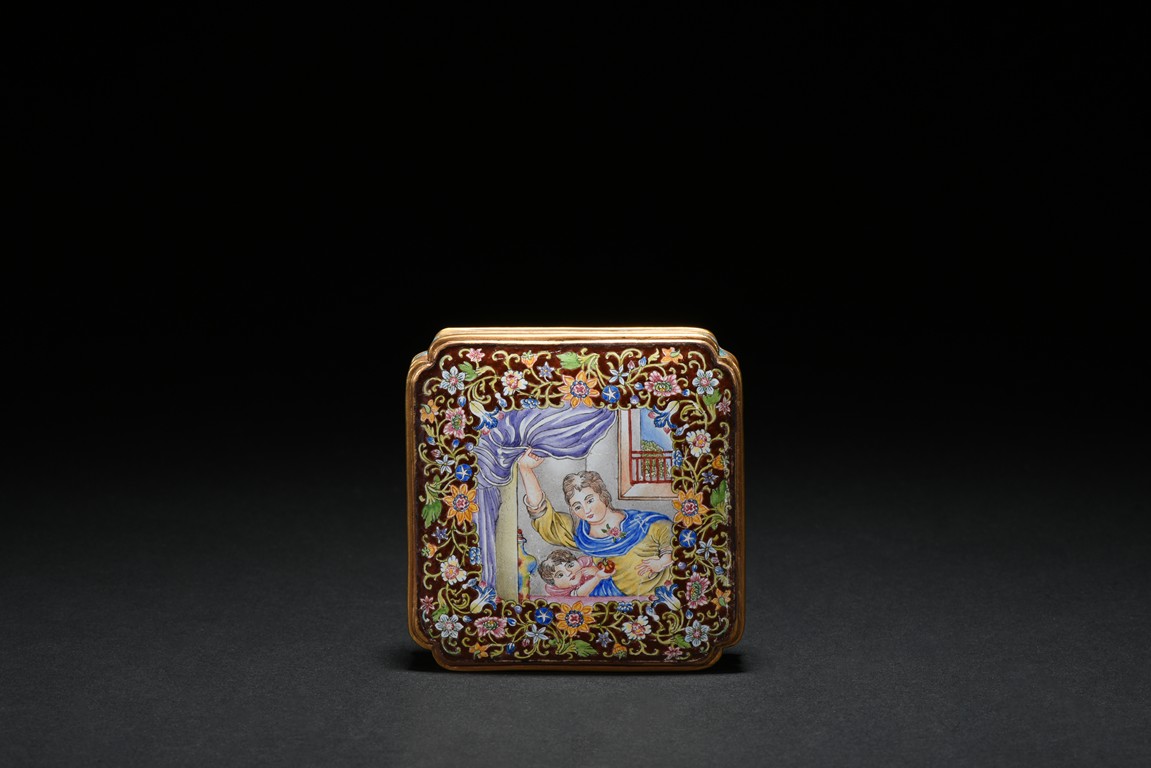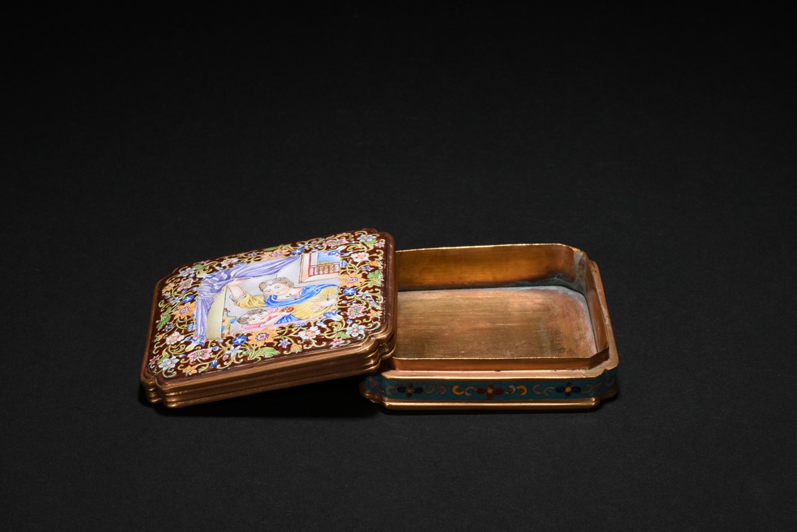 Of low square form with indented corners,cover delicately enamelled with European figures of a lady in yellow tunic with blue sash, pushing aside a purple curtain to peer out of a window, with a young boy at her side grasping an orange pumpkin, the vignettes encircled by a multicolor meander with mixed flowers including morning glory,peony and narcissus, all borne on leafy foliage on a soft brown ground. Qing Dynasty period.