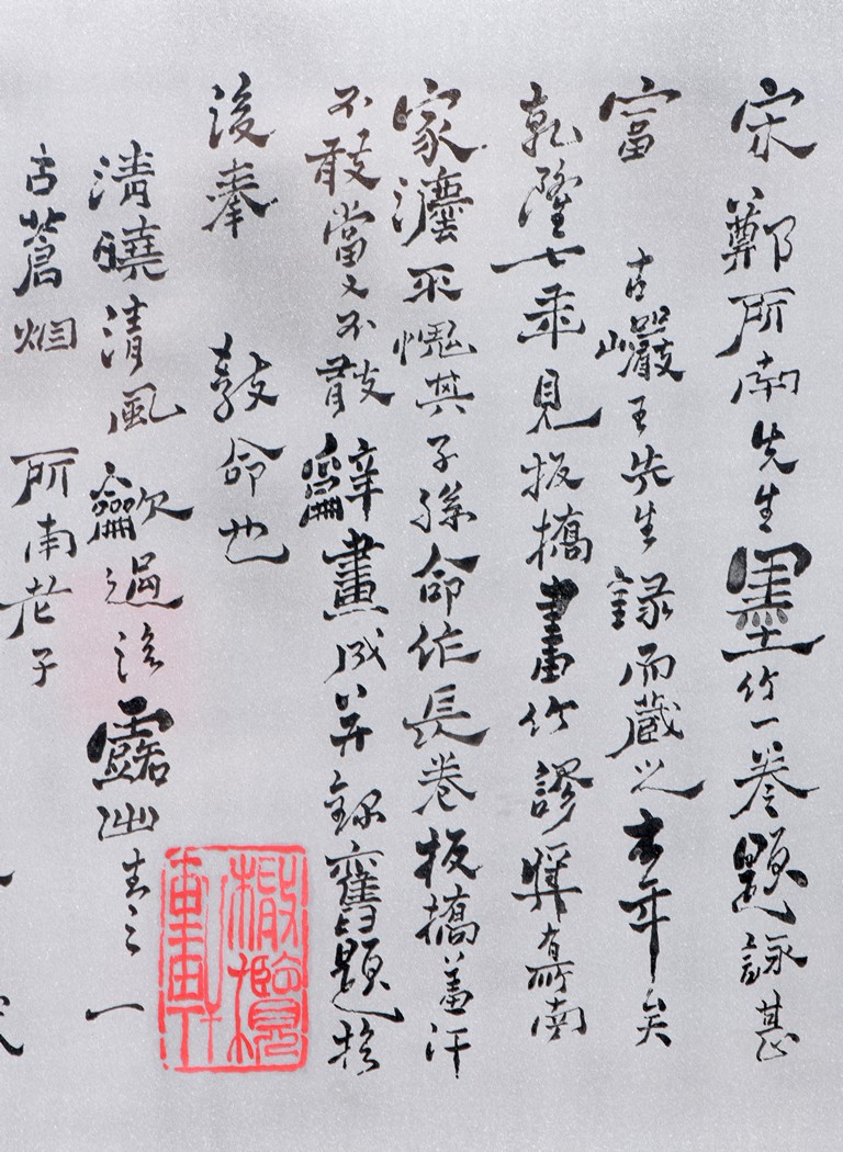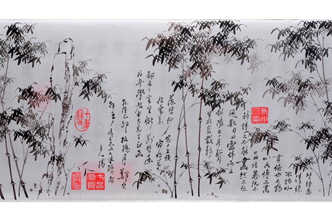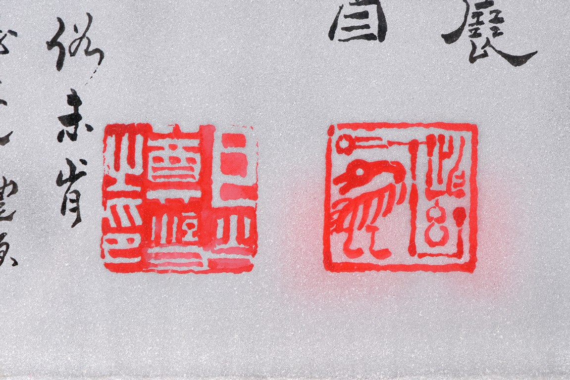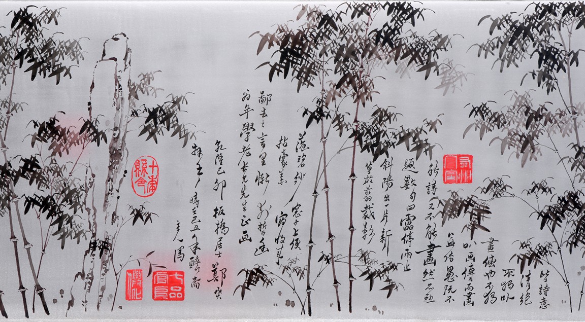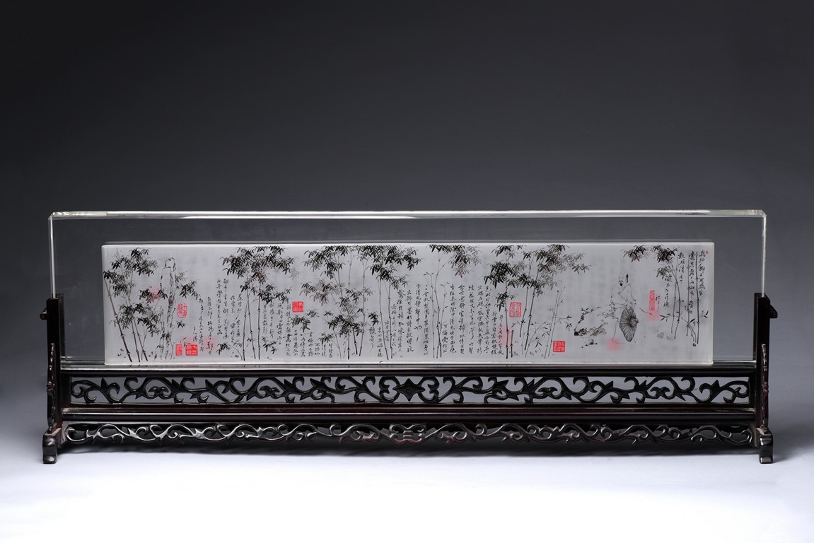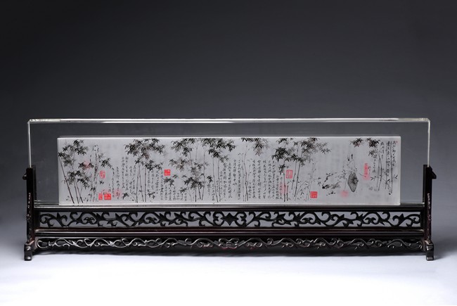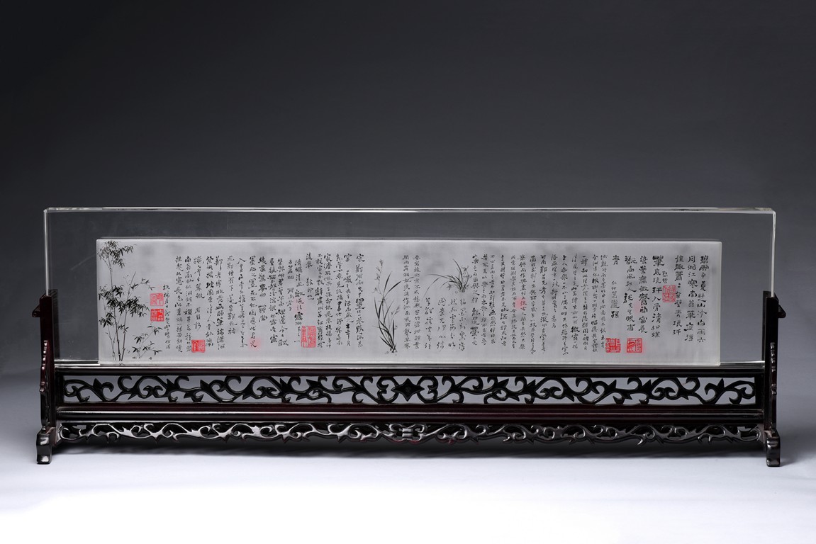 Rectangular modelled, the transparent glass table screen is finely inside-painted with poems, bamboos, and orchids in the manner of Zheng Banqiao. 20th century.