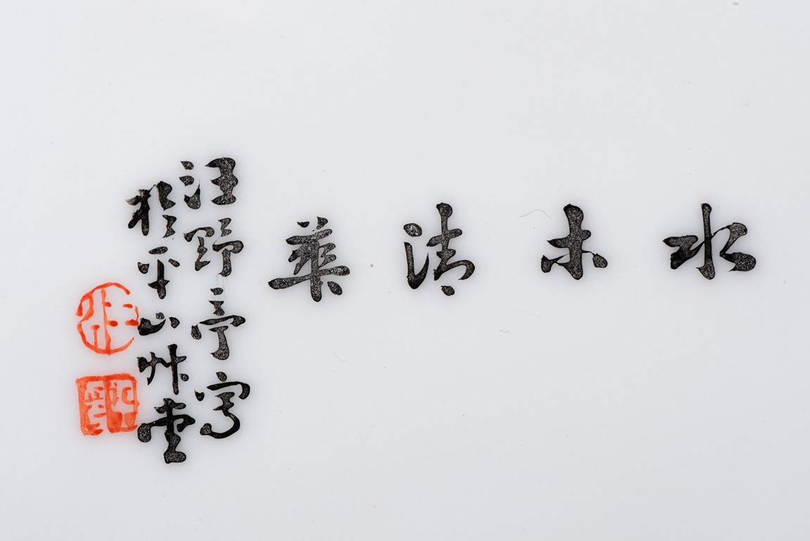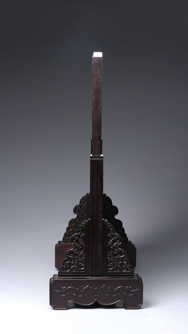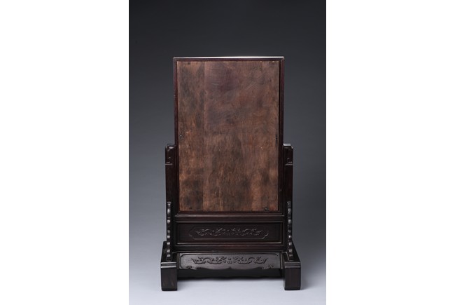 Skillfully modelled in the form of a table screen, the rectangular panel painted with a tranquil mountain landscape scene depicting numerous tall gnarled pine trees and other lush vegetation issuing from ragged mountains,with two tiny houses amidst landscape setting, with jagged mountain peaks rising high and fading into the distance, all reserved against a similar marble ground, the top center with calligraphy inscription and two seals belonged to Wang Yeting, with fitted rosewood frame and stand. Republic period.