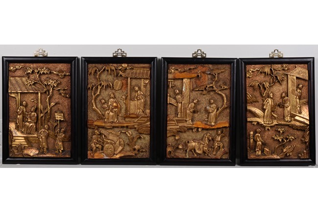 Each panel well carved through and lacquered in gilt depicting official and his family members in a garden pavilion setting in relief. Republic period.