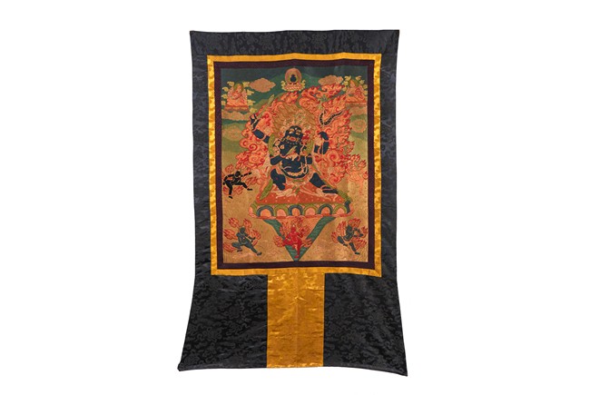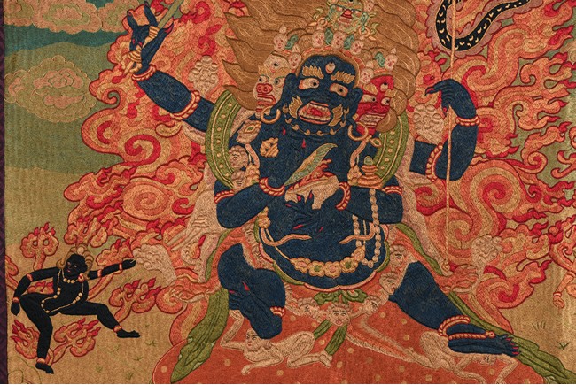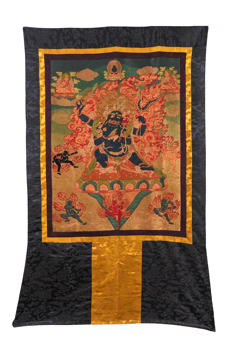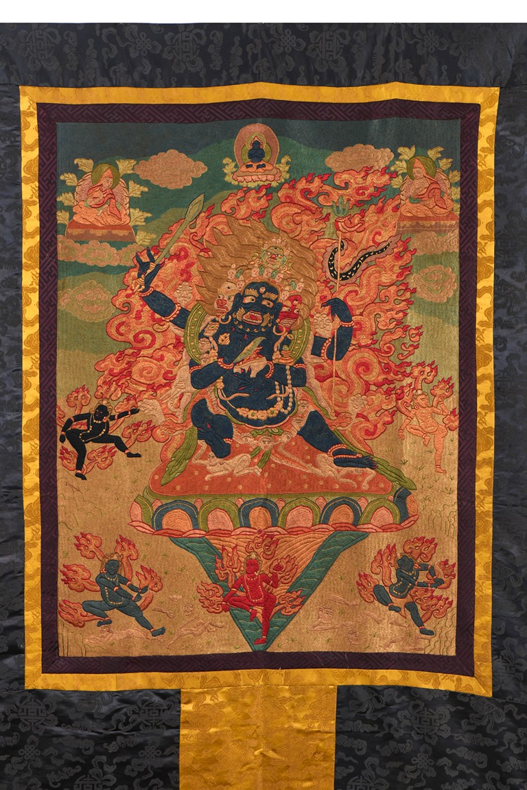Finely and vibrantly embroidered, the fierce figure Yamantaka shown standing at center within a flaming mandorla, his hands holding a variety of weapons, surrounded by eight deities in diverse postures. Qing Dynasty period.