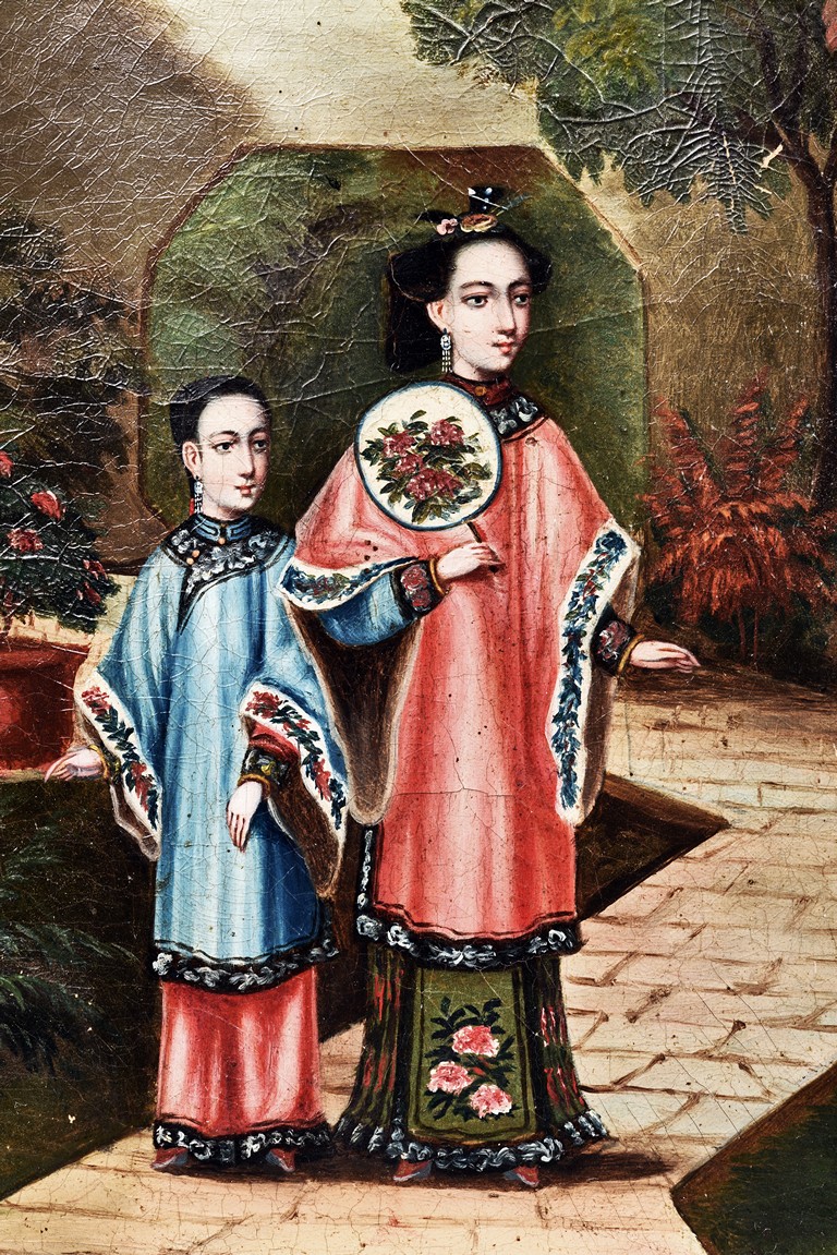 Chinese school. Oil on canvas. With depiction of three ladies of European appearance dressed in traditional Chinese costume in a garden setting. Qing Dynasty period.