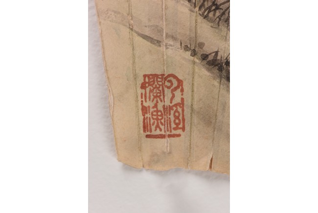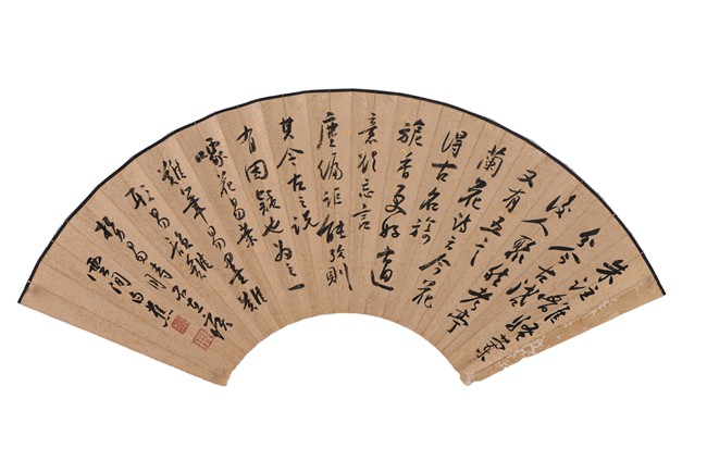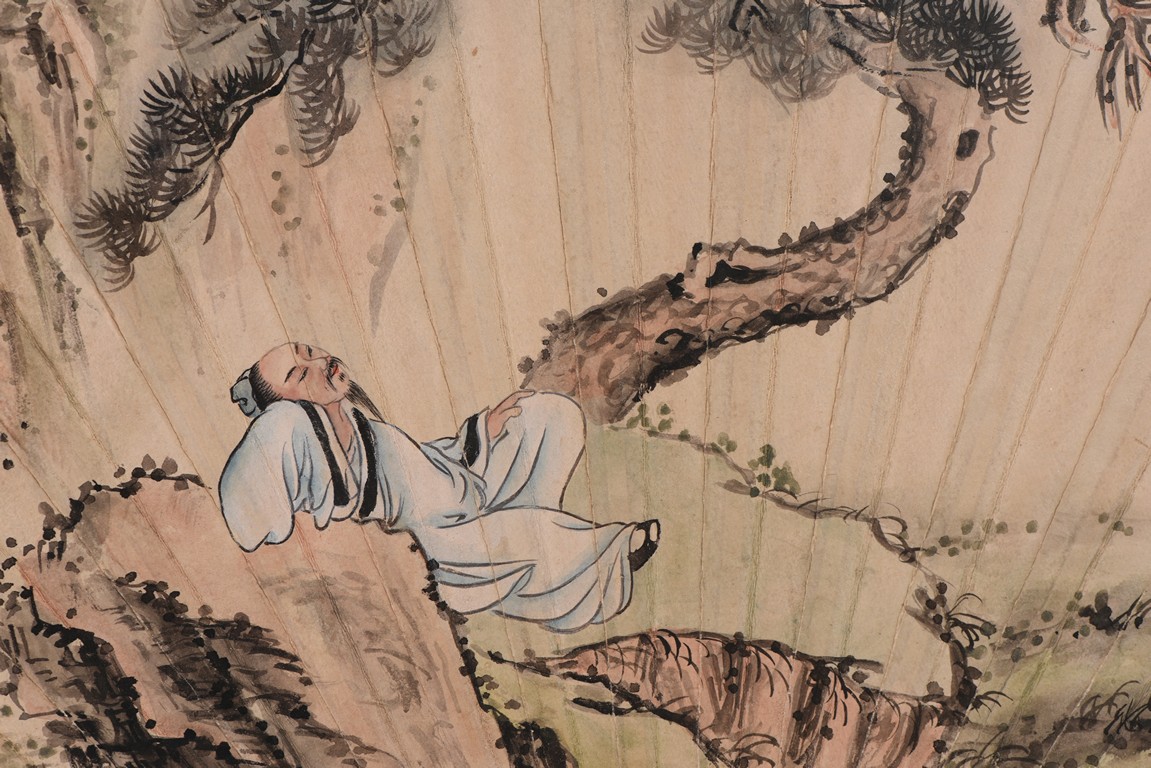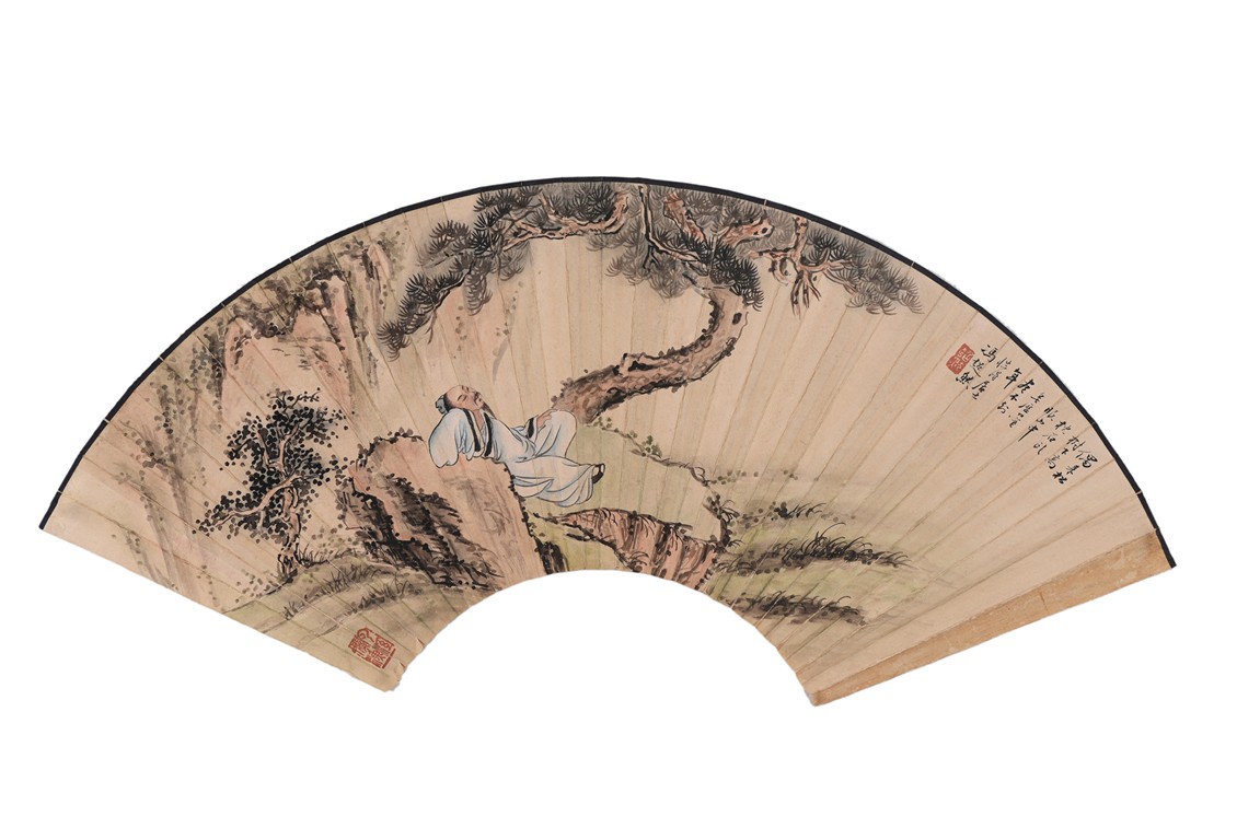 Color and ink on paper. Ink on paper. Fan leaf. Sleeping scholar. Signed Feng Chaoran, and two seals of the artist; the reverse with running script and two seals of the artist. Signed Bai Jiao.