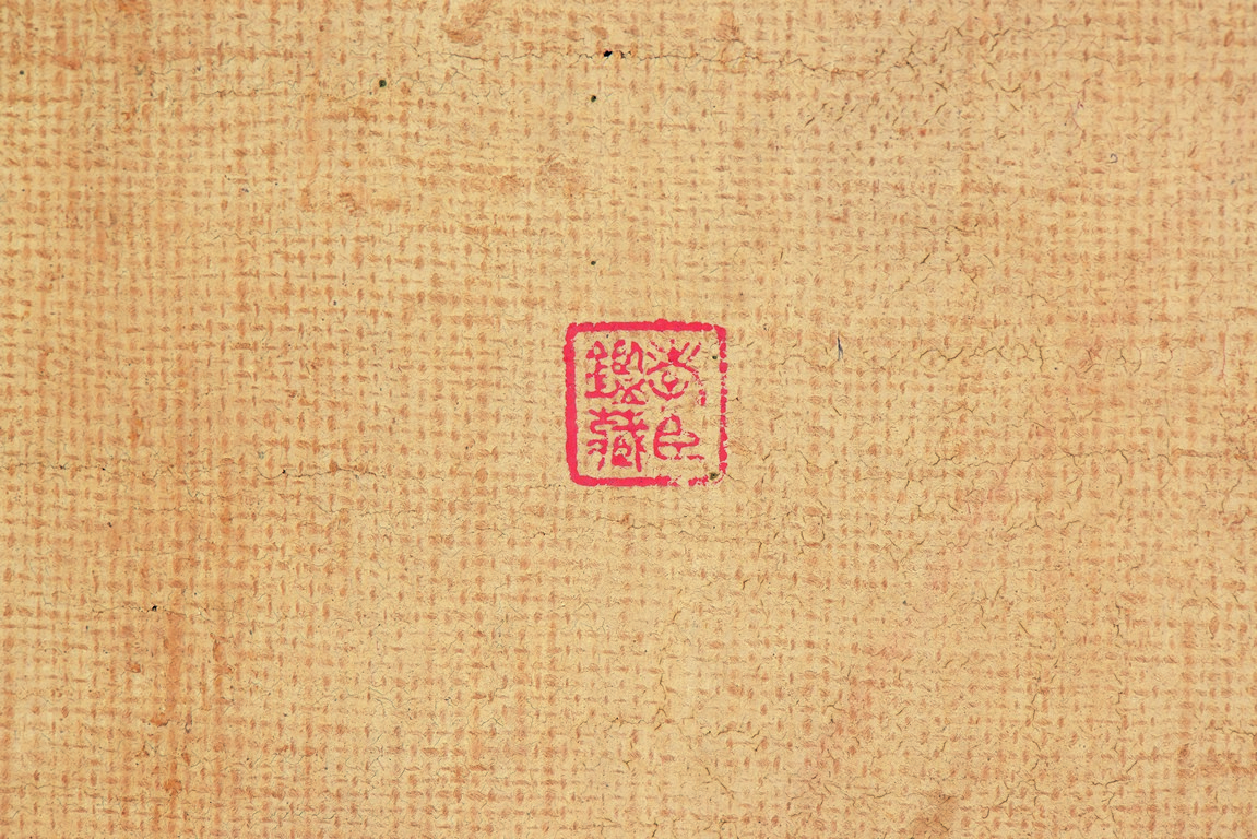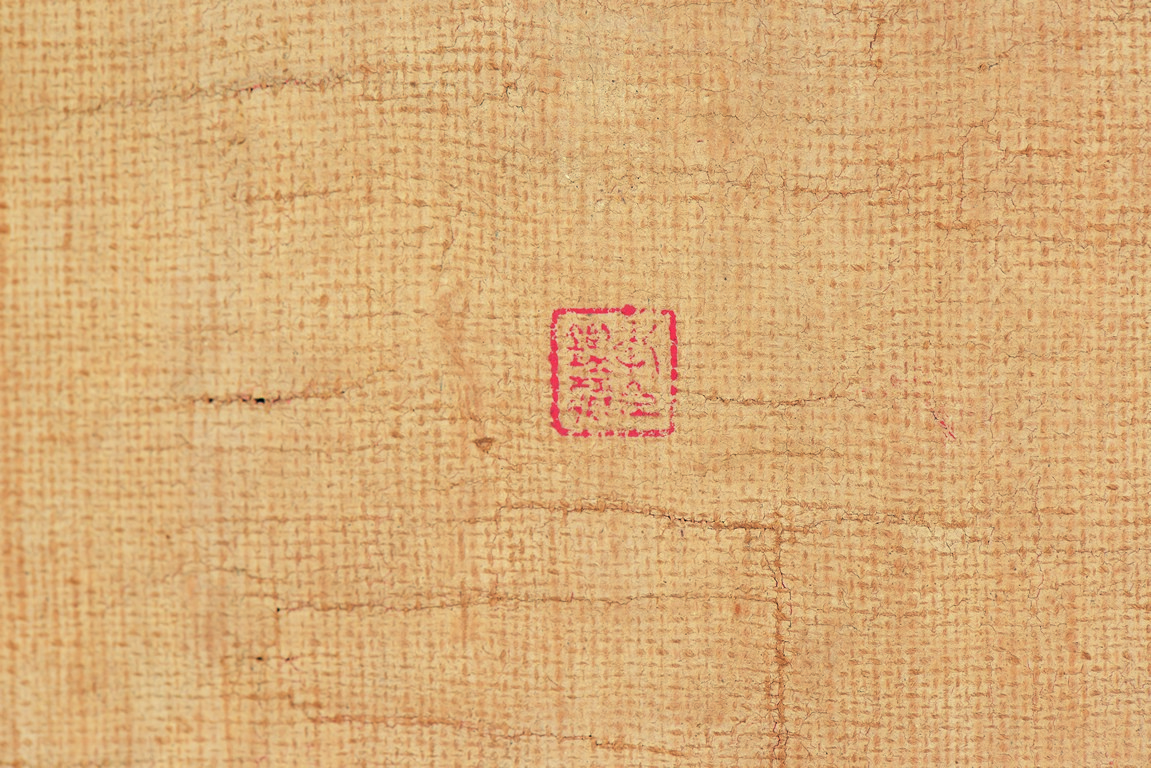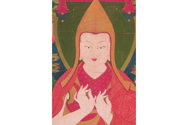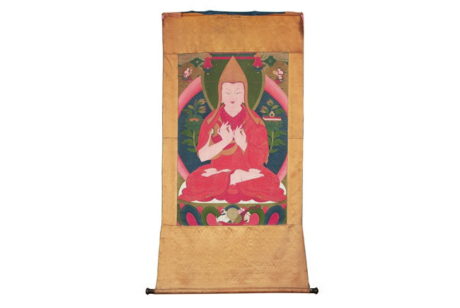 The Thangka depicts Tsongkhapa seated upon lotus throne, hands raised in mutra, backed by an aureole, flanked by two fair children. Qing Dynasty period.