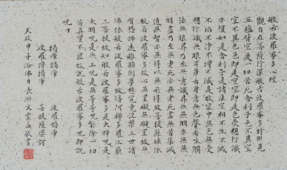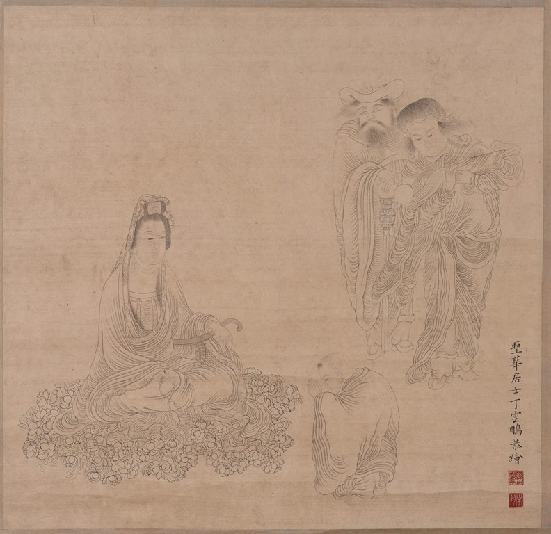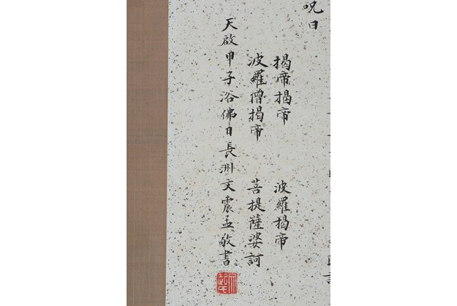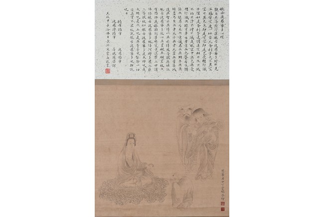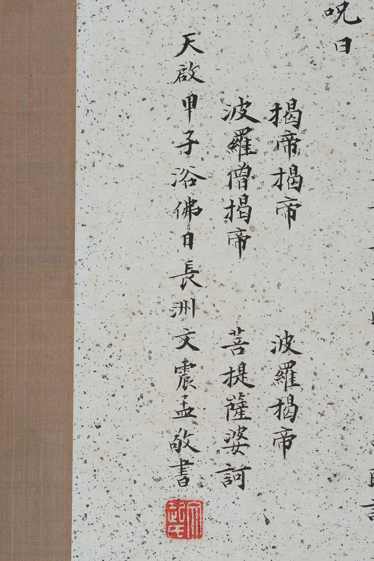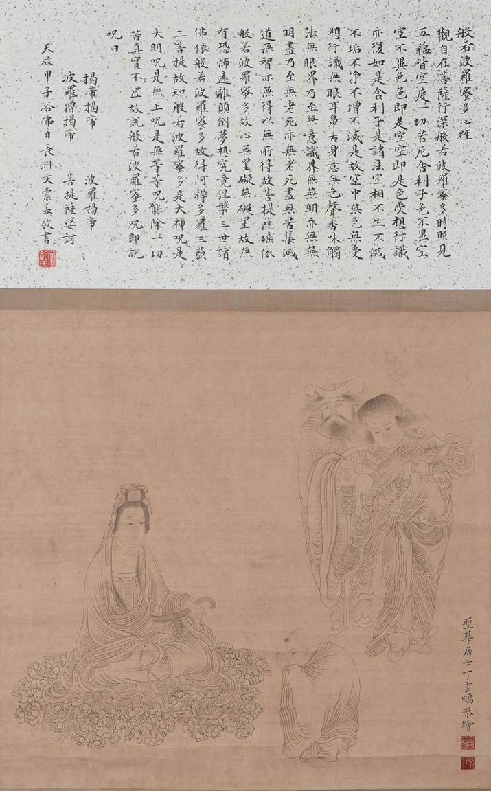 Ink and color on paper. Heart Sutra Calligraphy and Guanyin. Signed and with three seals of the artist.