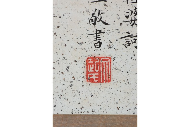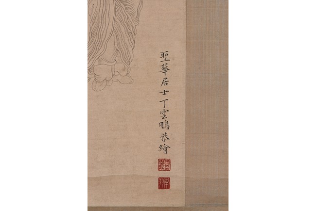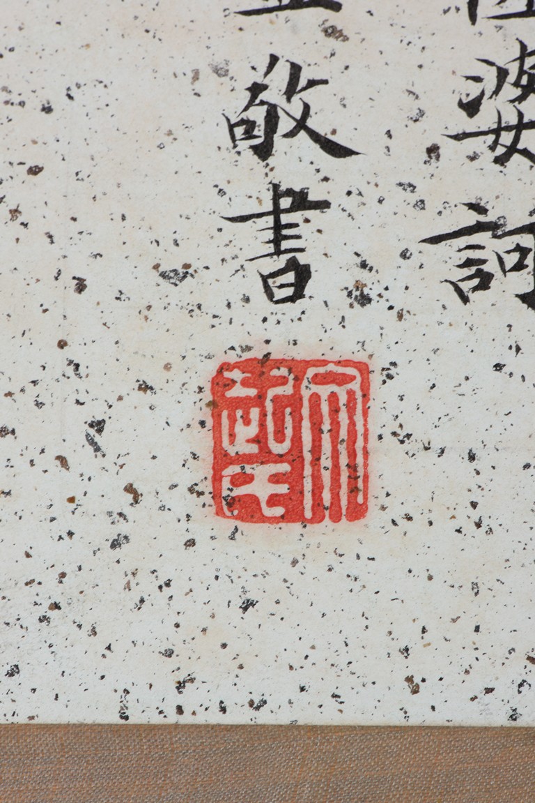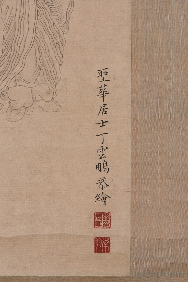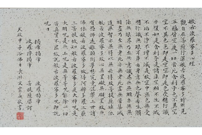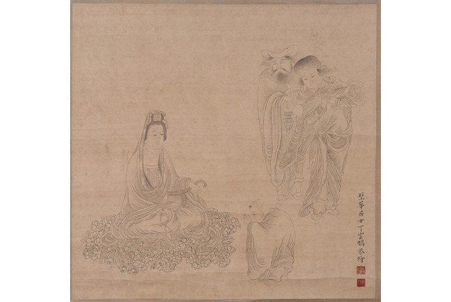 Ink and color on paper. Heart Sutra Calligraphy and Guanyin. Signed and with three seals of the artist.