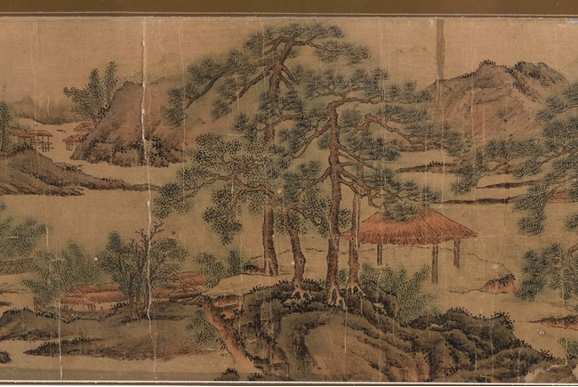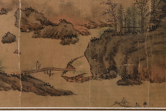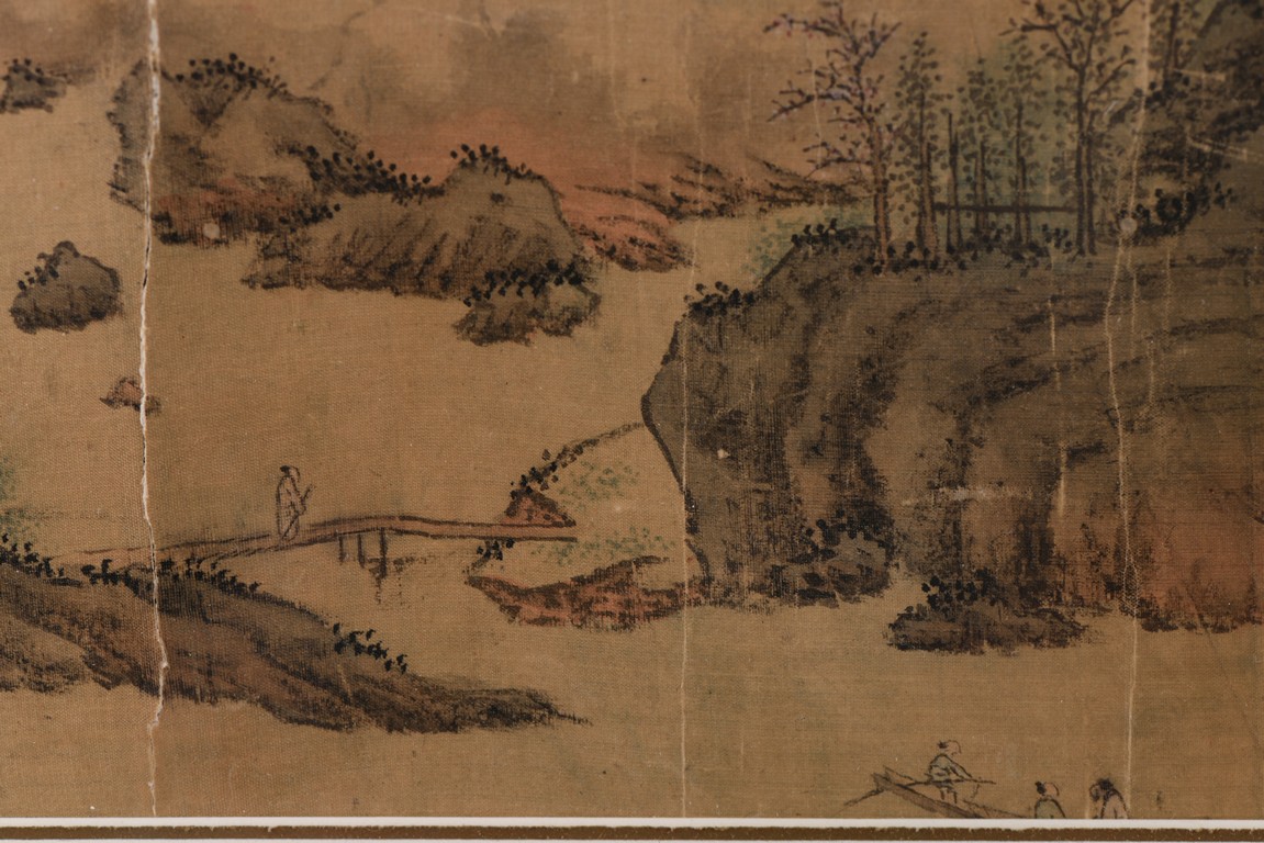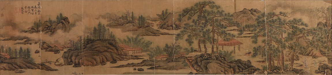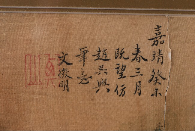 Ink and color on paper. Landscape in the manner of Zhao Mengfu. Framed. Signed Wen Zhengming and with one seal of the artist.