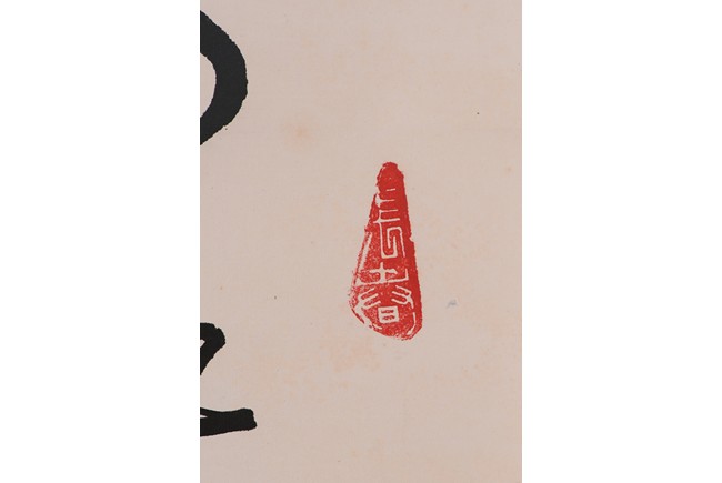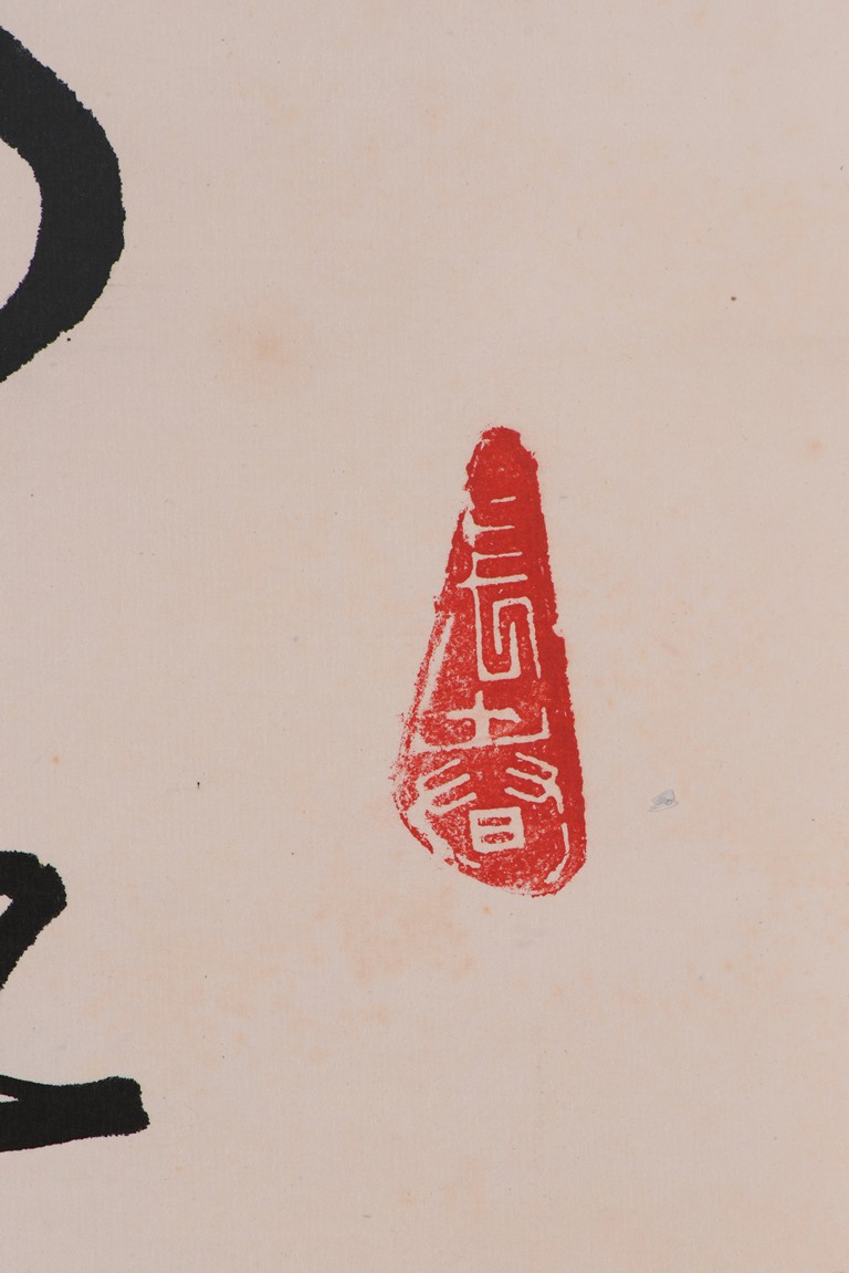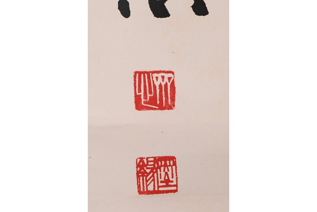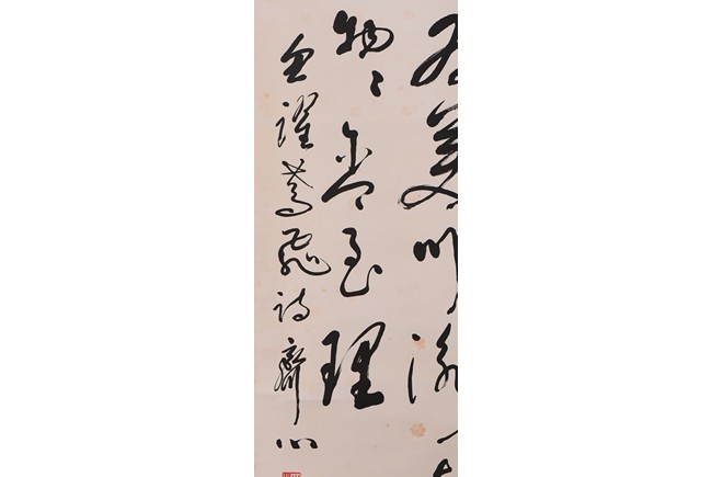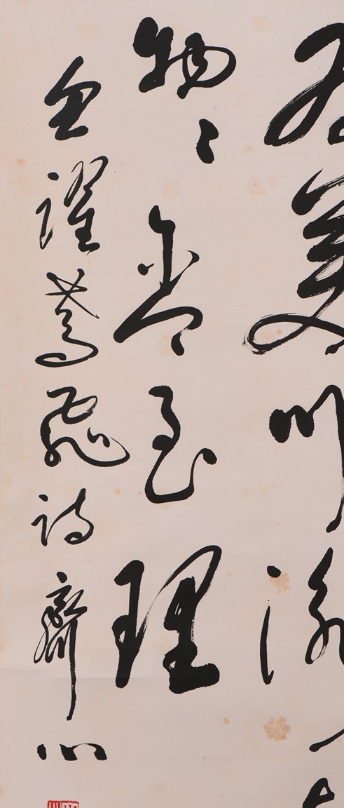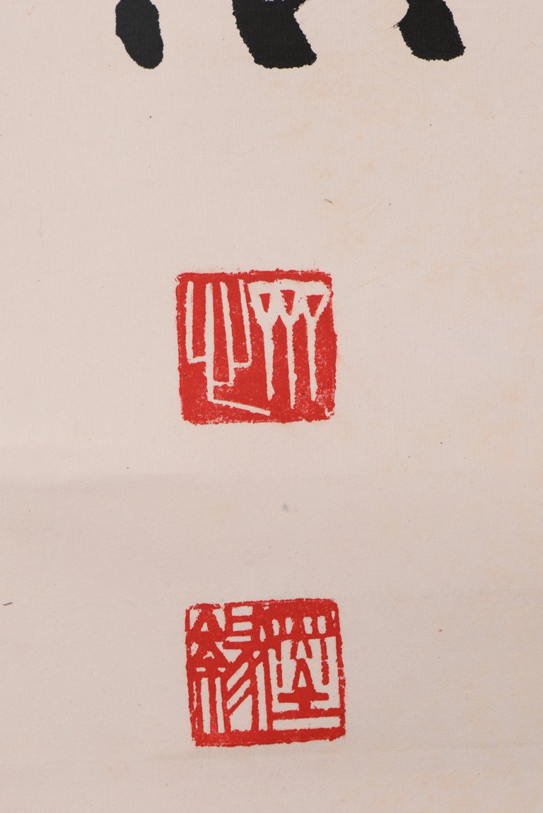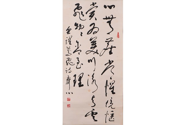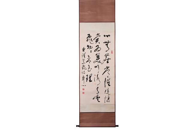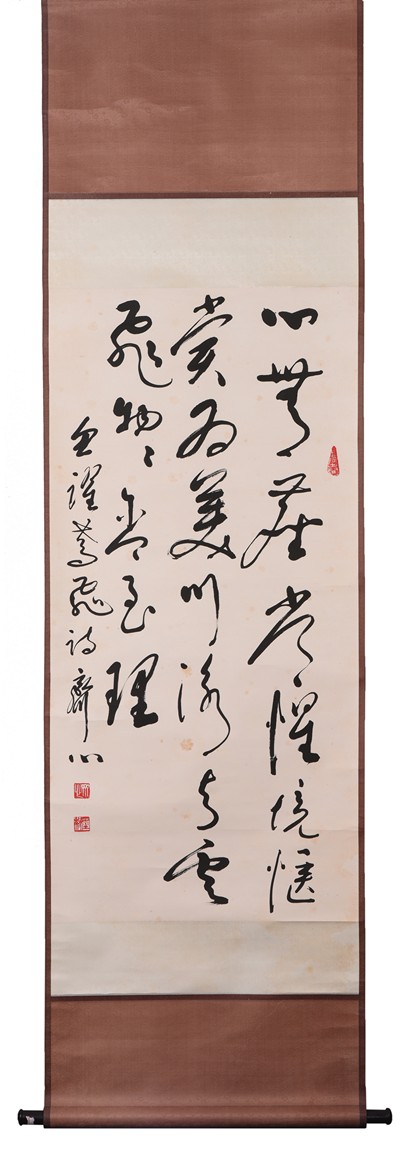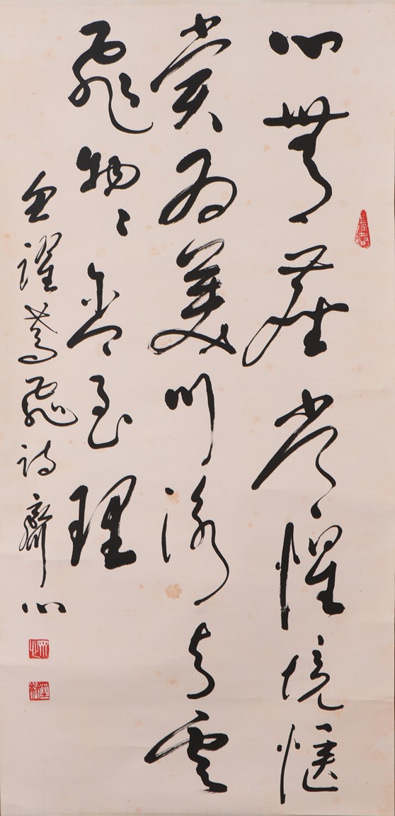Ink on paper. Cursive calligraphy. Hanging scroll. Signed Qi Xin and with three seals of the artist.