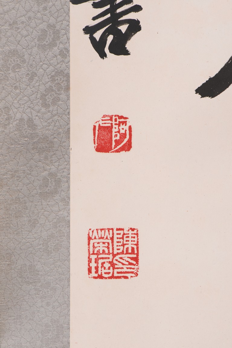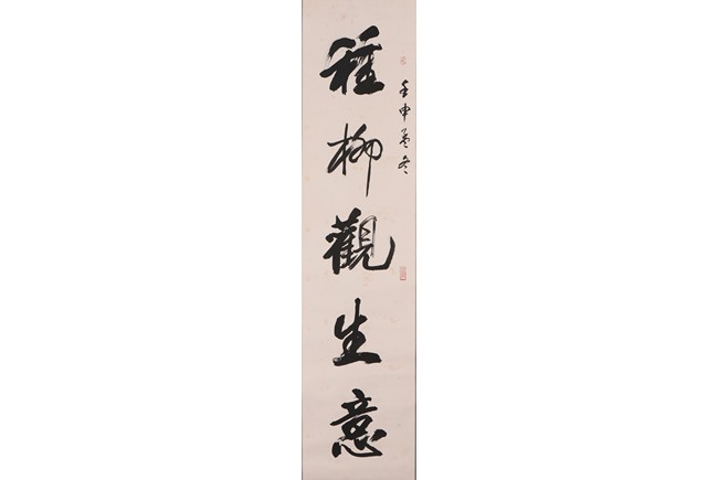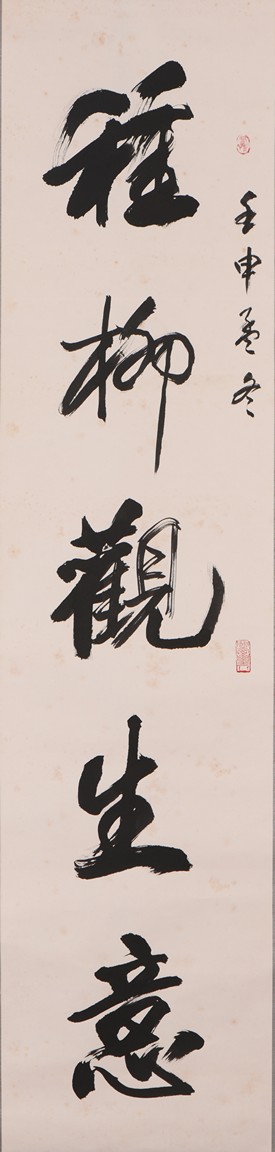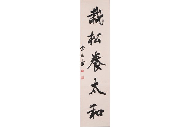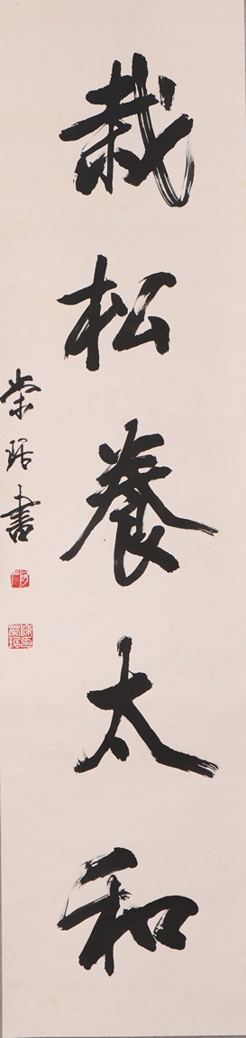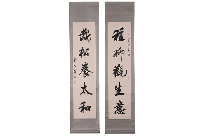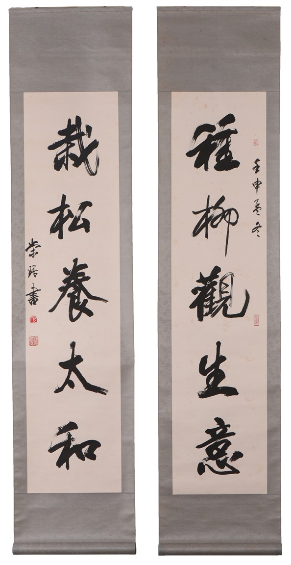 Ink on paper. Running script couplet. Hanging scroll. Signed Rongju and with four seals of the artist.