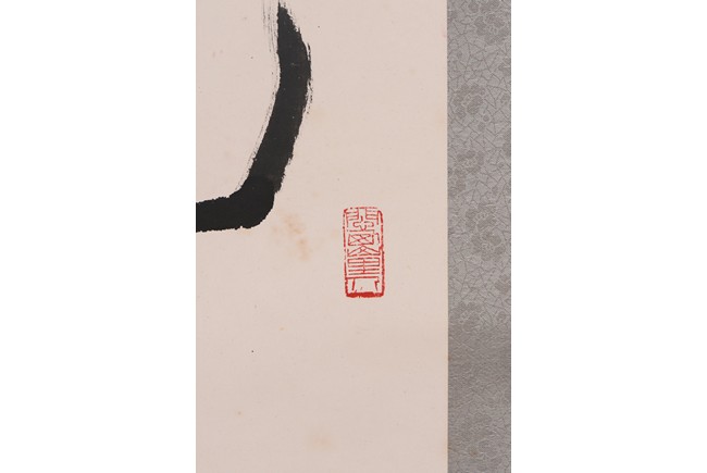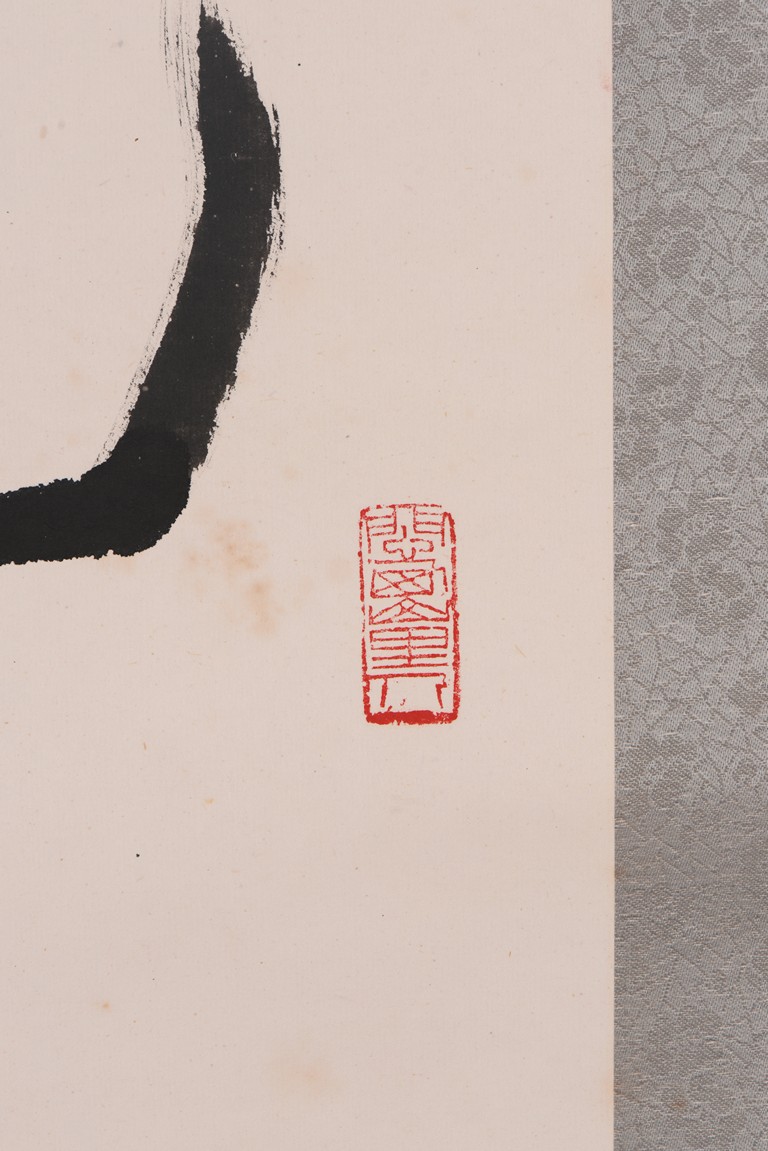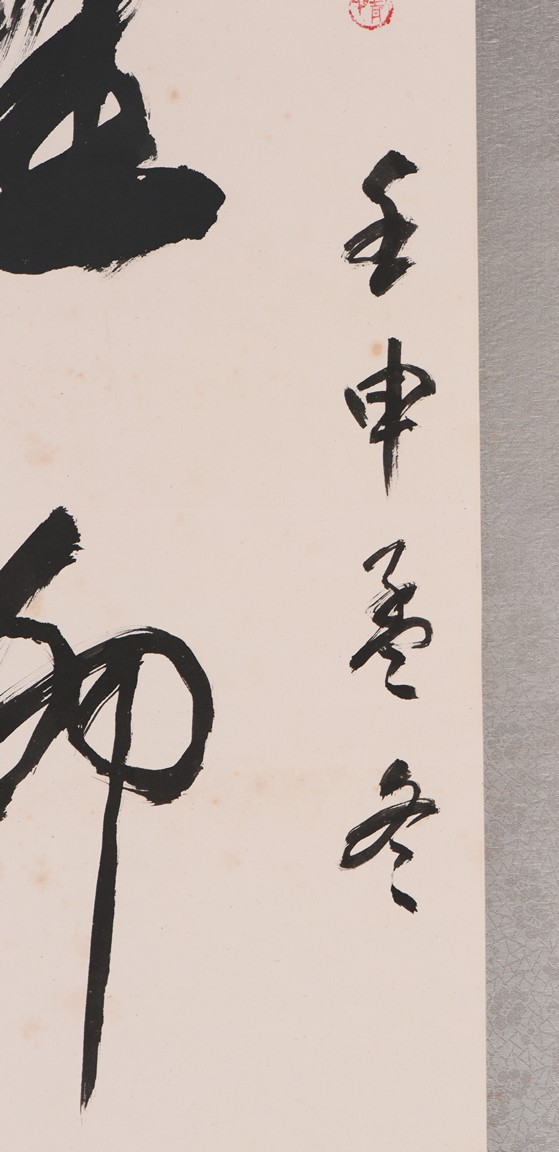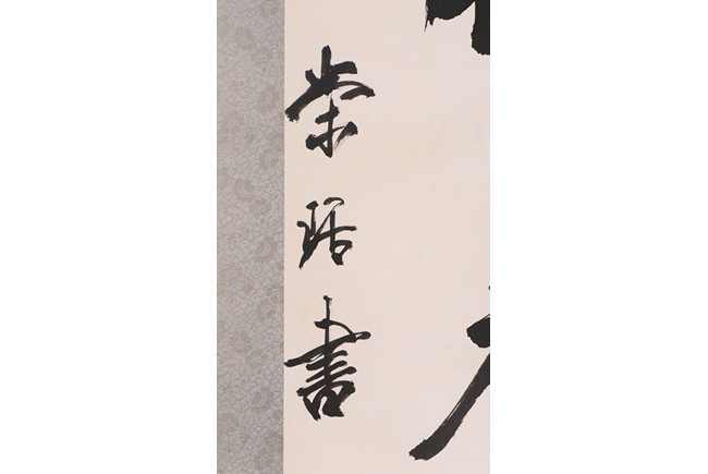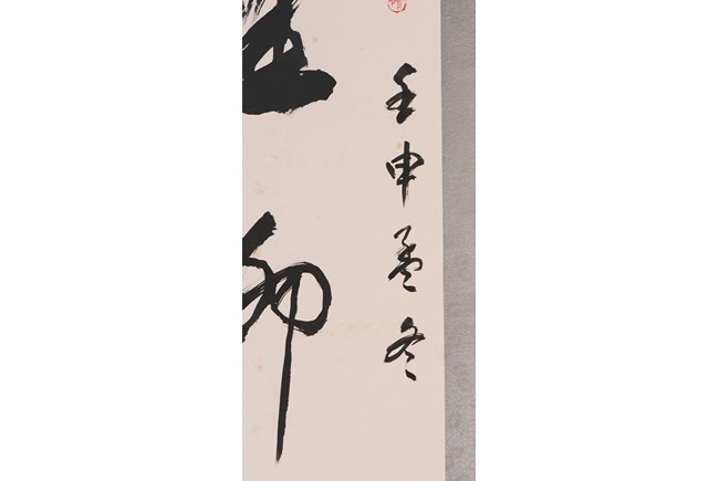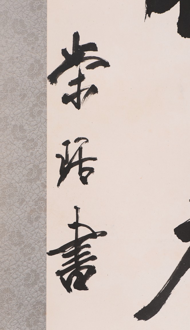 Ink on paper. Running script couplet. Hanging scroll. Signed Rongju and with four seals of the artist.