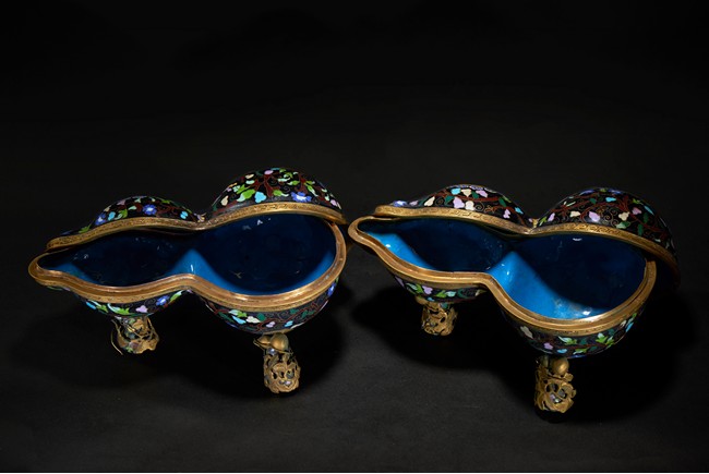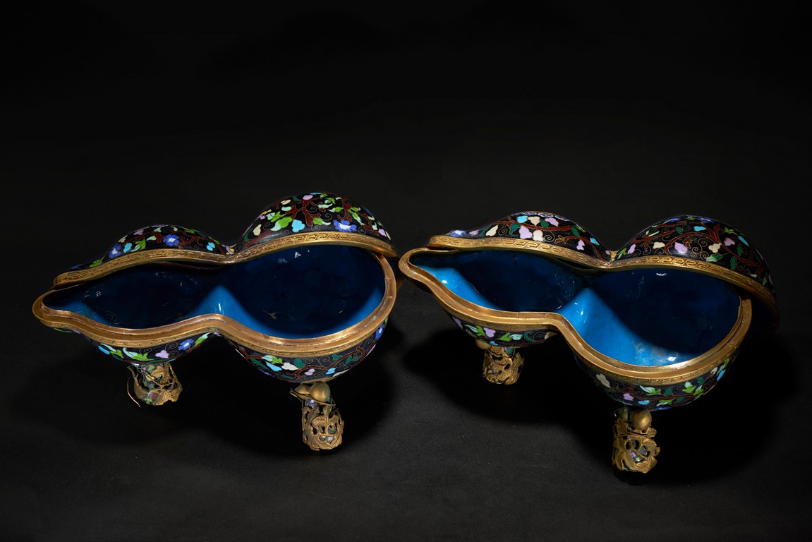 Each of double gourd case form, the upper half case enamelled with two character 'Da Ji', each encircled by ruyi-head border amid leafy scrolls, the lower half case supported on three knob feet wrapped by gilt-bronze leafy double gourds, all against cloisonne enamel black background of leafy vines. Qing Dynasty period.