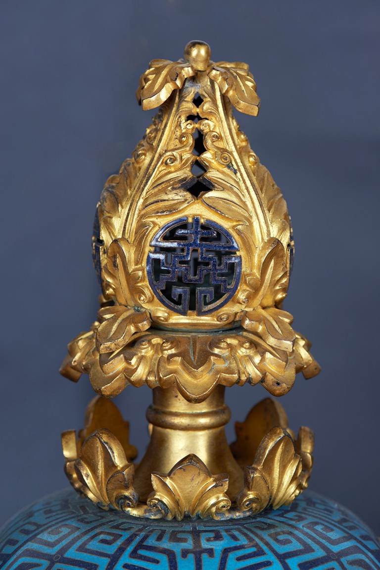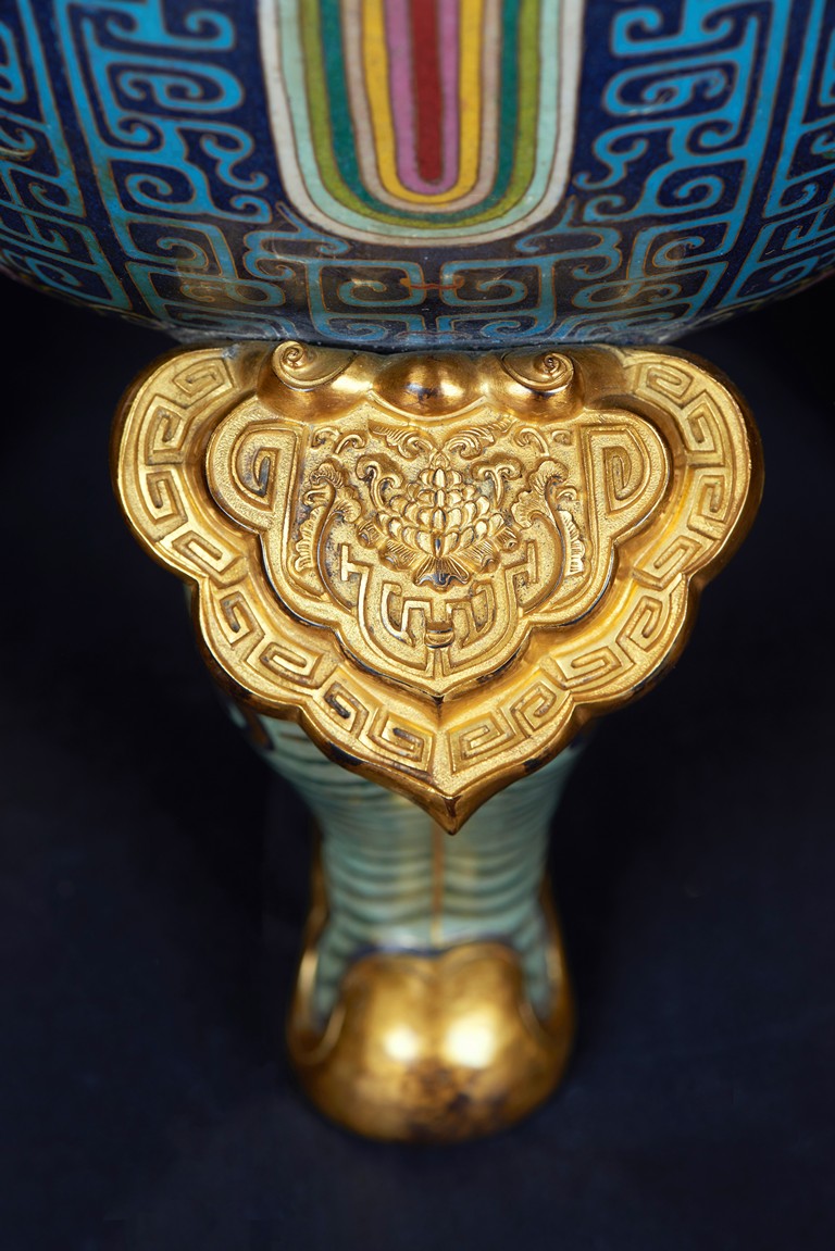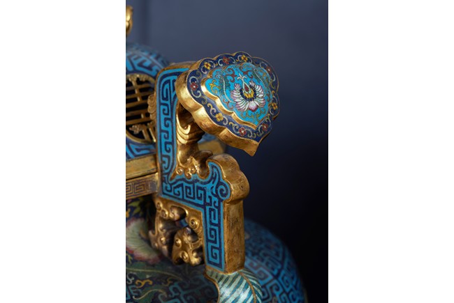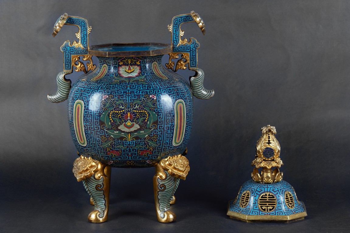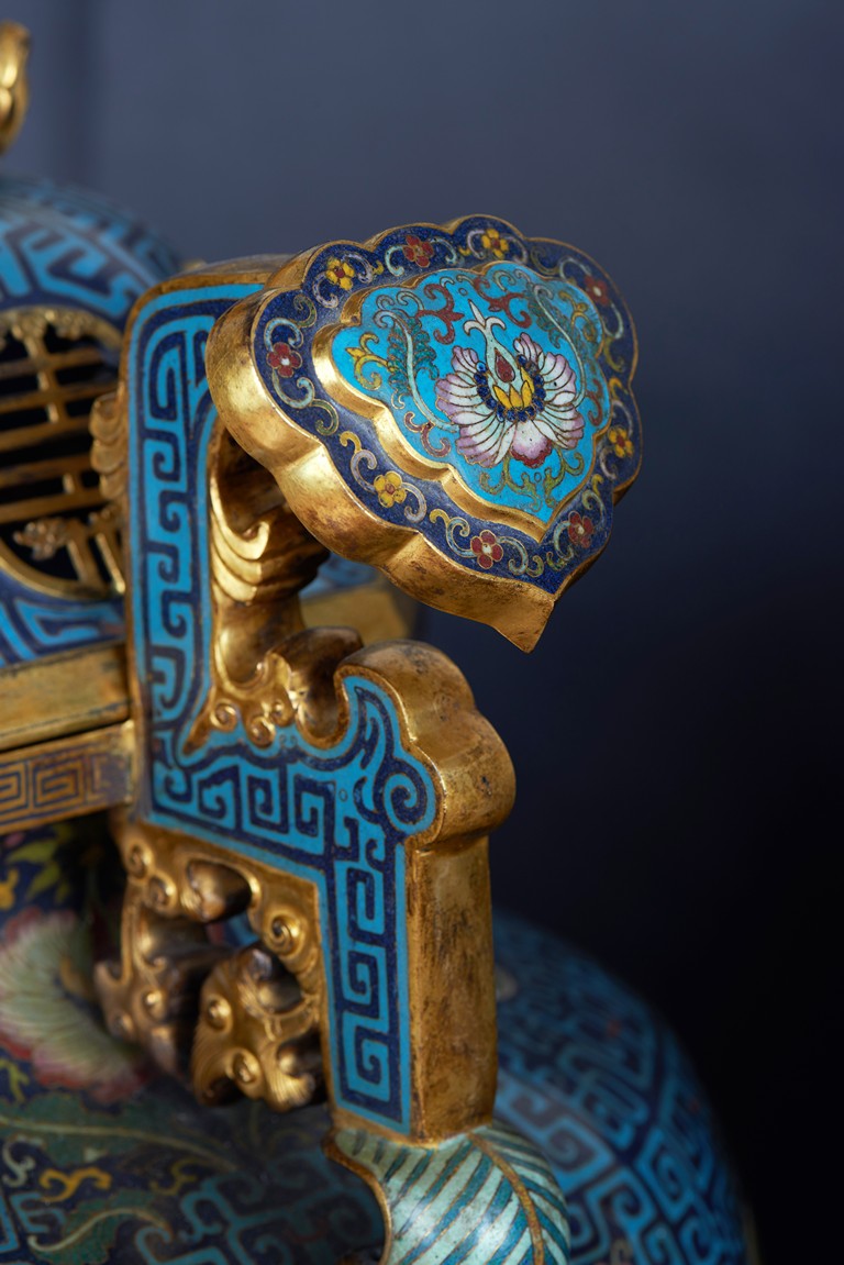 The body of globular form elaborately enamelled with lotus flowers borne on scrolled leafy branches, the shoulder and neck with similar decorations, all reserved on a dense key-fret background, two ruyi head shaped handles surmounted on the body and rim, the cover with gilt pagoda-shaped finial, all supported on four paw-like feet, the underside with six character 'QIANLONG' mark.
