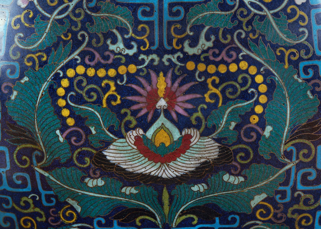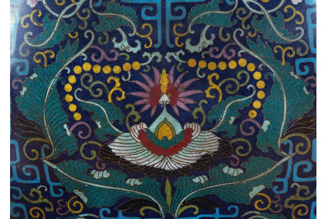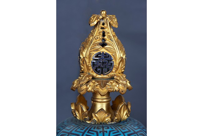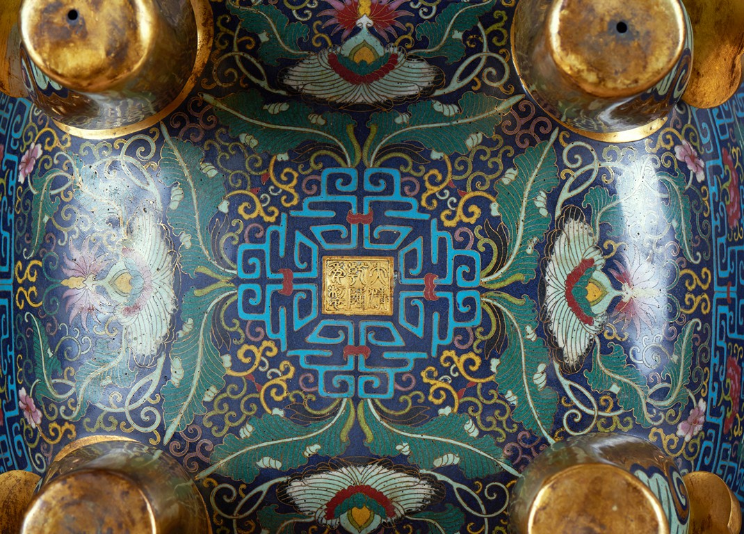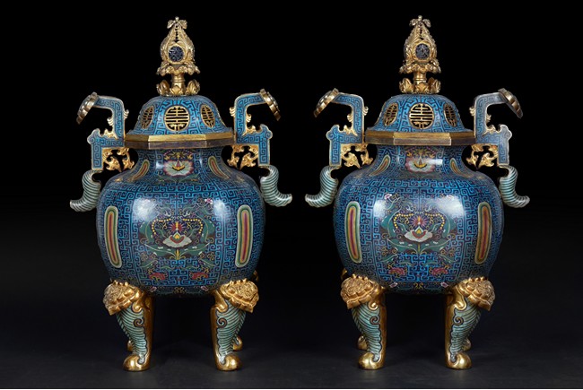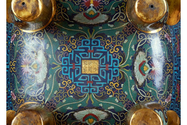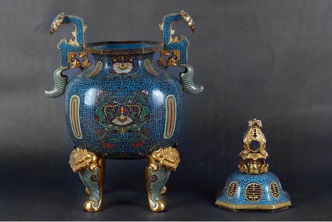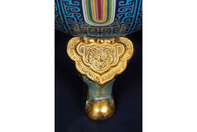 The body of globular form elaborately enamelled with lotus flowers borne on scrolled leafy branches, the shoulder and neck with similar decorations, all reserved on a dense key-fret background, two ruyi head shaped handles surmounted on the body and rim, the cover with gilt pagoda-shaped finial, all supported on four paw-like feet, the underside with six character 'QIANLONG' mark.