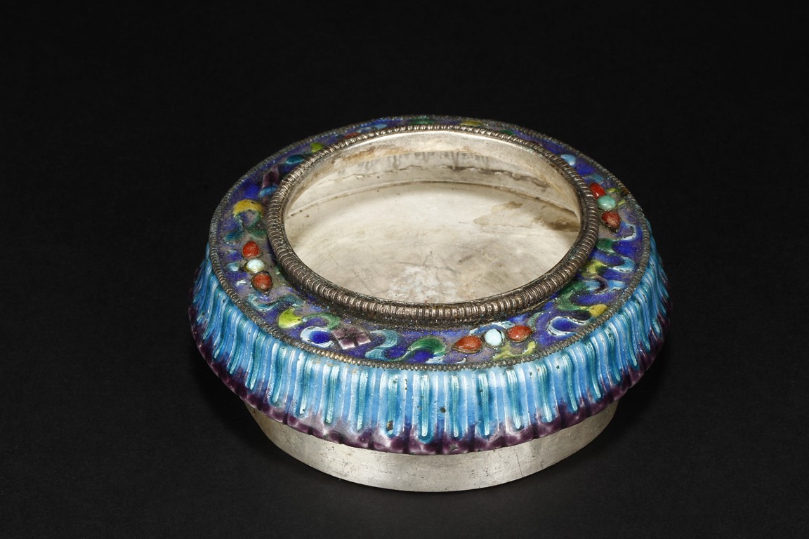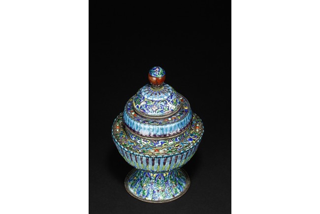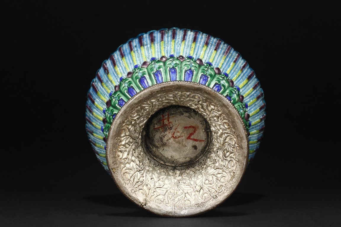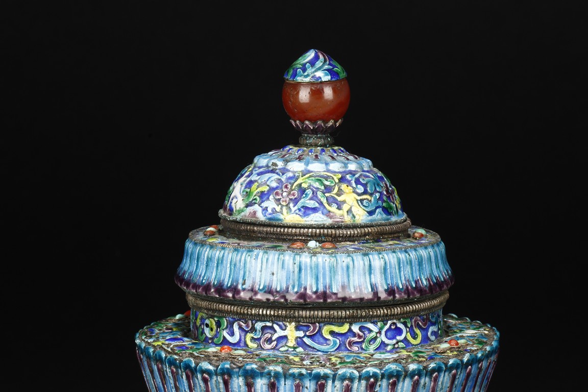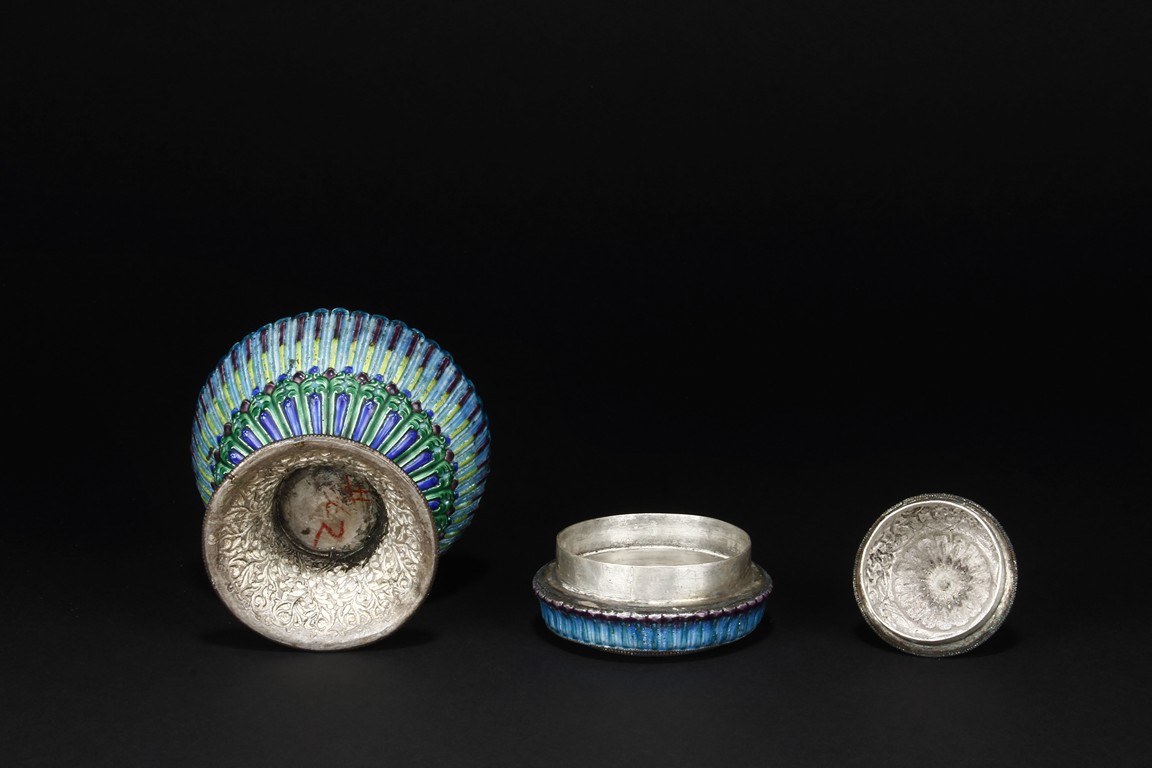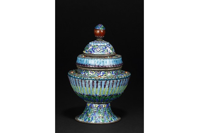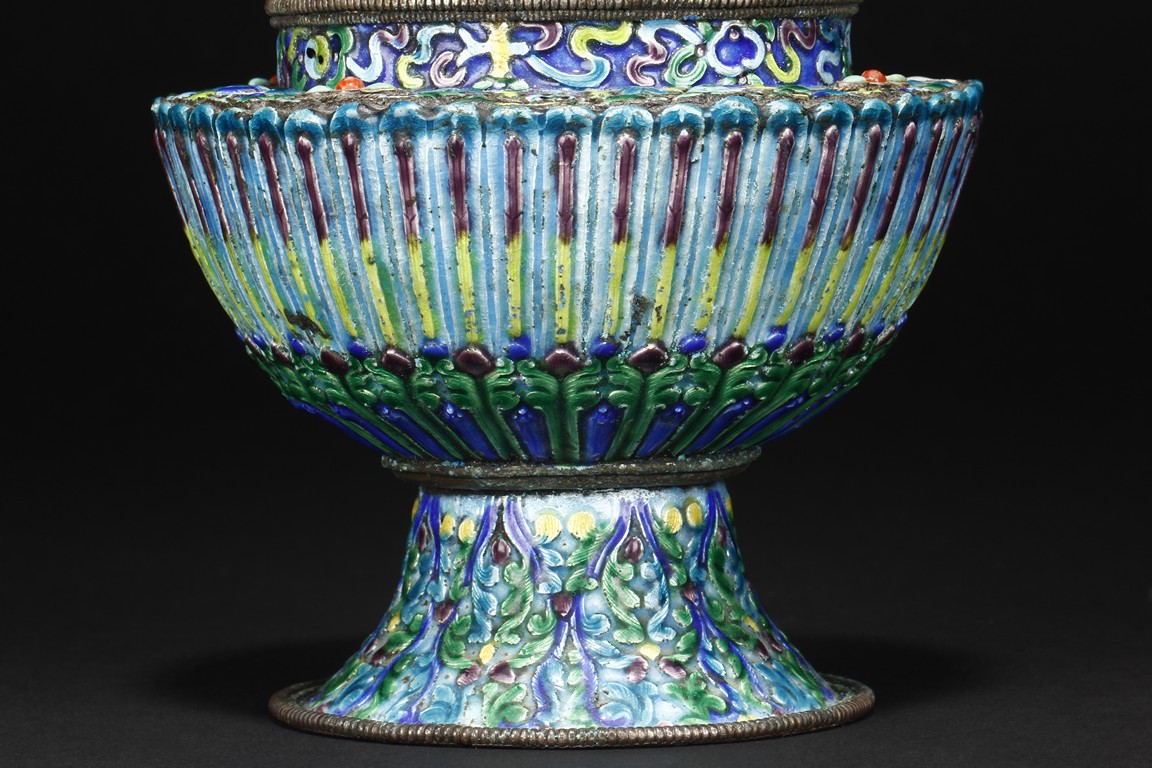 Of multiple conical form, the vessel's body decorated with floral designs on the side, above scrolling banana leaf patterns, supported by splayed round foot ring, decorated with vines, leaves, flowers, and tendrils. The lid topped by a red bead finial. Qing Dynasty period.