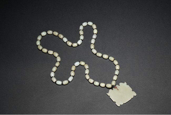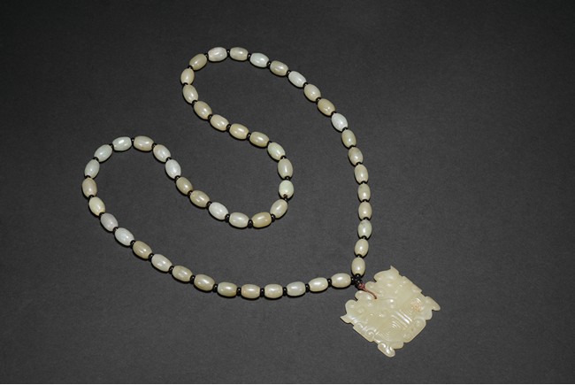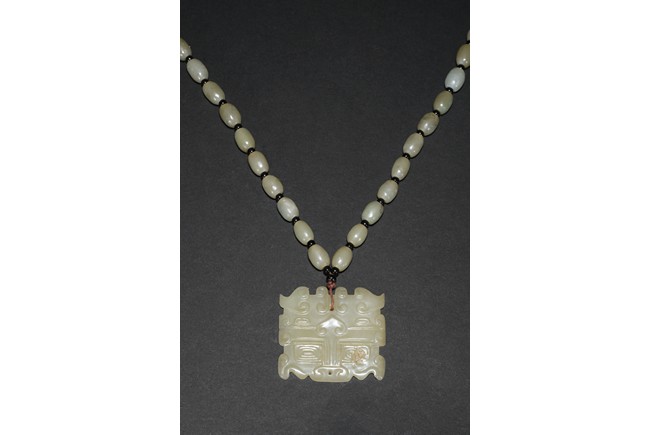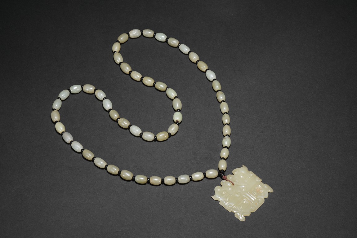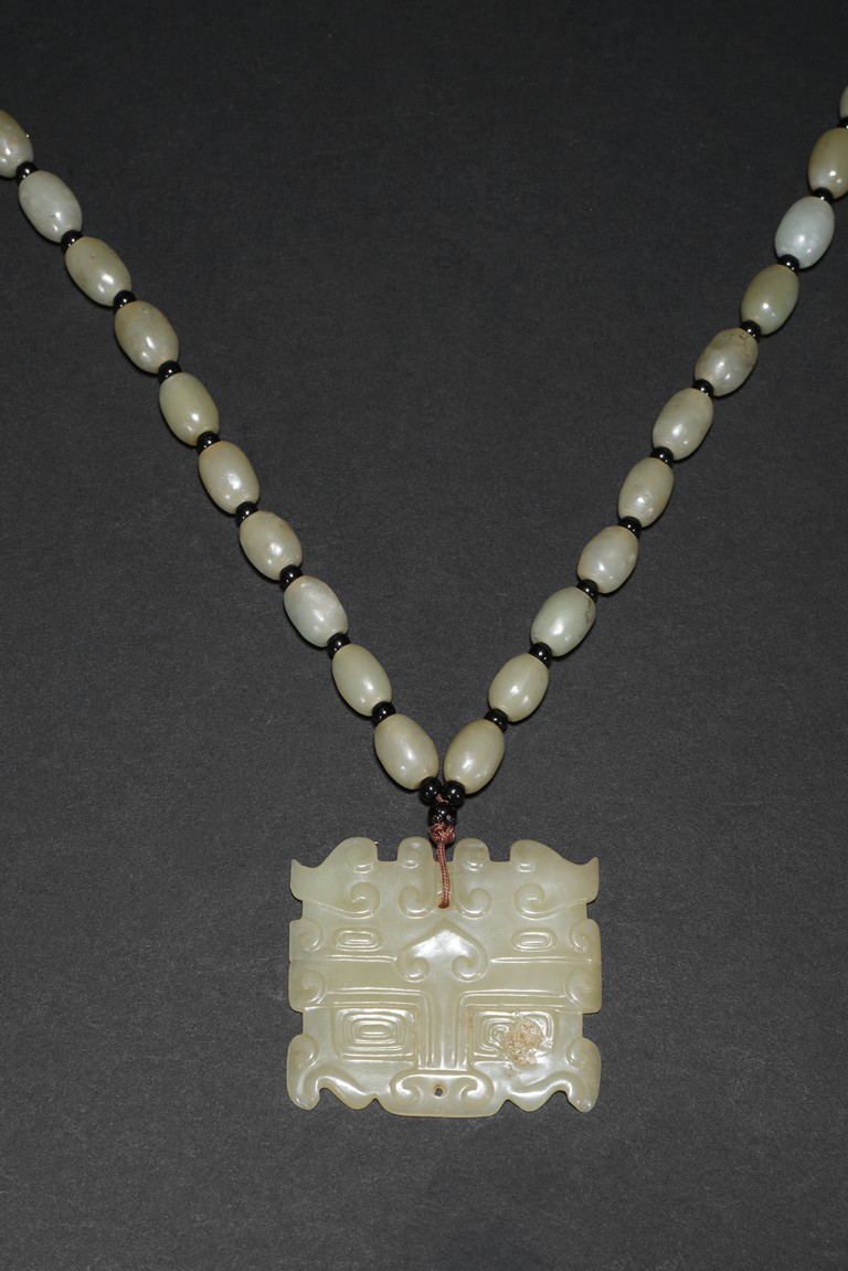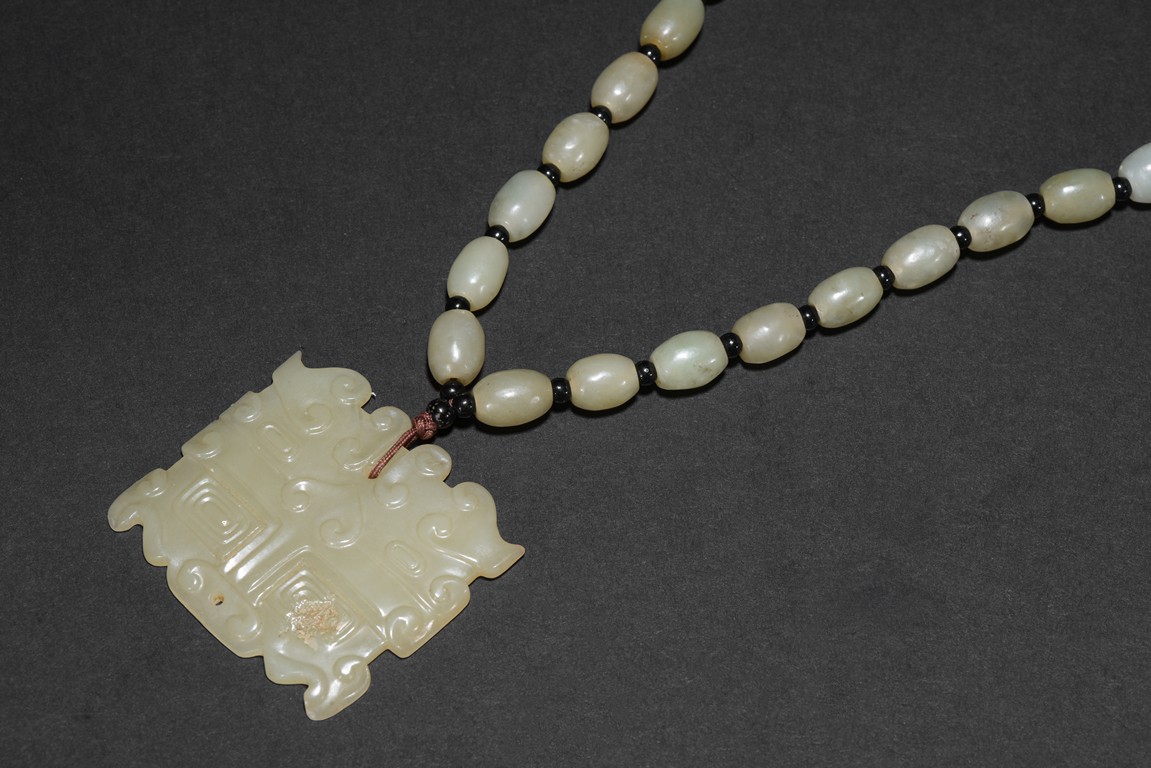 The carved and pierced square jade plaque of stylized mythical beast mask, suspended from a necklace composed of numerous oblong shaped white jade beads. Qing Dynasty period.