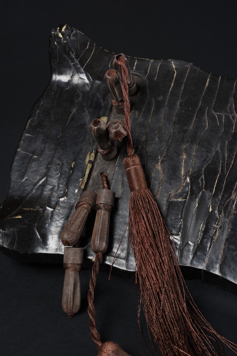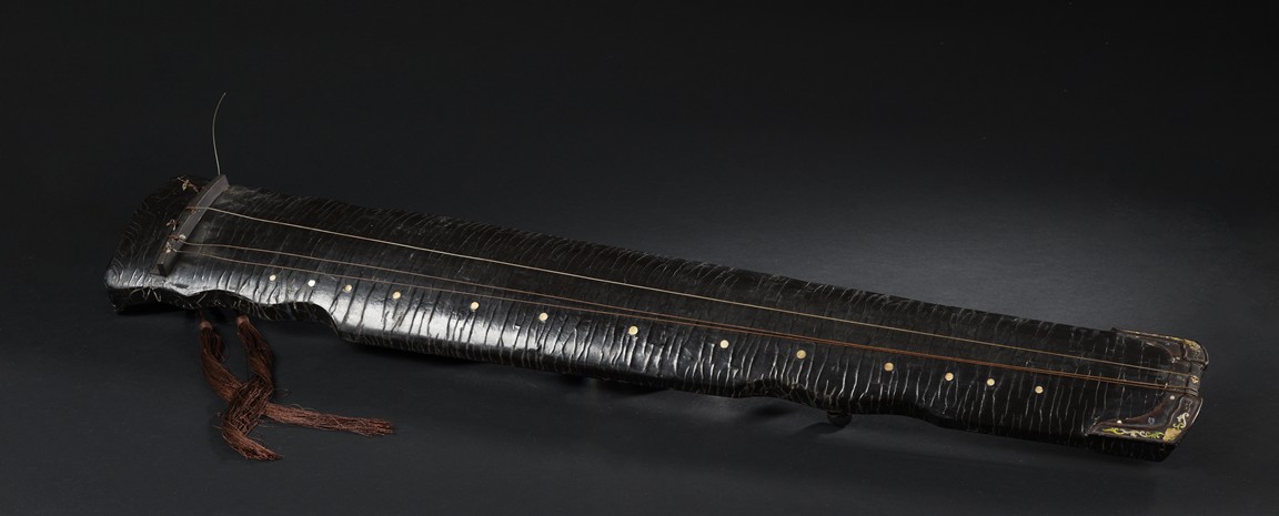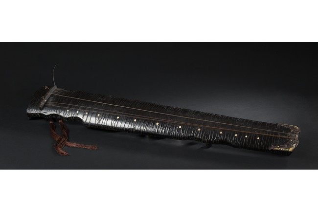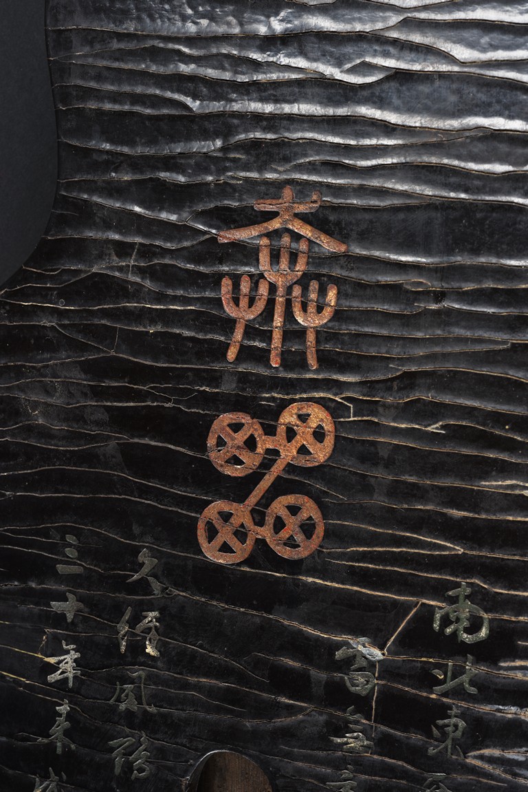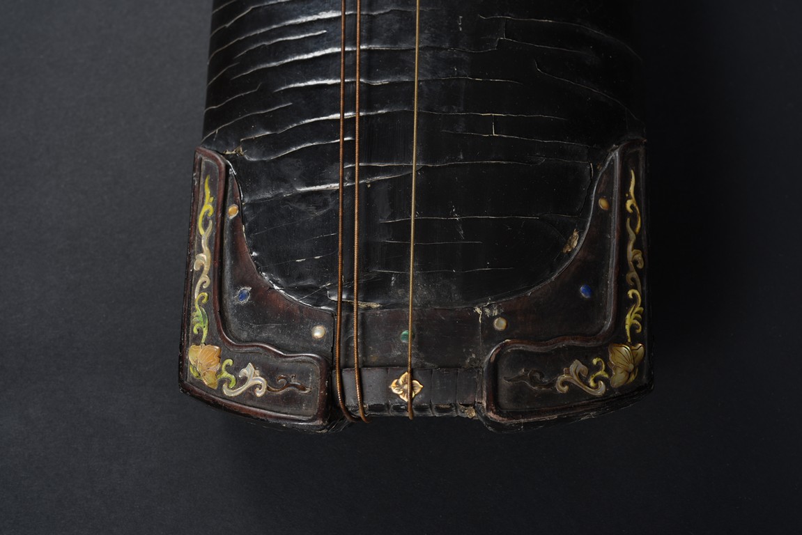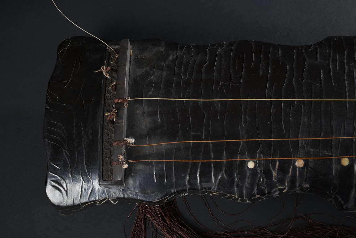 The surface of the long thin section of hollow lacquered wood mounted with three strings, the base incised with a two character inscription in seal script and two long colophons in running script with seal marks, all surfaces exhibiting an even vertical craquelure.