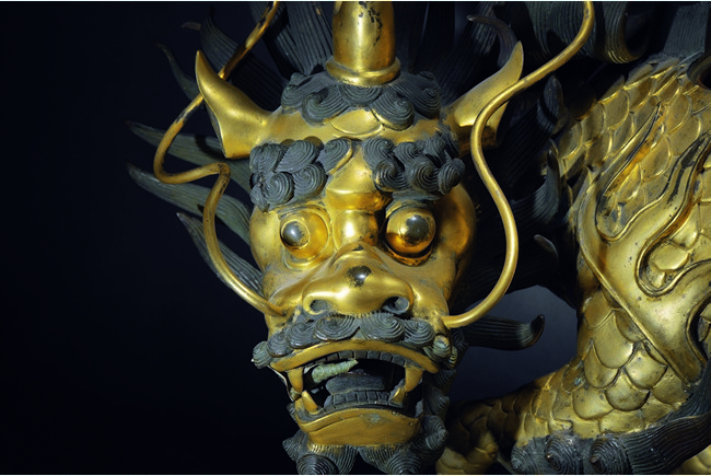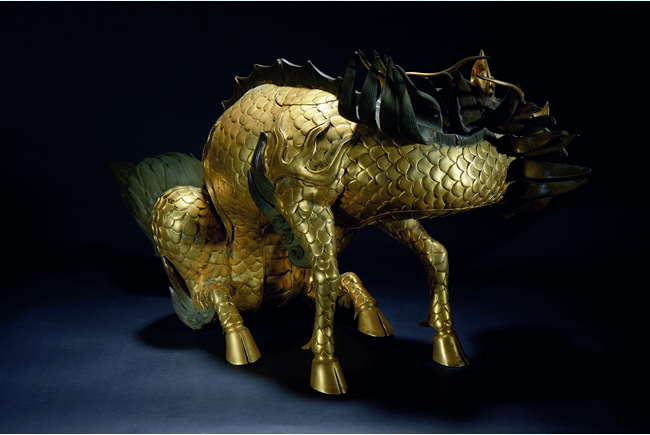 The censer is modelled as a qilin with head turned sharply to the side, with mouth agape in roar, with incised mane and tail, the scales on the body richly applied in gilt, the cover finely incorporated into its back. Late Qing Dynasty period.