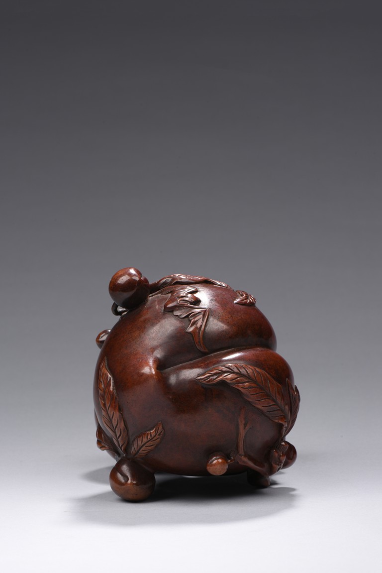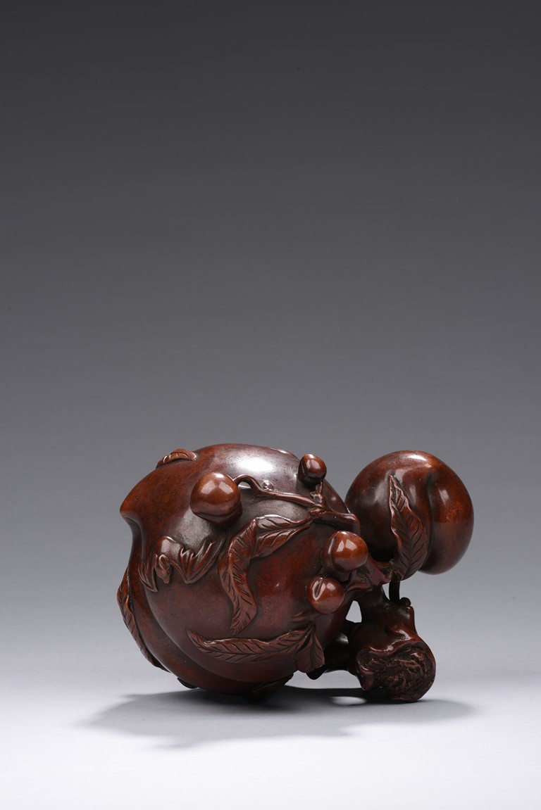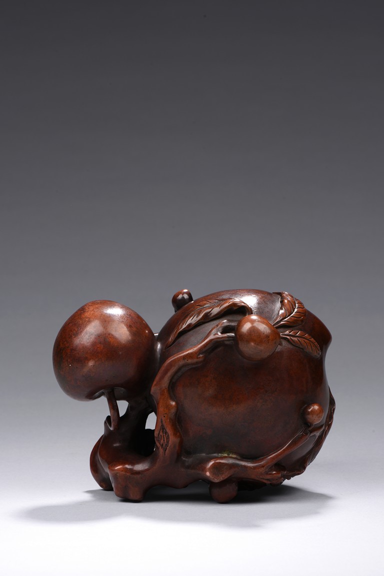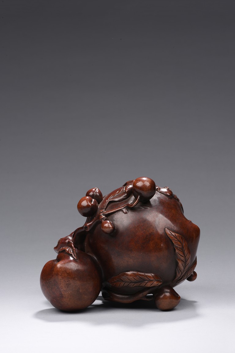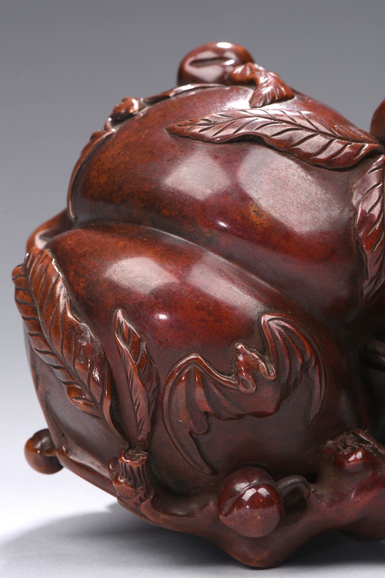 Naturalistically cast in the form of one larger and smaller peach and a bunch of tiny peach growing from a gnarled leafy branch carved in high relief, each peach borne on a flowering leafy branch extending up the sides, a bat with outstretched wings perched on the larger peach. Qing Dynasty period.