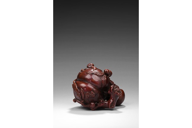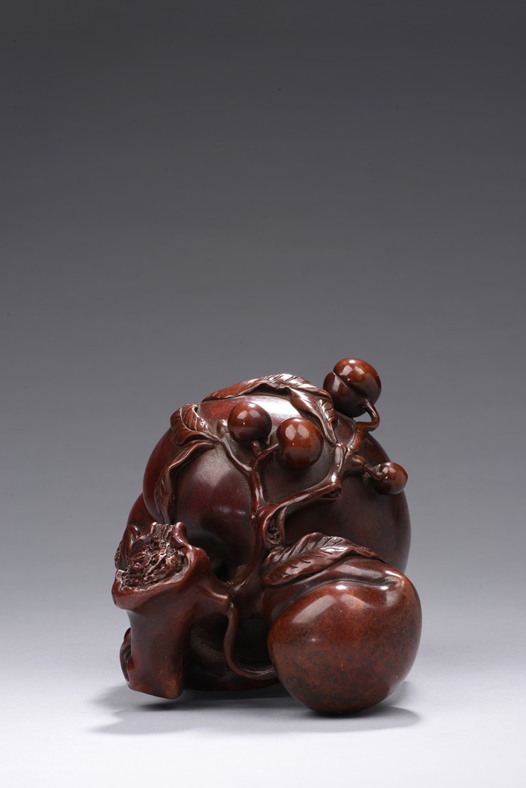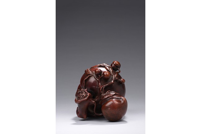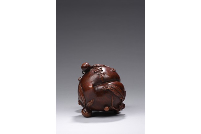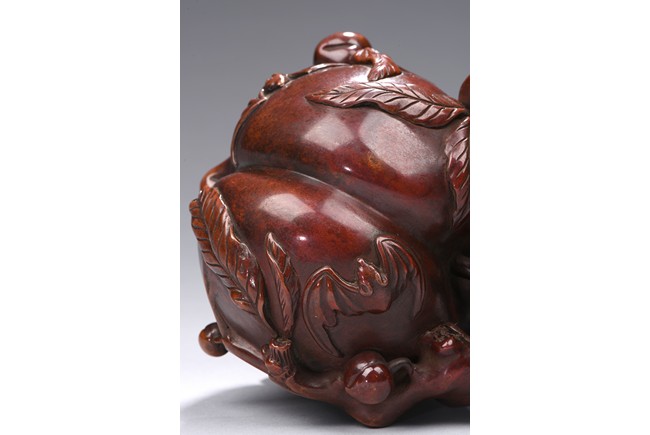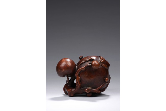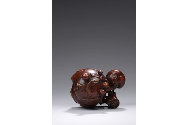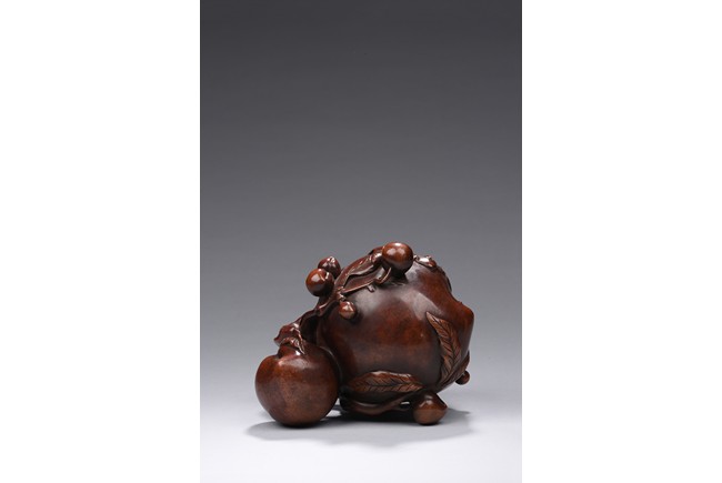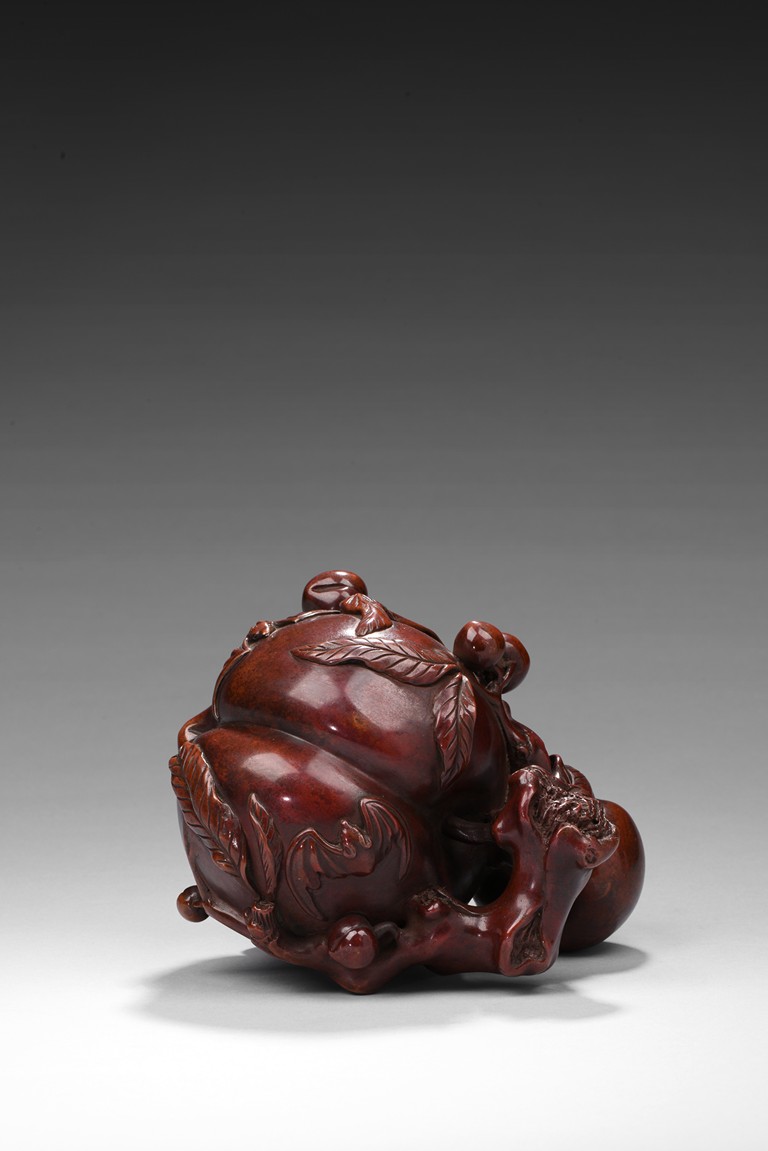 Naturalistically cast in the form of one larger and smaller peach and a bunch of tiny peach growing from a gnarled leafy branch carved in high relief, each peach borne on a flowering leafy branch extending up the sides, a bat with outstretched wings perched on the larger peach. Qing Dynasty period.
