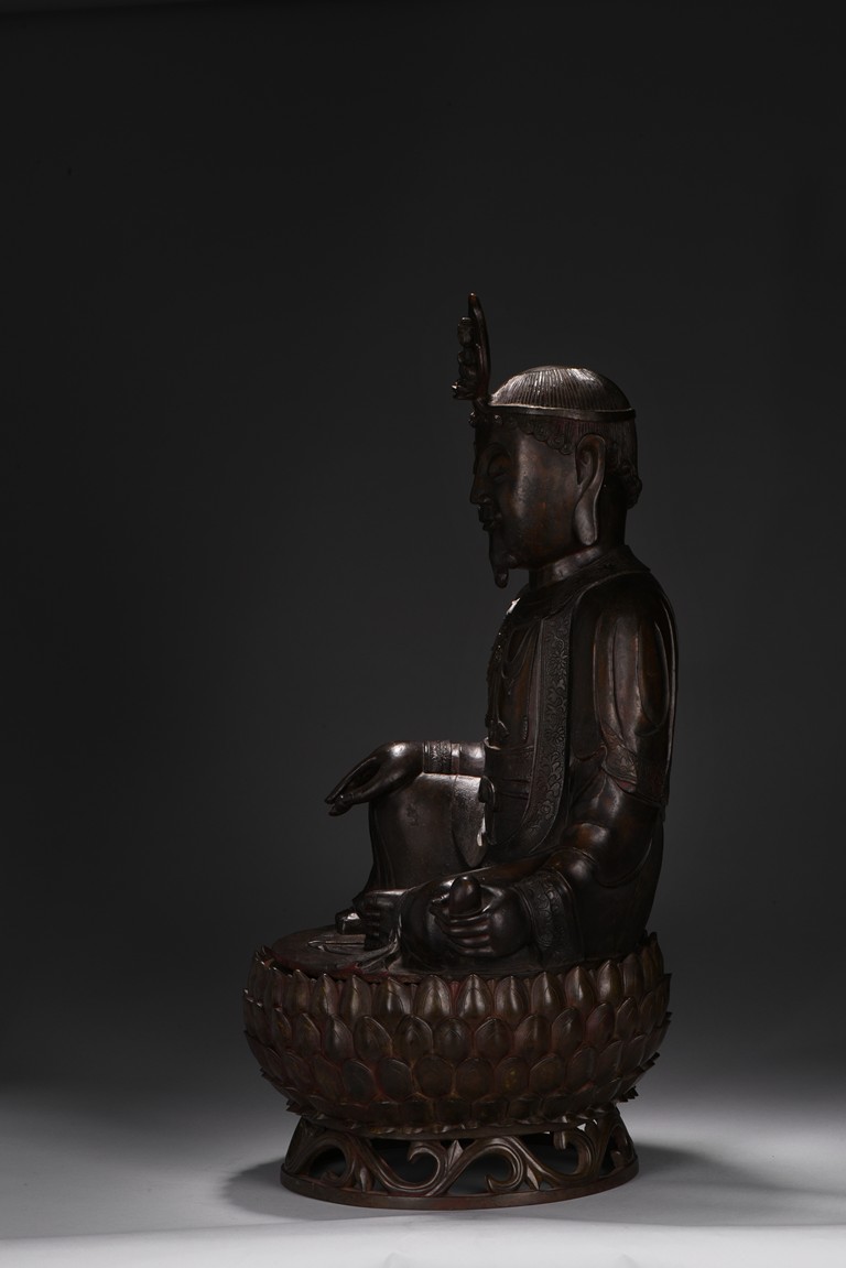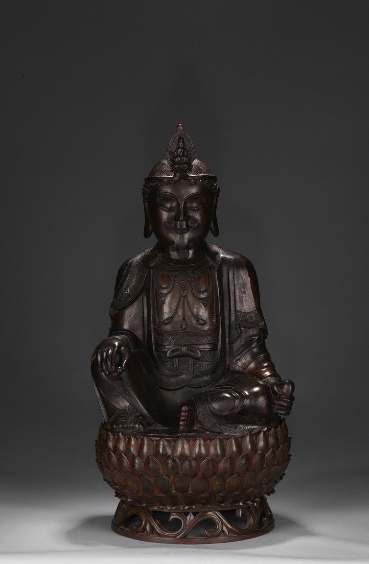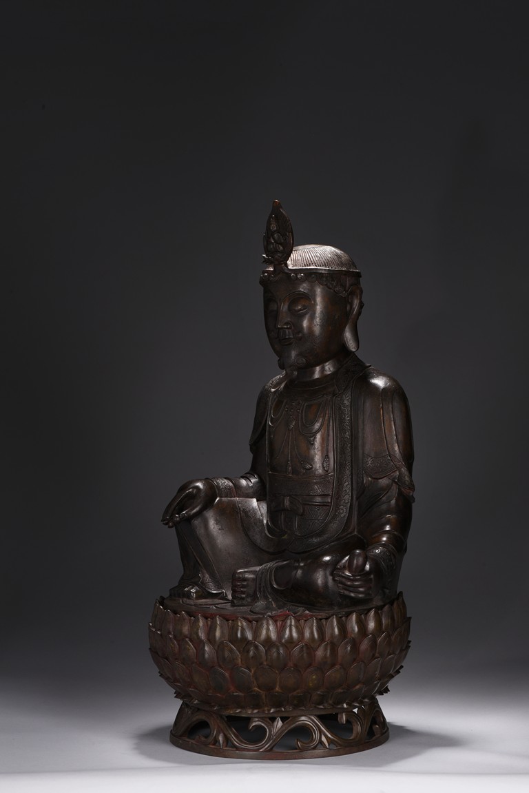 Shown seated upon a lotus stand, with right hand rested on raised right knee, wearing draped robe with bare chest adorned with jewelry, the face with meditative expression.