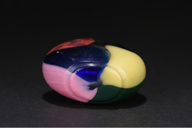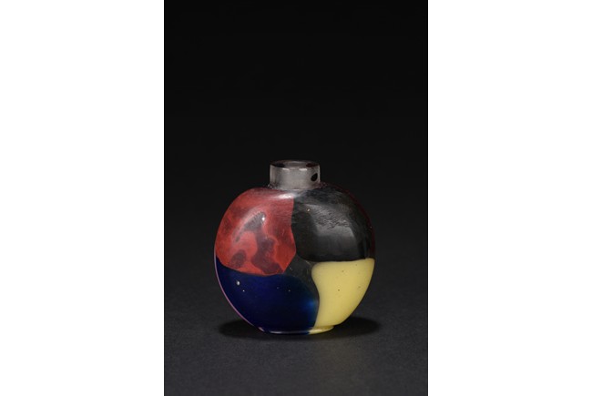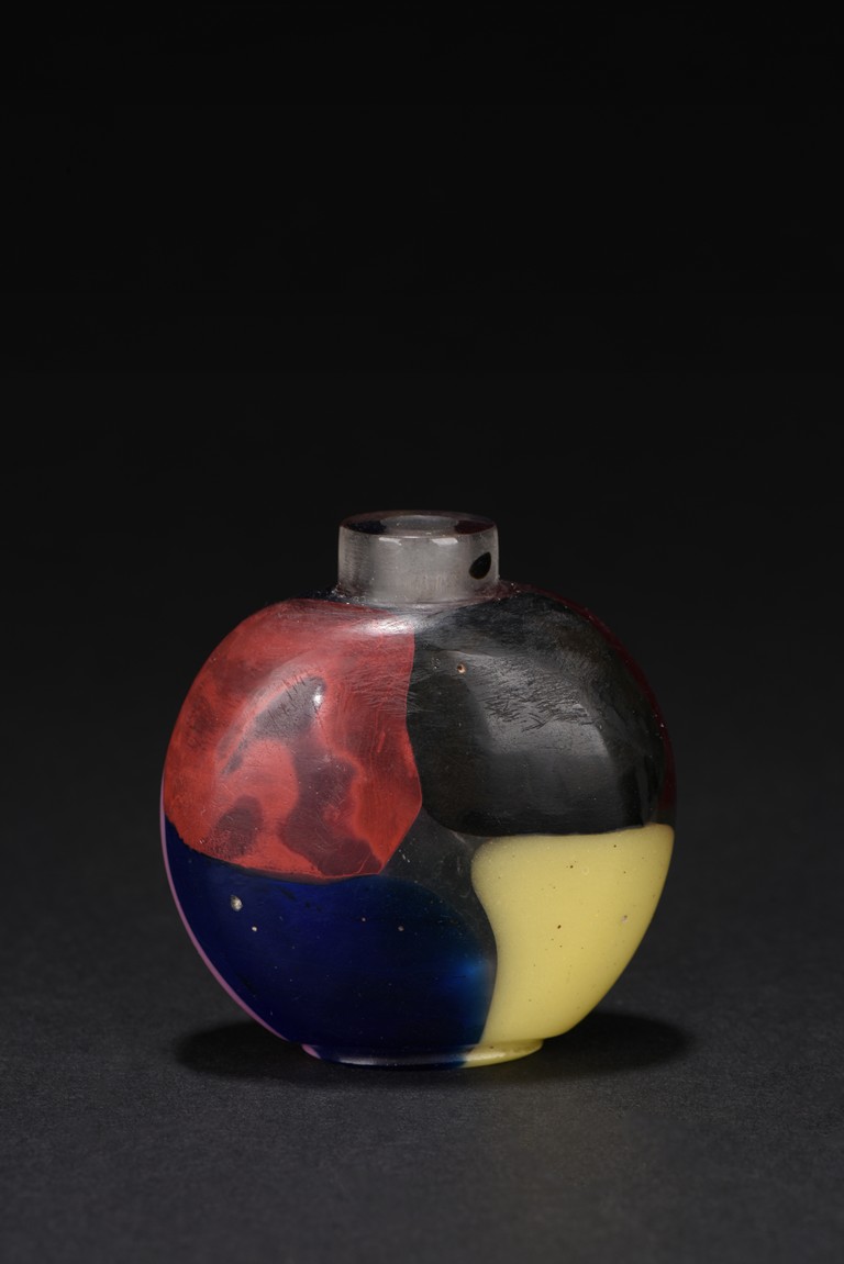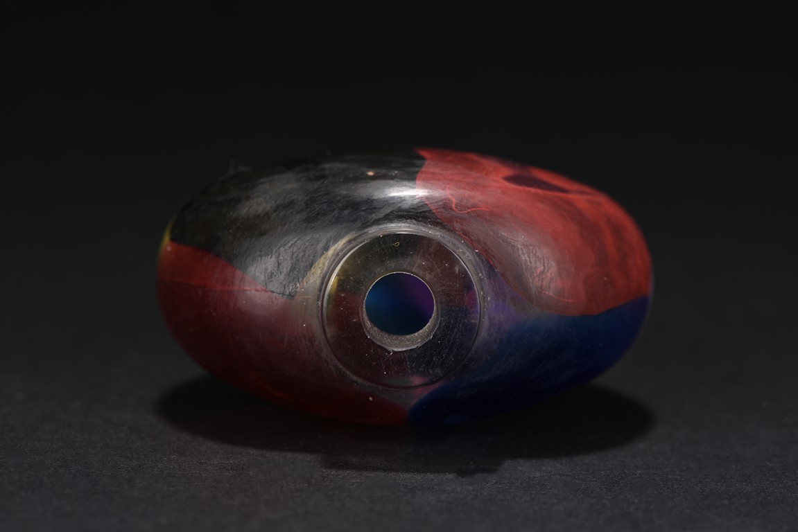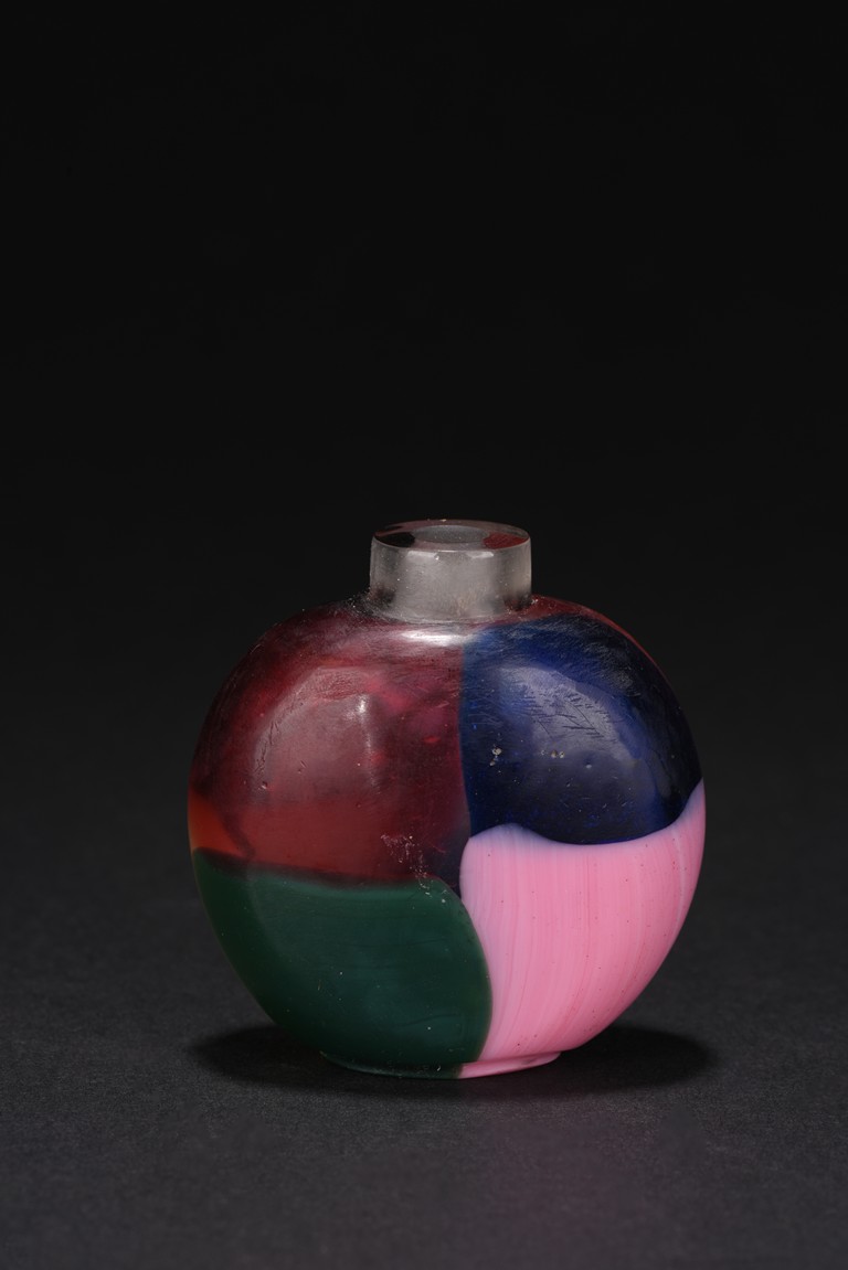 Of flattened rounded form,raised on short circular foot, one side with dark blue, red, green and light yellow tone, the other side with light pink, ruby, dark blue and green color. Qing Dynasty period.