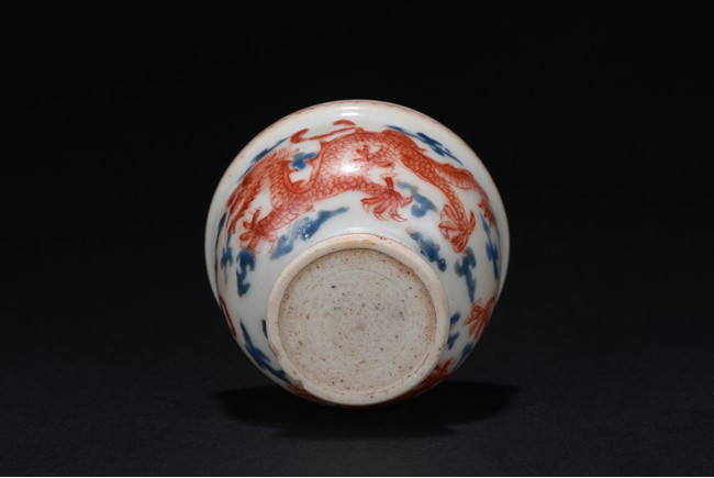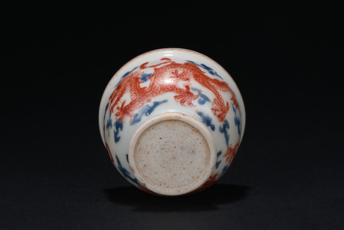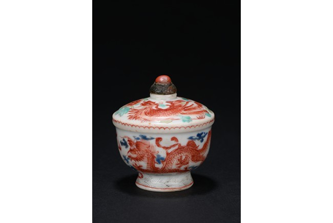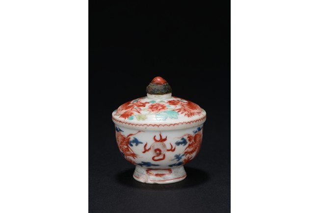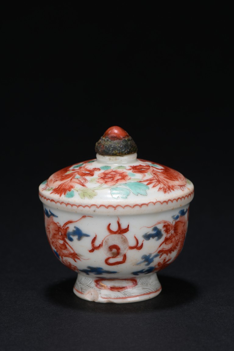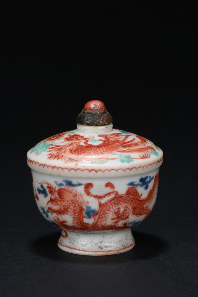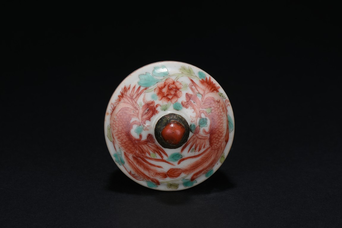 Raised on splayed foot, around the compressed rounded body enamelled with two confronting dragons chase for the flaming pearl amidst blue glaze bats, with a cover decorated with a pair of phoenixes appreciating the blooming peony and surmounted with a small rounded red bead finial. Qing Dynasty period.
