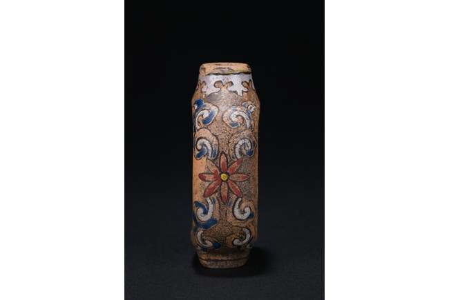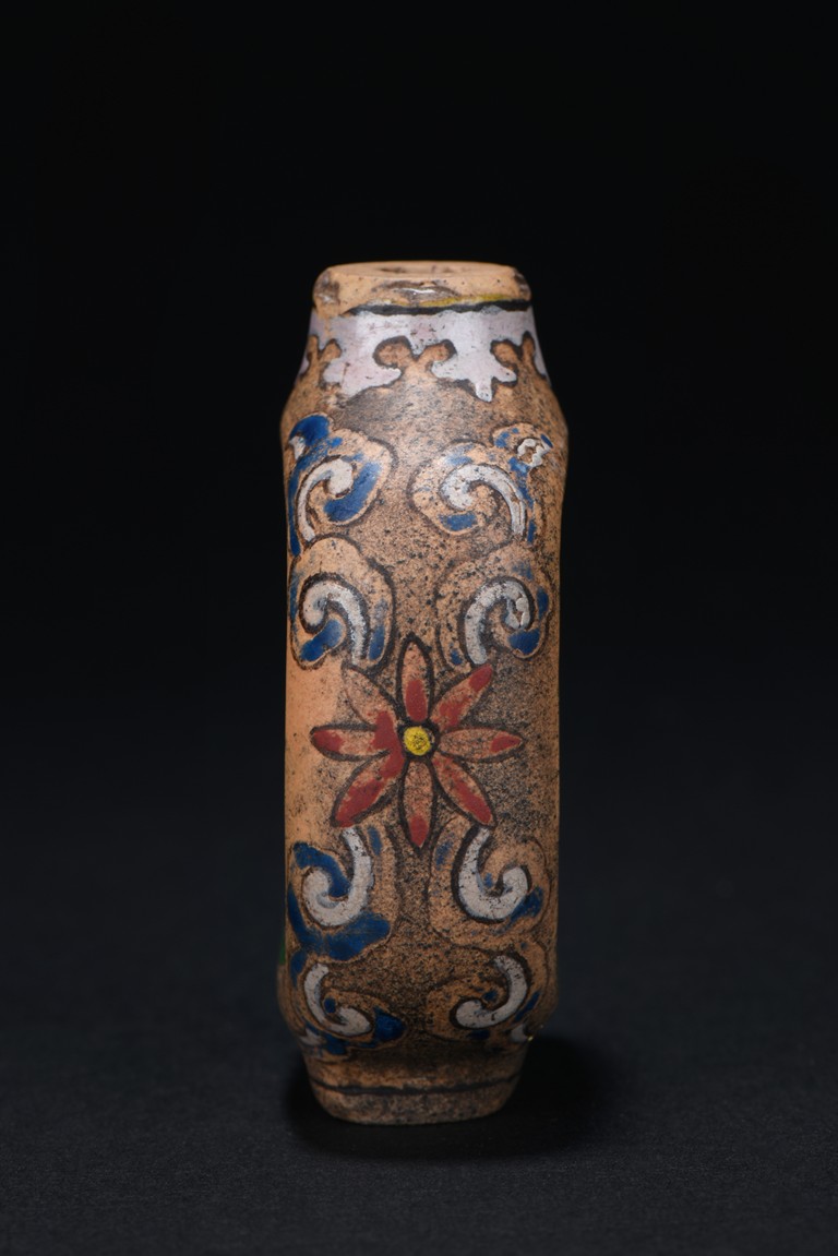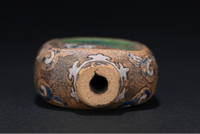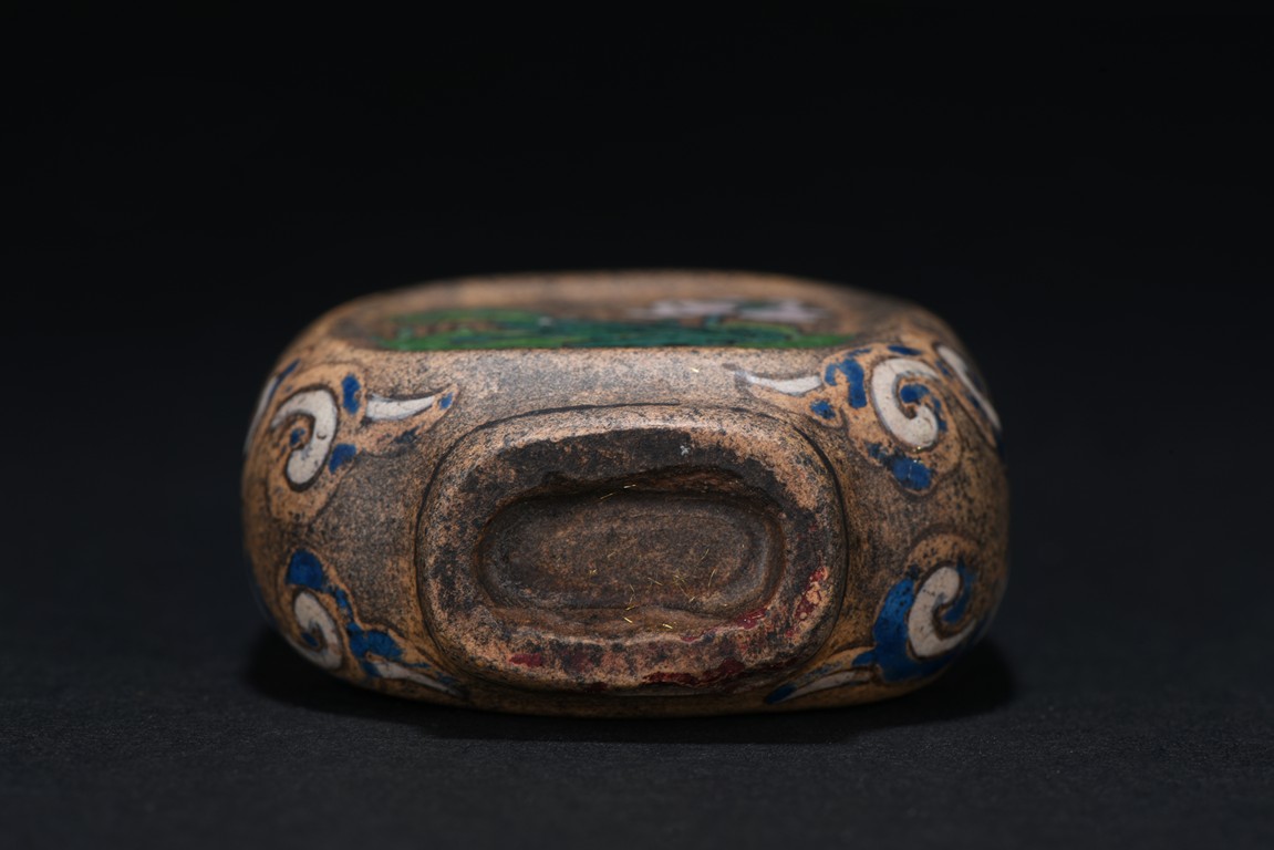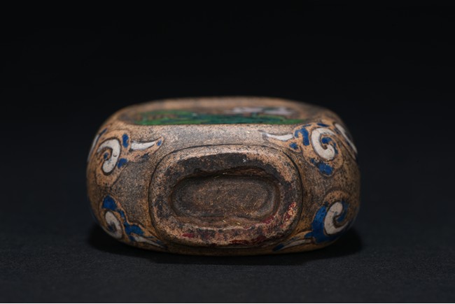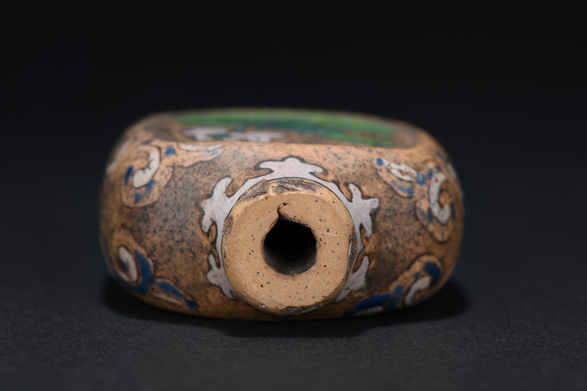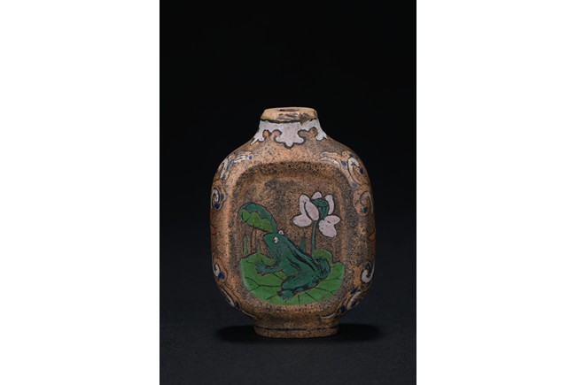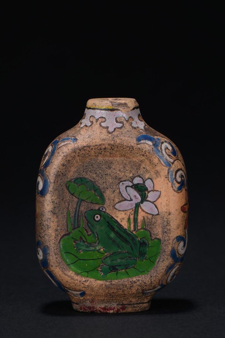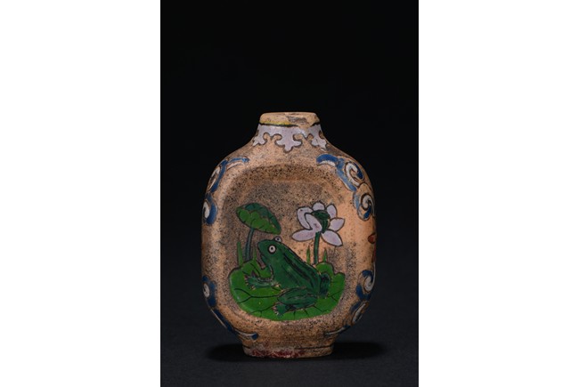 With a flat lip and protruding flat foot, finely painted on front and back with a green frog in a lotus pond, the neck decorated with white ruyi band and the sides with blue and white scrolled clouds pattern, made of zisha material.