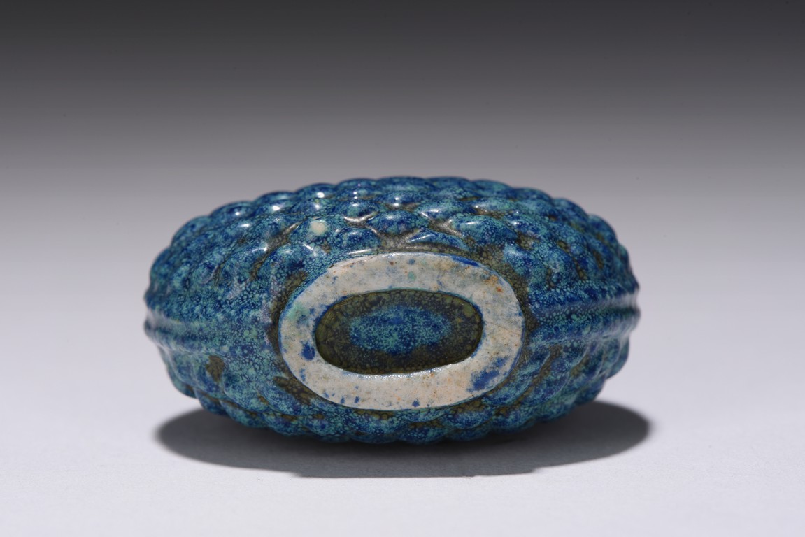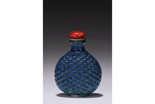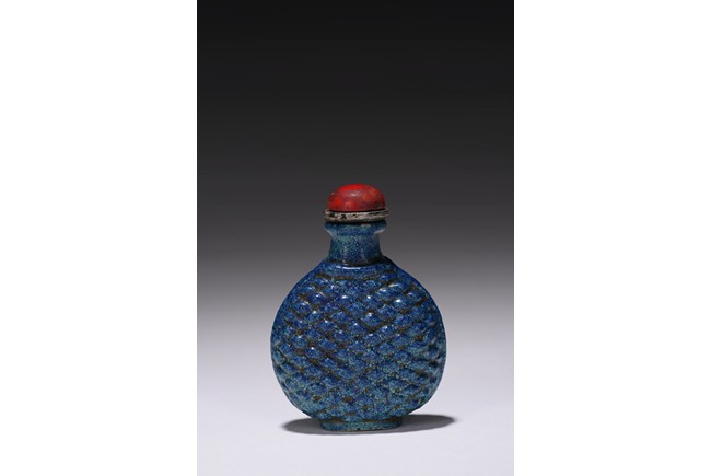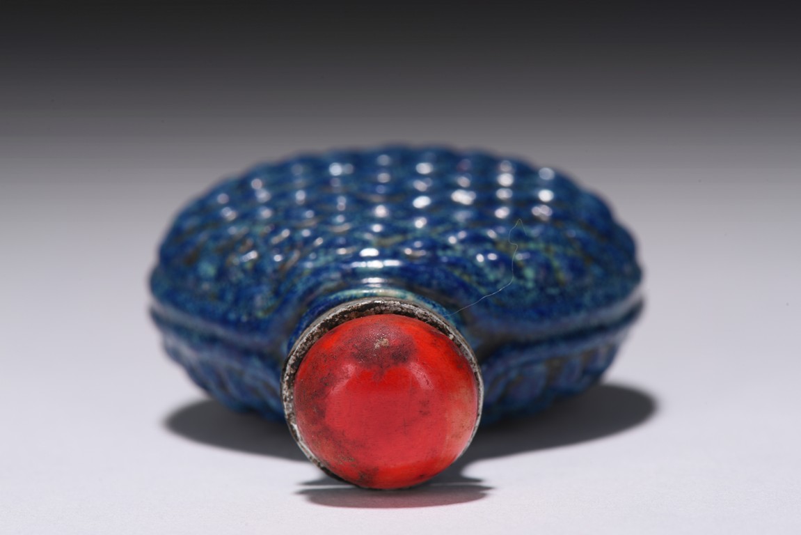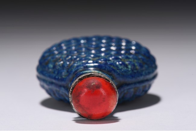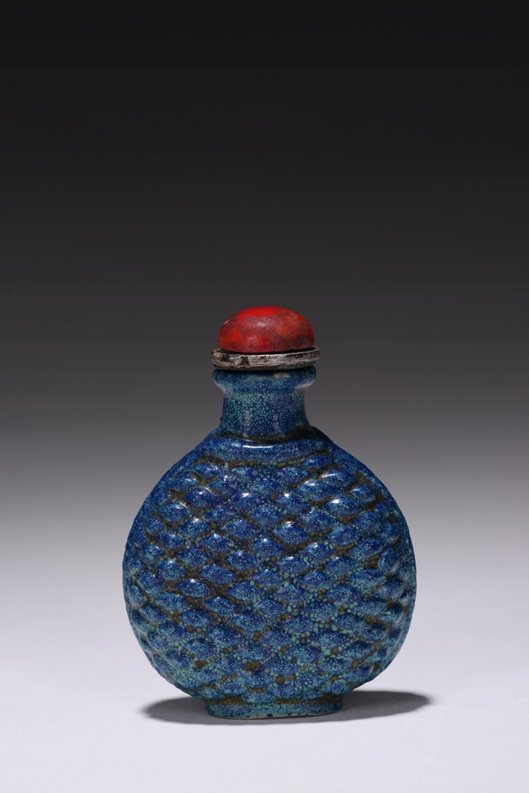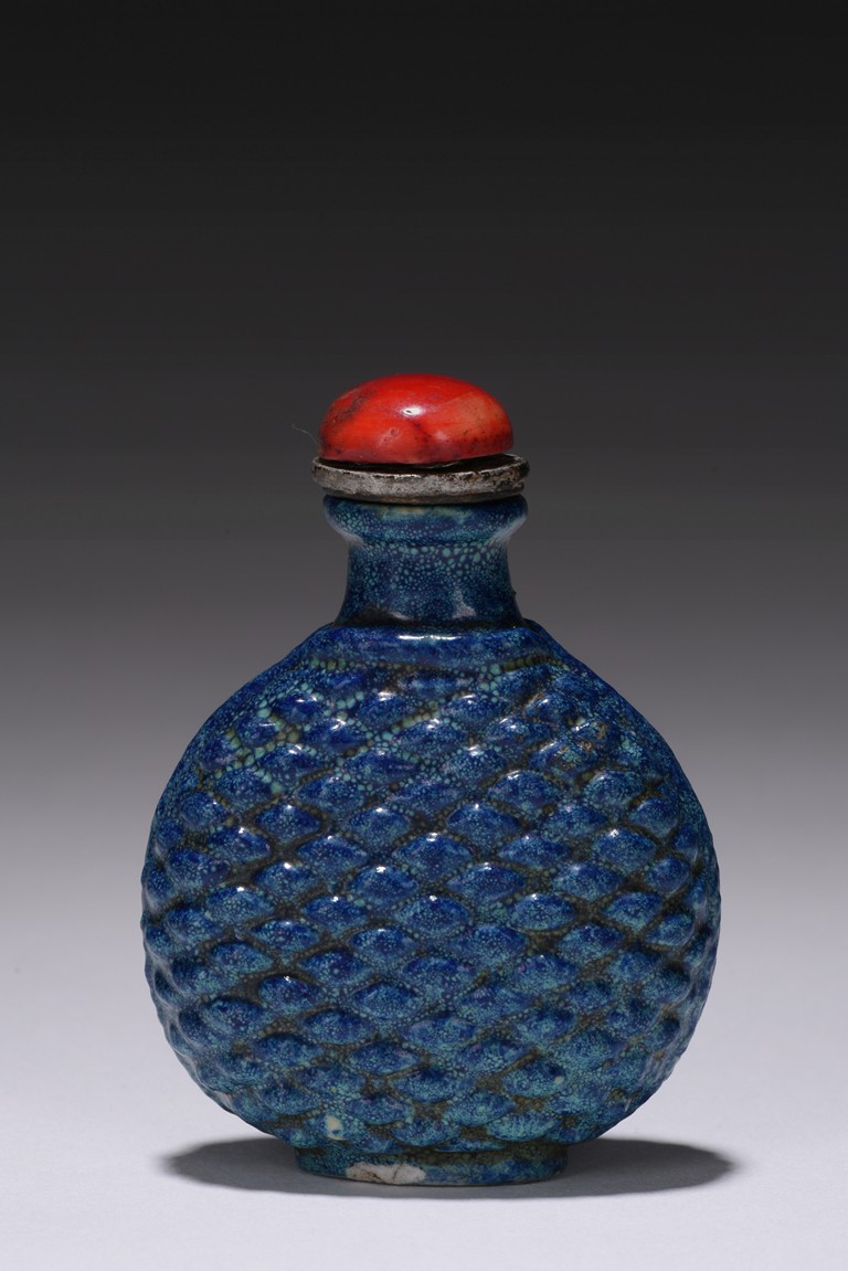 The rounded form snuff bottle raised on short oval foot with short straight neck and everted rim, the overall body carved with raised grid web pattern in robin's egg glaze, with a vermilion bead stopper. Qing Dynasty period.