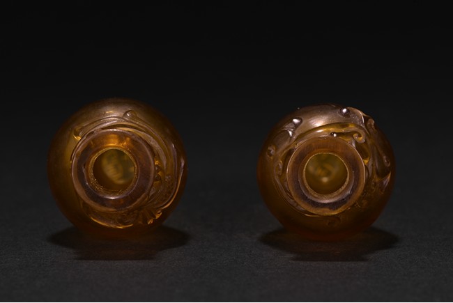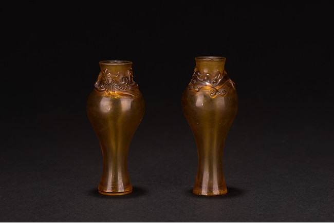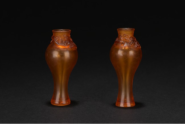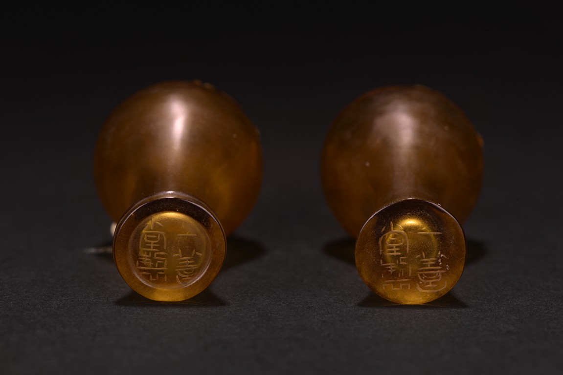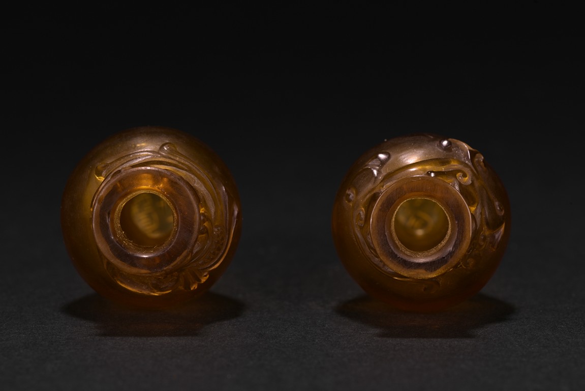 Each of slender baluster form with high shoulder, the long waisted neck decorated with a carved phoenix arounded in low relief, the base with a four character mark, the snuff bottle of semi-translucent amber tone. Qing Dynasty period.
