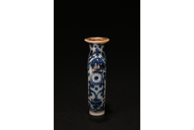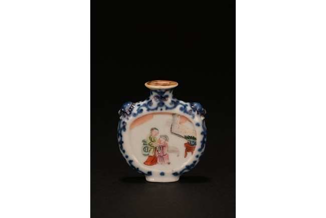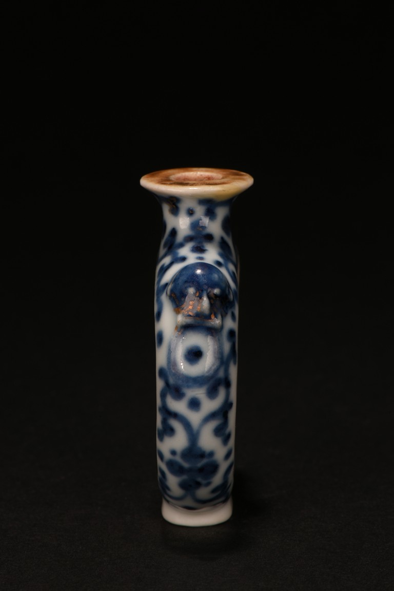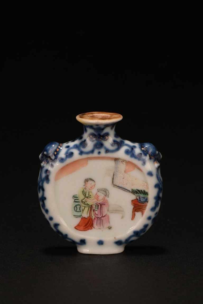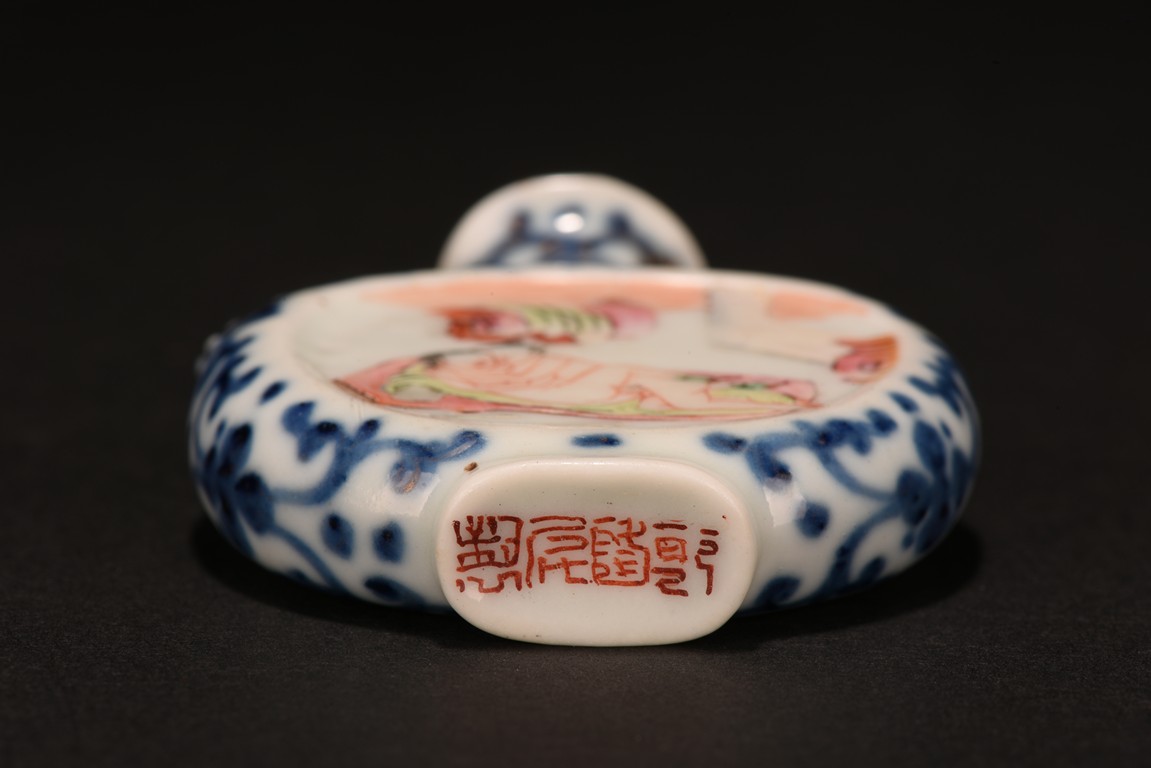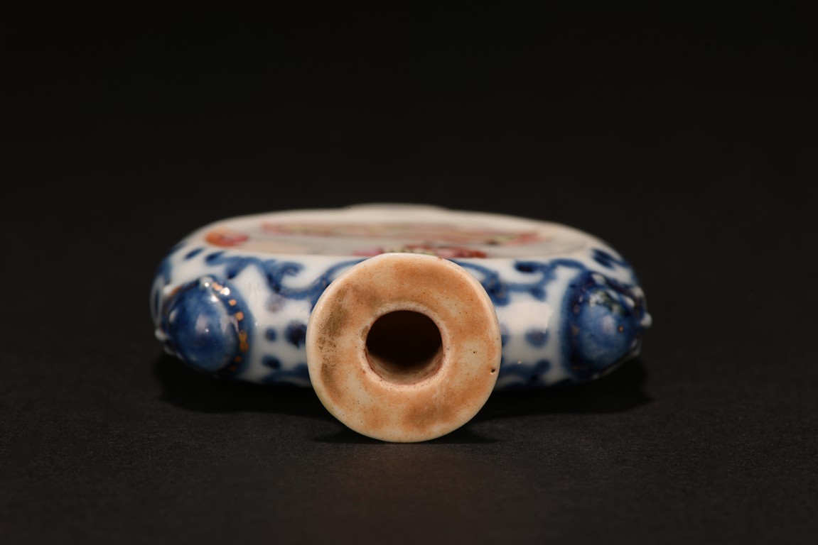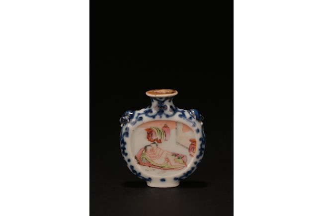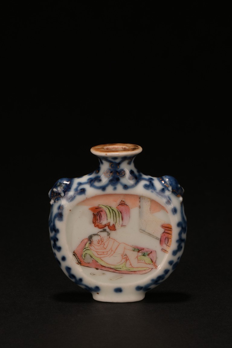 Of rounded form, enamelled with erotic scene on front and back sides, the narrow sides with blue and white scrolled foliage design, the shoulder flanked by raised beast heads, all reserved on white tone porcelain ground. Qing Dynasty period.
