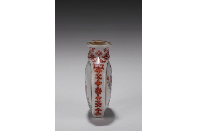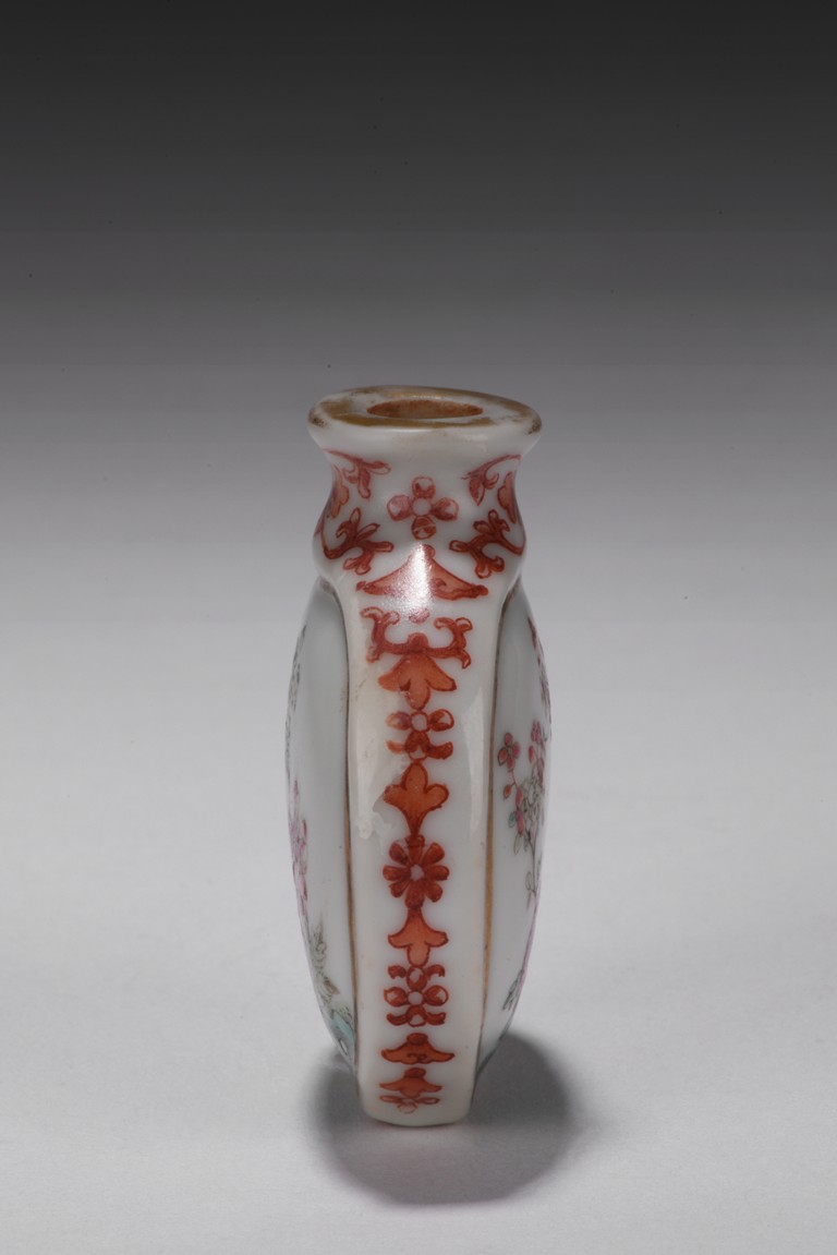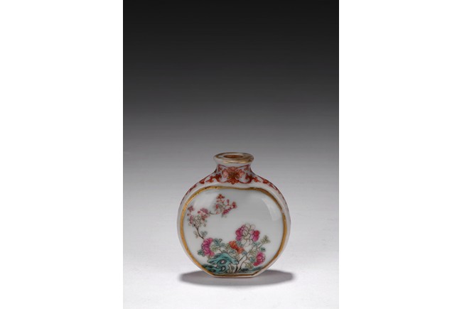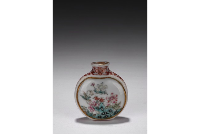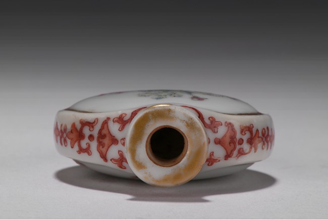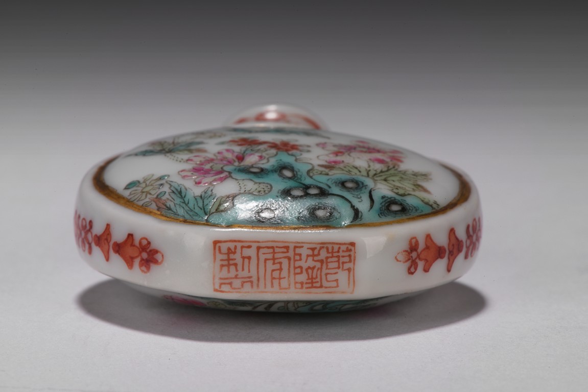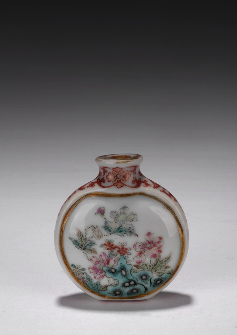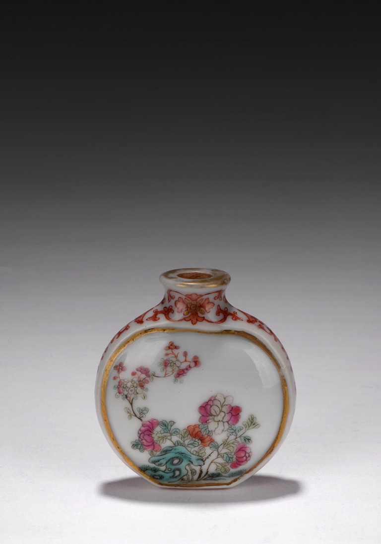 Of flattened rounded form, the front and back enamelled with colorful peony, rose and other flowers issuing from rockwork within gilt line border, the narrow sides painted with stylized flower and foliate pattern in vermilion tone, all reserved on white porcelain ground, with gilt flat rim and the base with a four character 'Qianlong Nian Zhi' mark.
