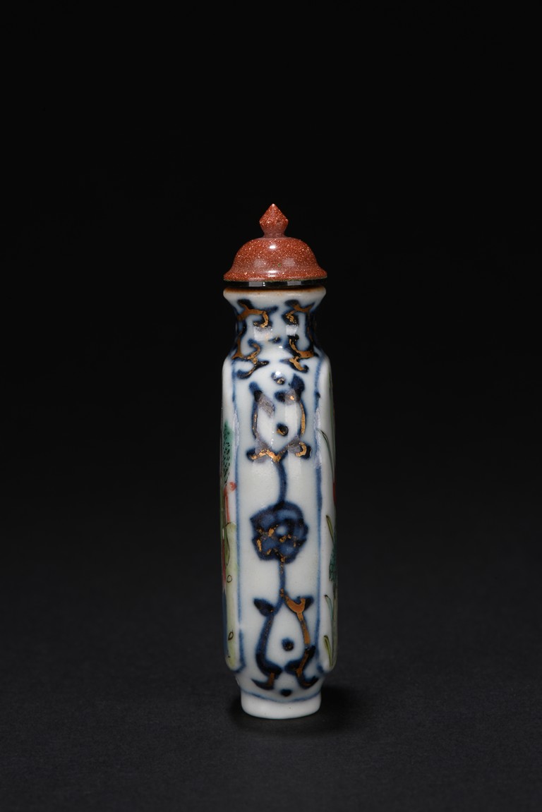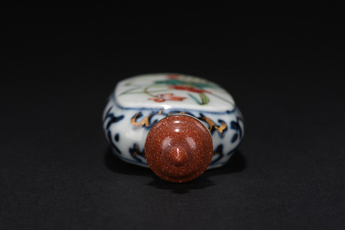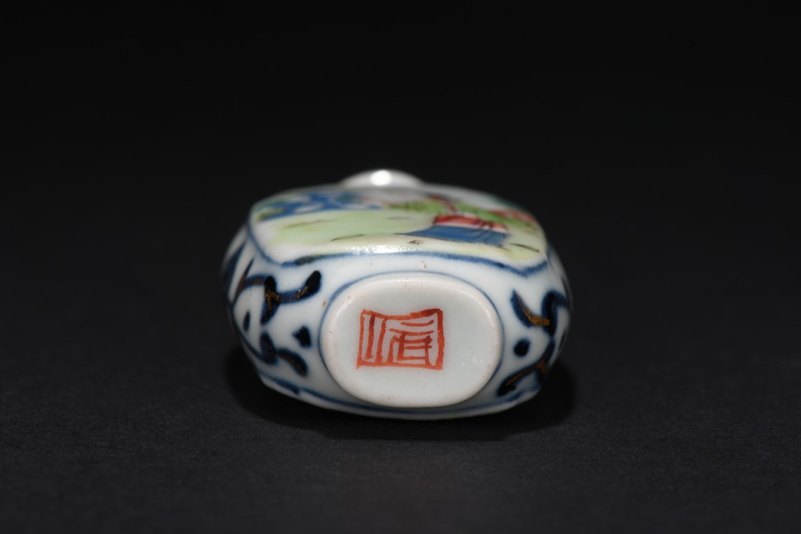 The flattened rounded rectangular body moulded to each side with a large oval panel, one enclosing a woman wearing green,red and blue robe in a mountain setting, the other enamelled with two blooming lotus and a lotus bud issuing from green lotus leaves and stalks, the narrow sides with stylized blue pattern decorated with gilt lines.