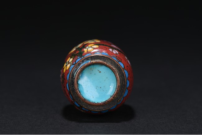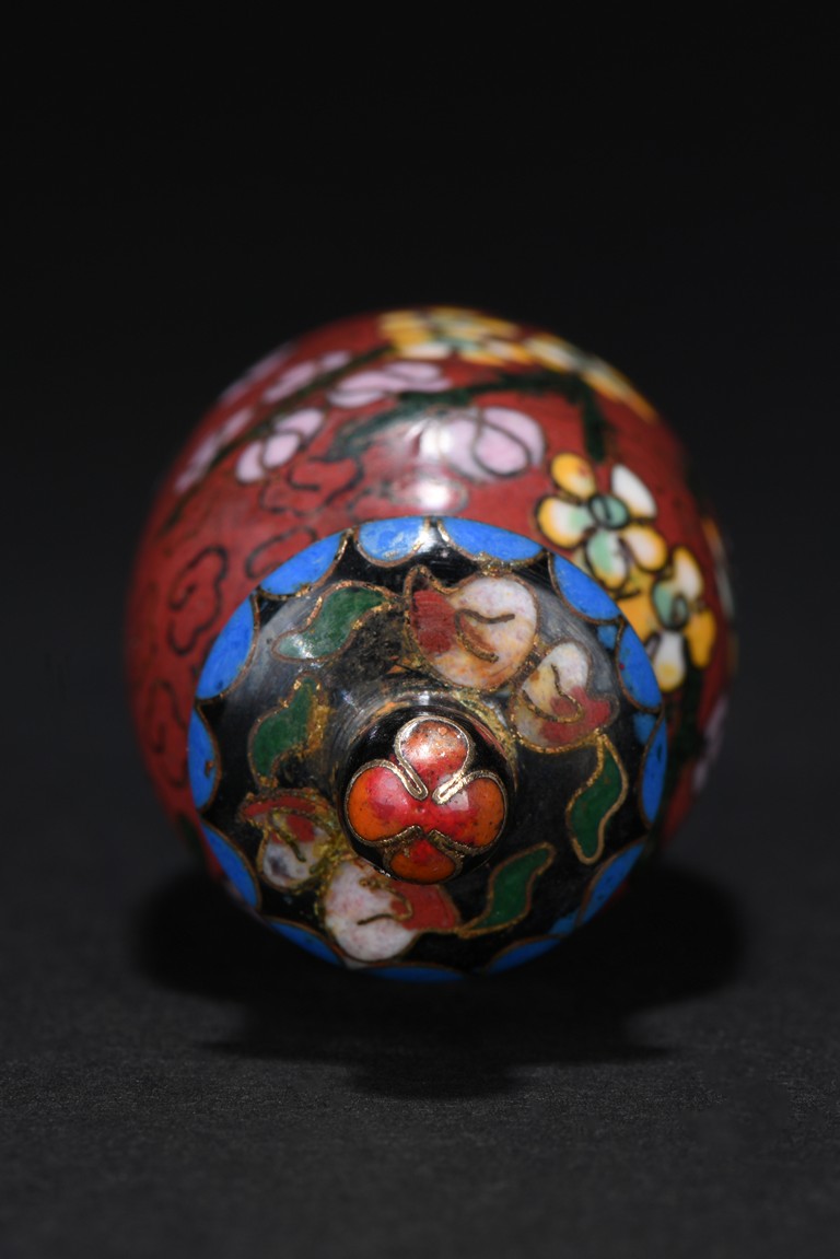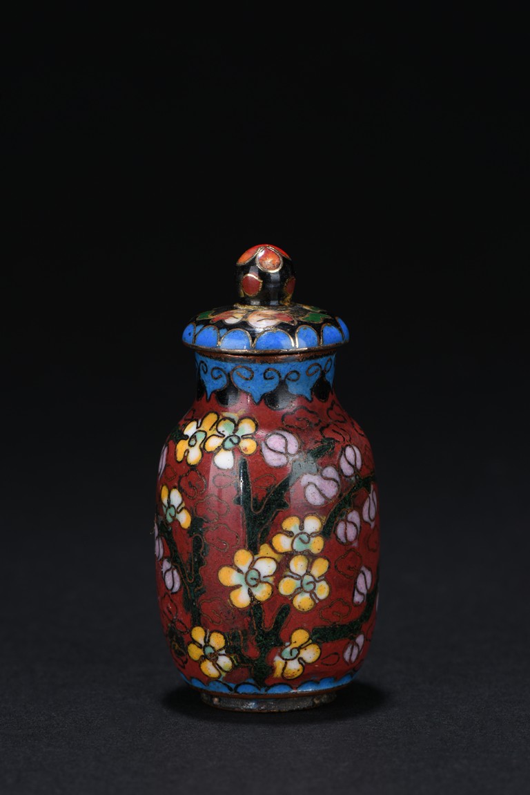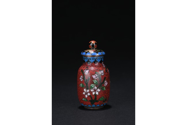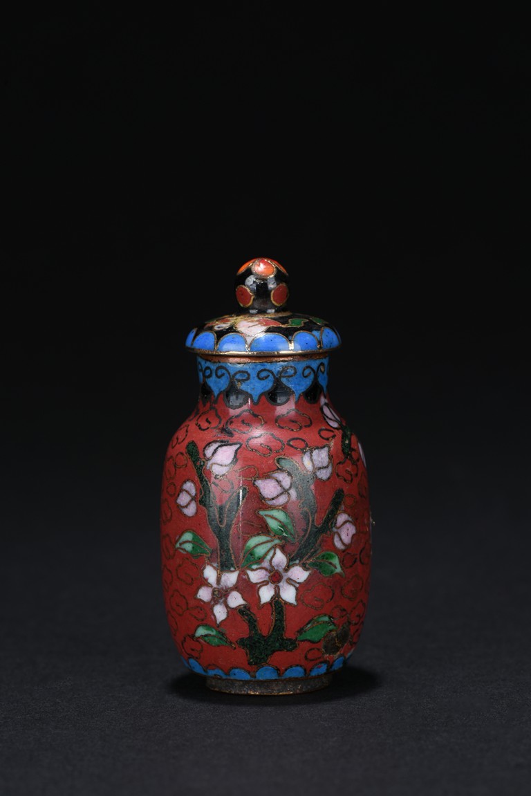 Of rounded cylindrical form, enameled with scattered blossoming plum flowers in various design over the dark red ground, with matching stopper surmounted with a red flower finial.